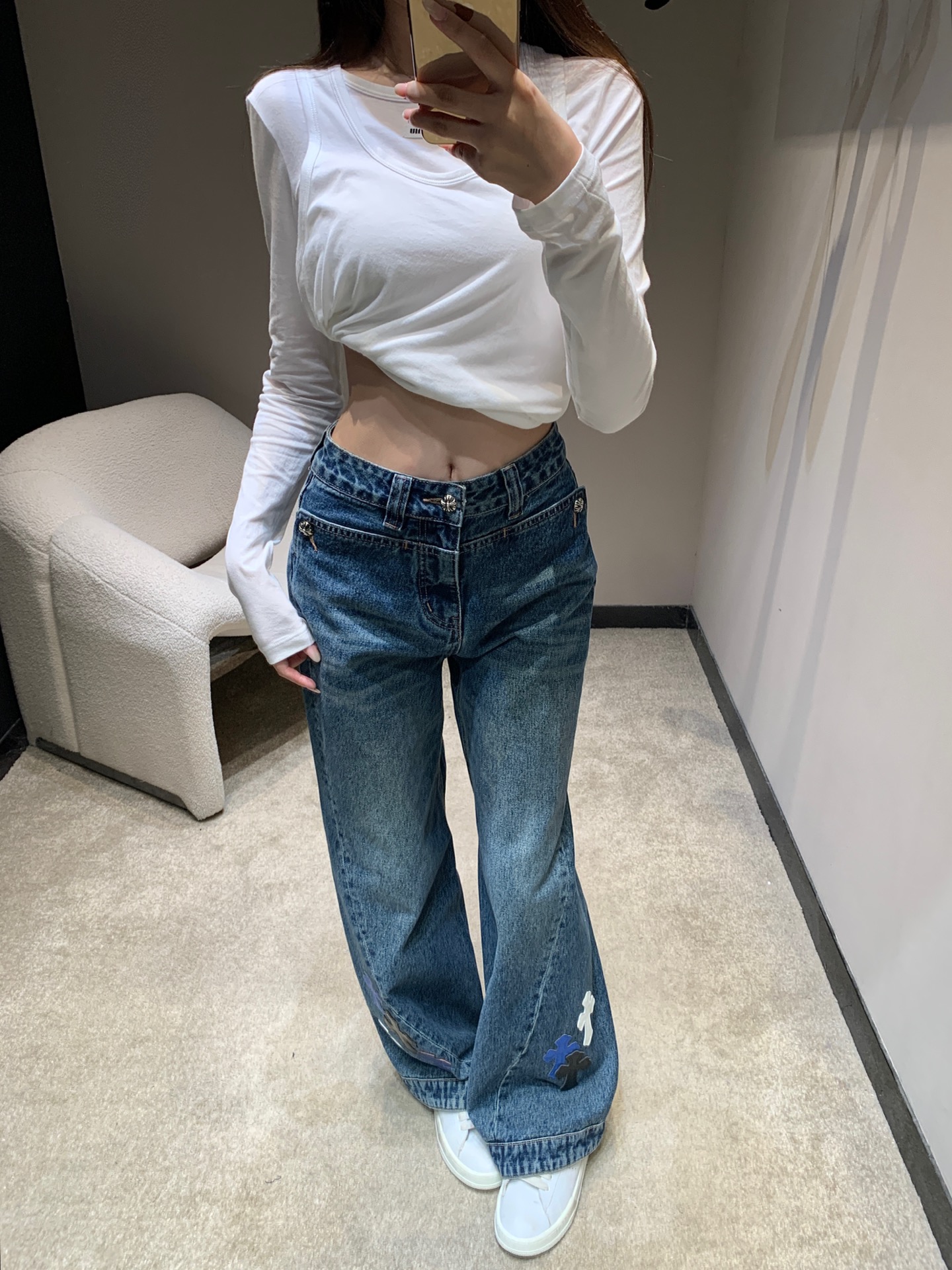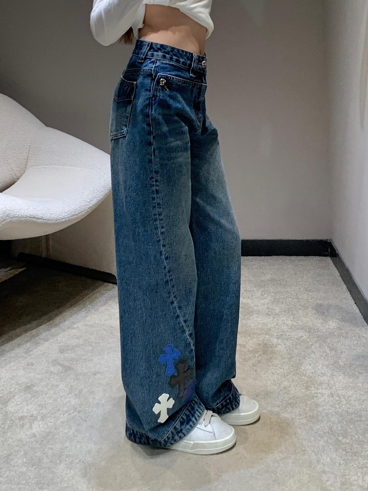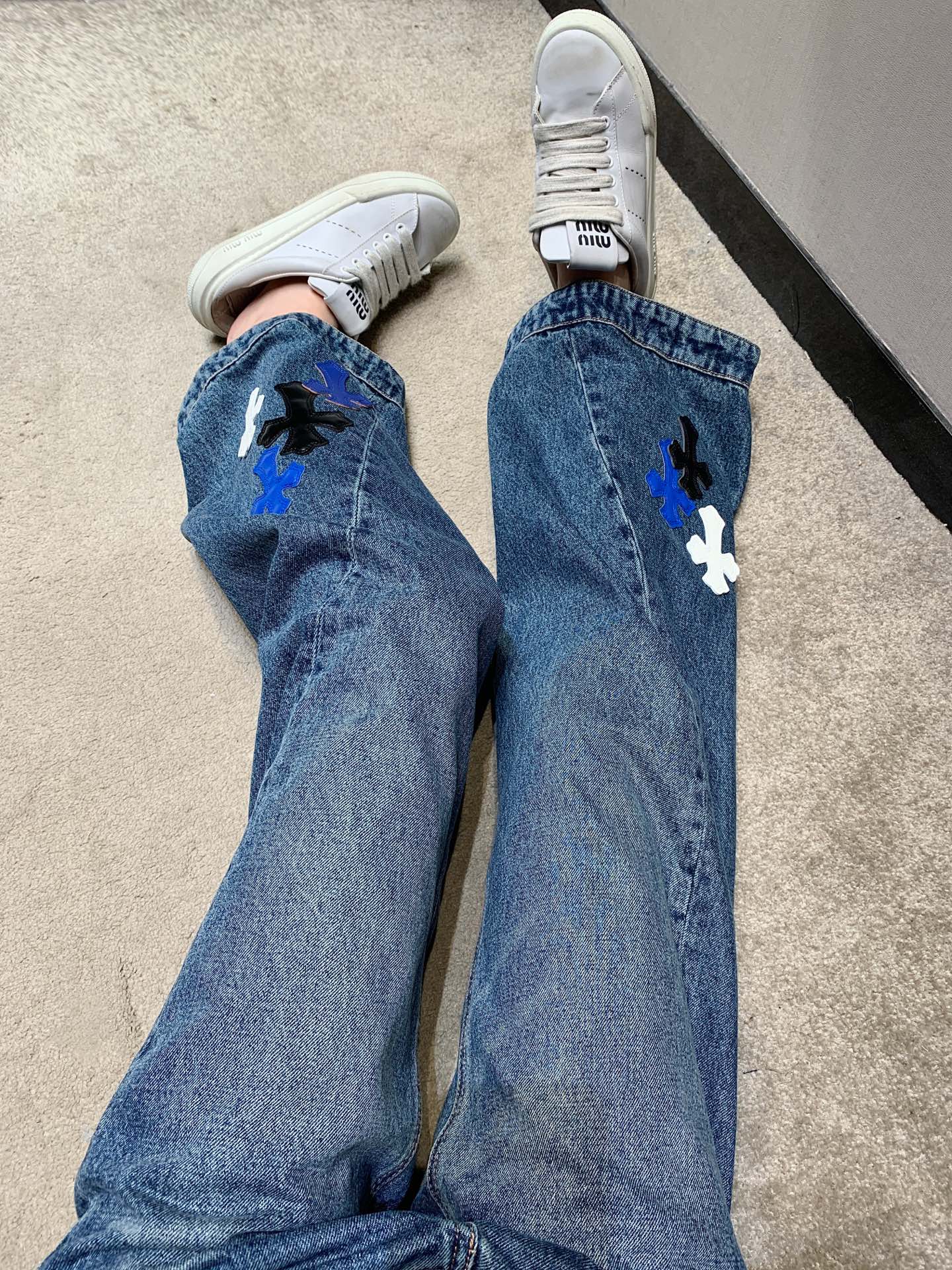Elevate your wardrobe with these stylish Chrome Hearts jeans. Featuring a unique cross patchwork design and a comfortable wide-leg fit.