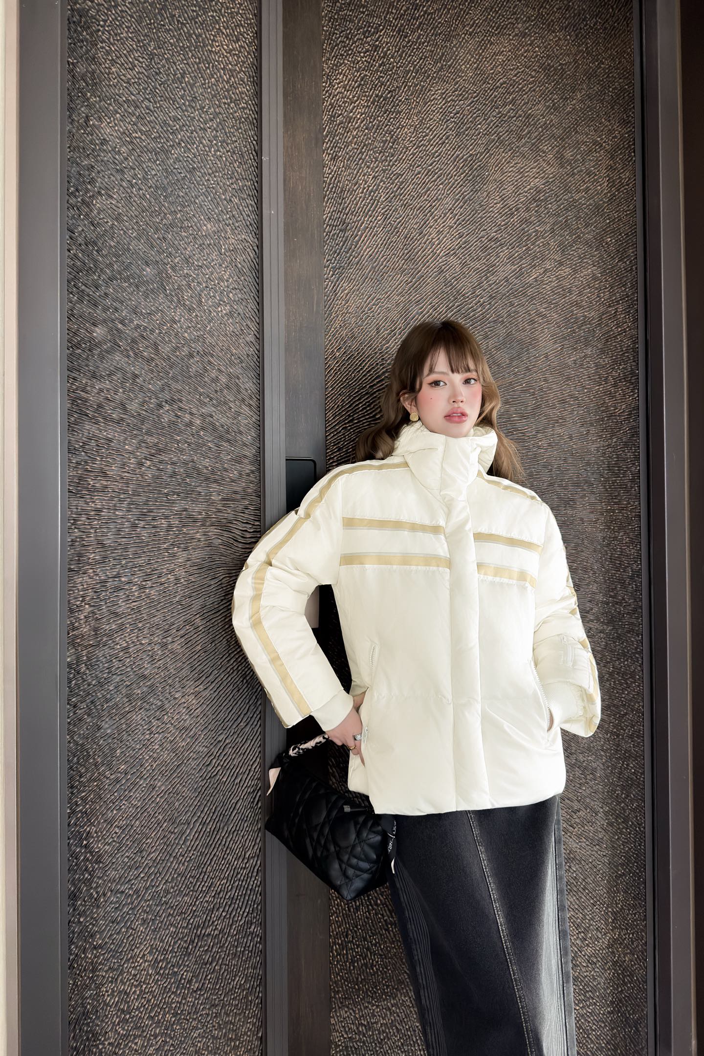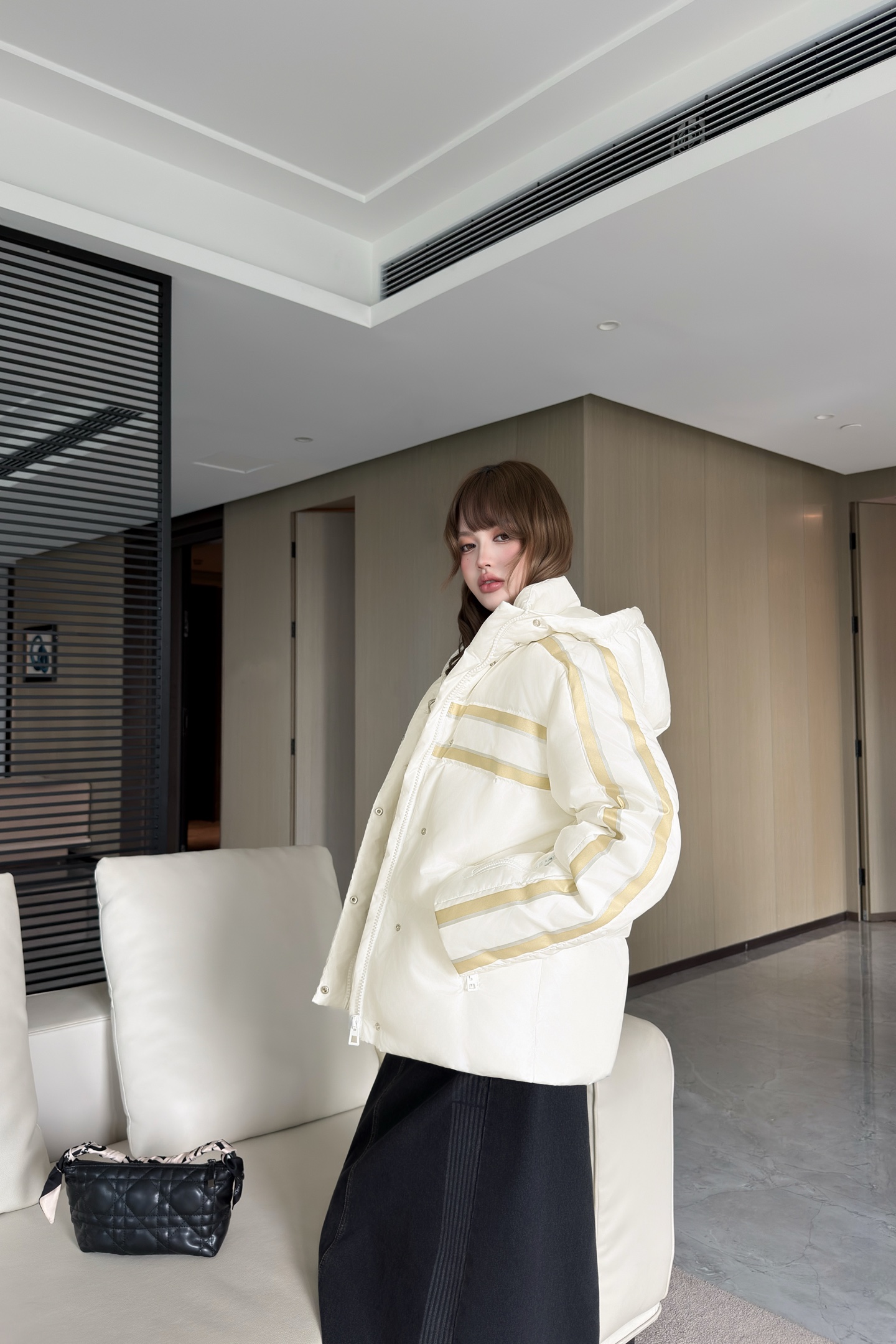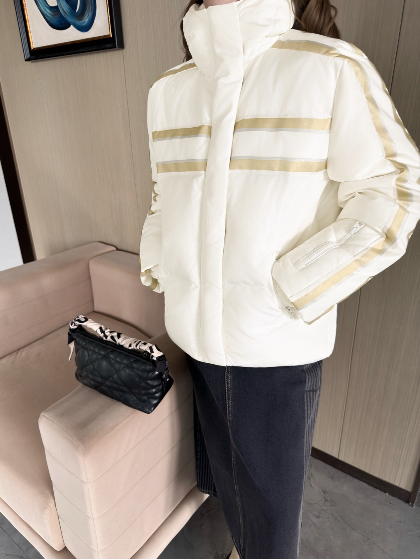 Stay warm and stylish with this D white duck down puffer jacket. Featuring golden stripes and star logo, it's perfect for casual or dressed-up looks.