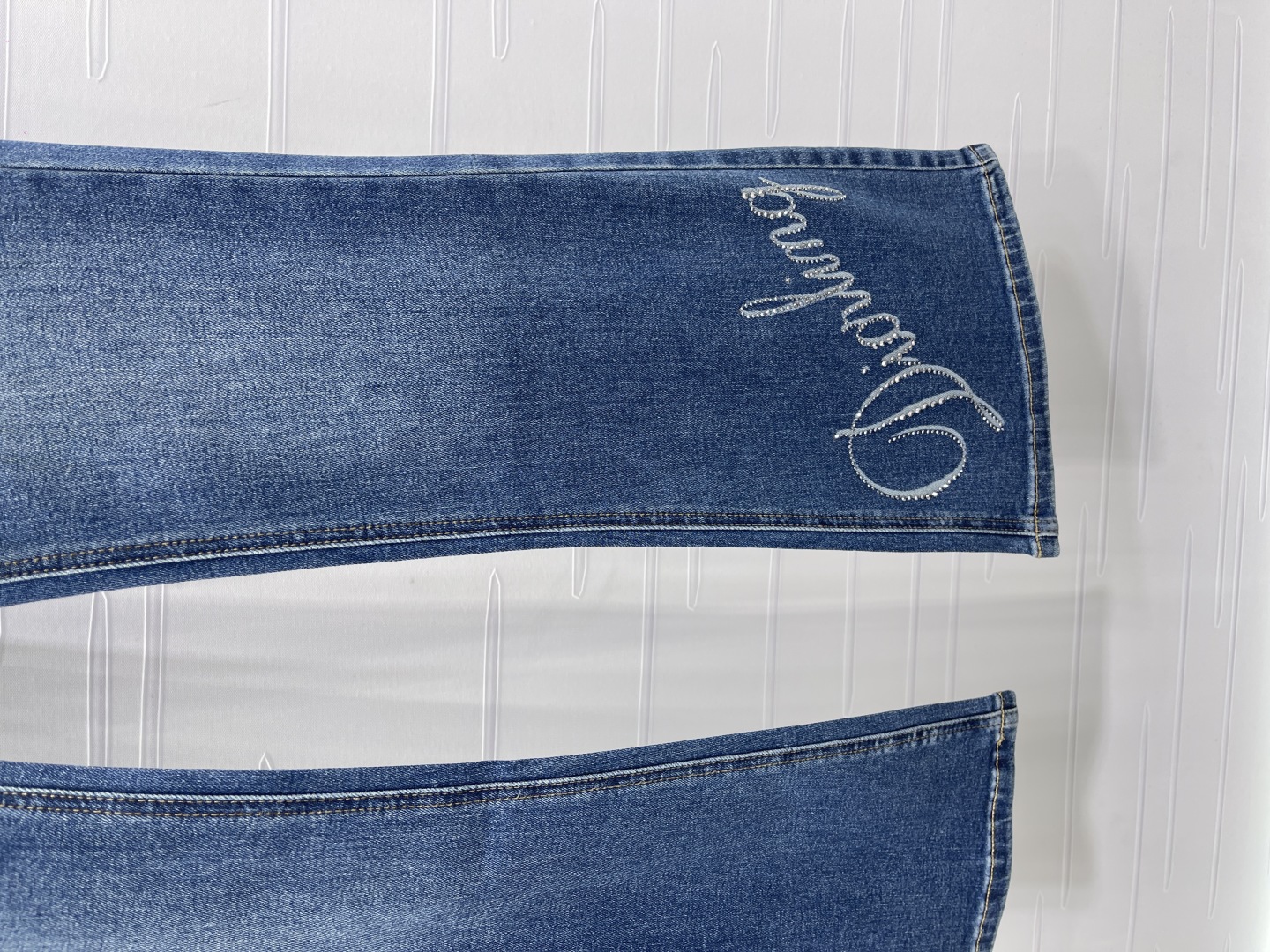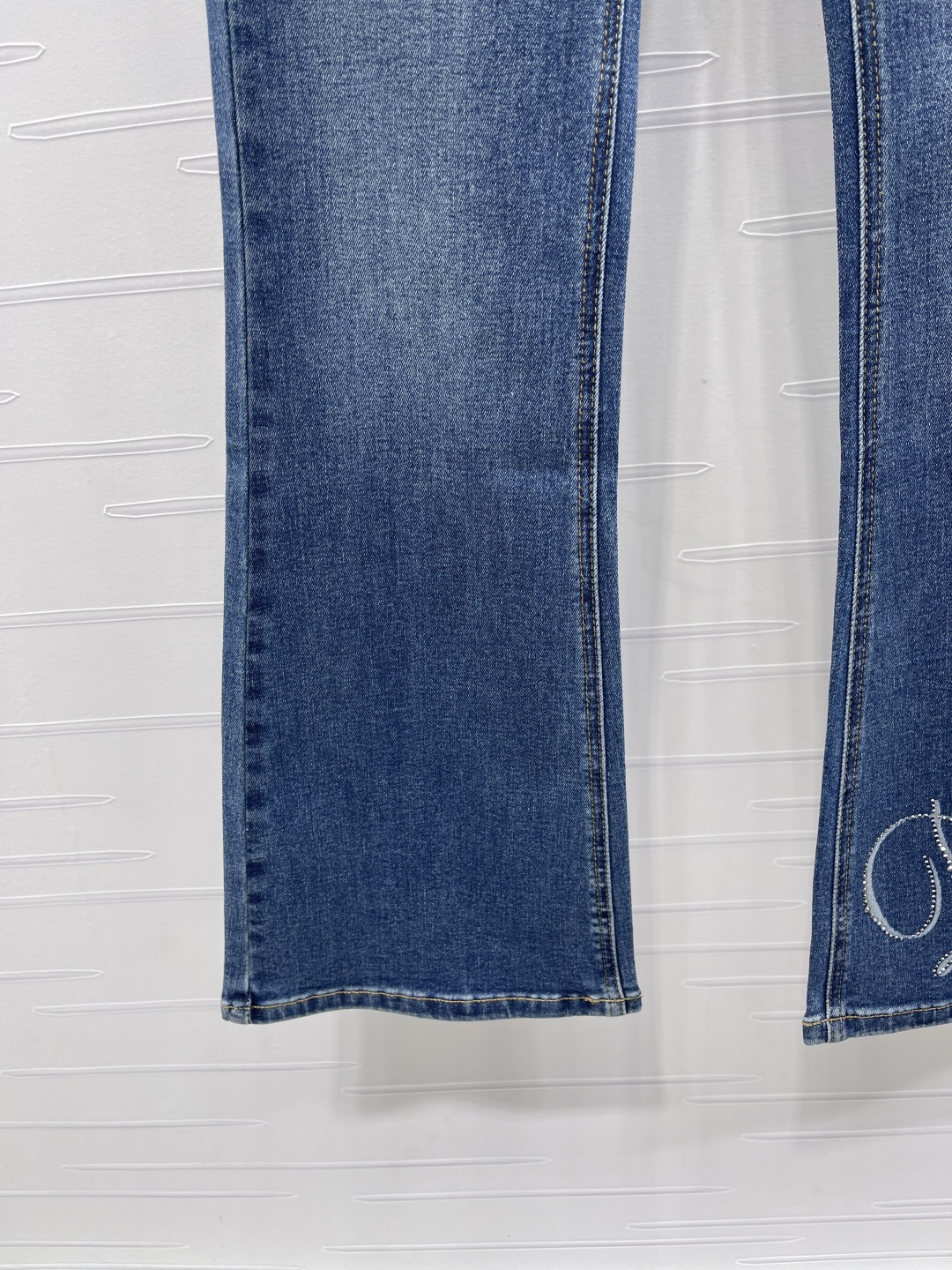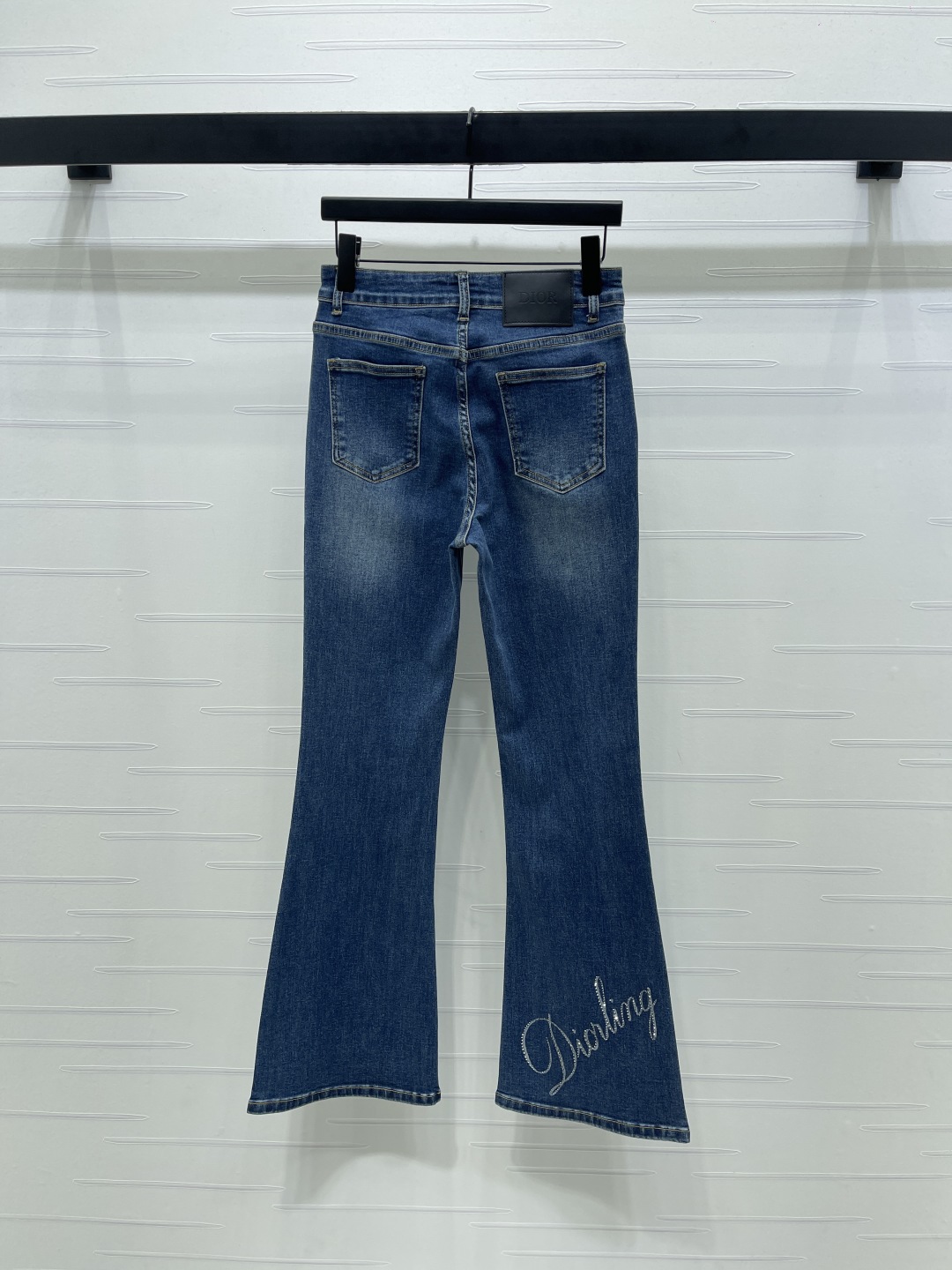Tags: Cotton Denim Jeans, Designer Flare Jeans, Dior Denim Trousers, High Waisted Flare Jeans, Rhinestone Logo Jeans, Vintage Style Jeans
