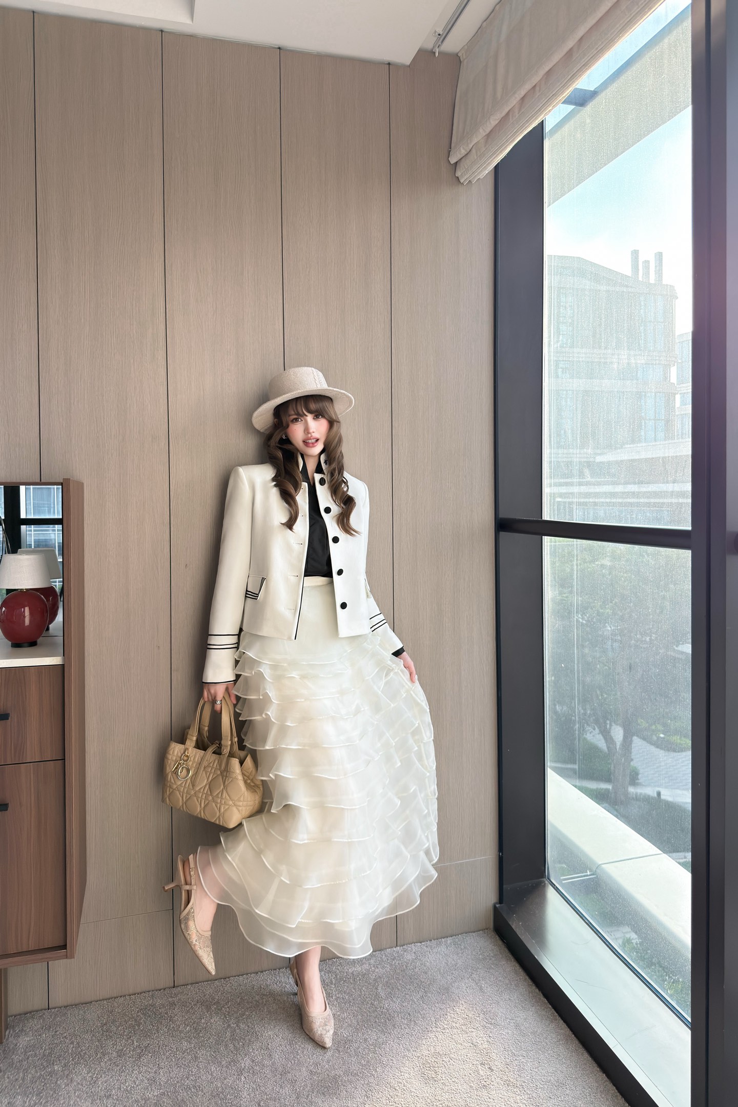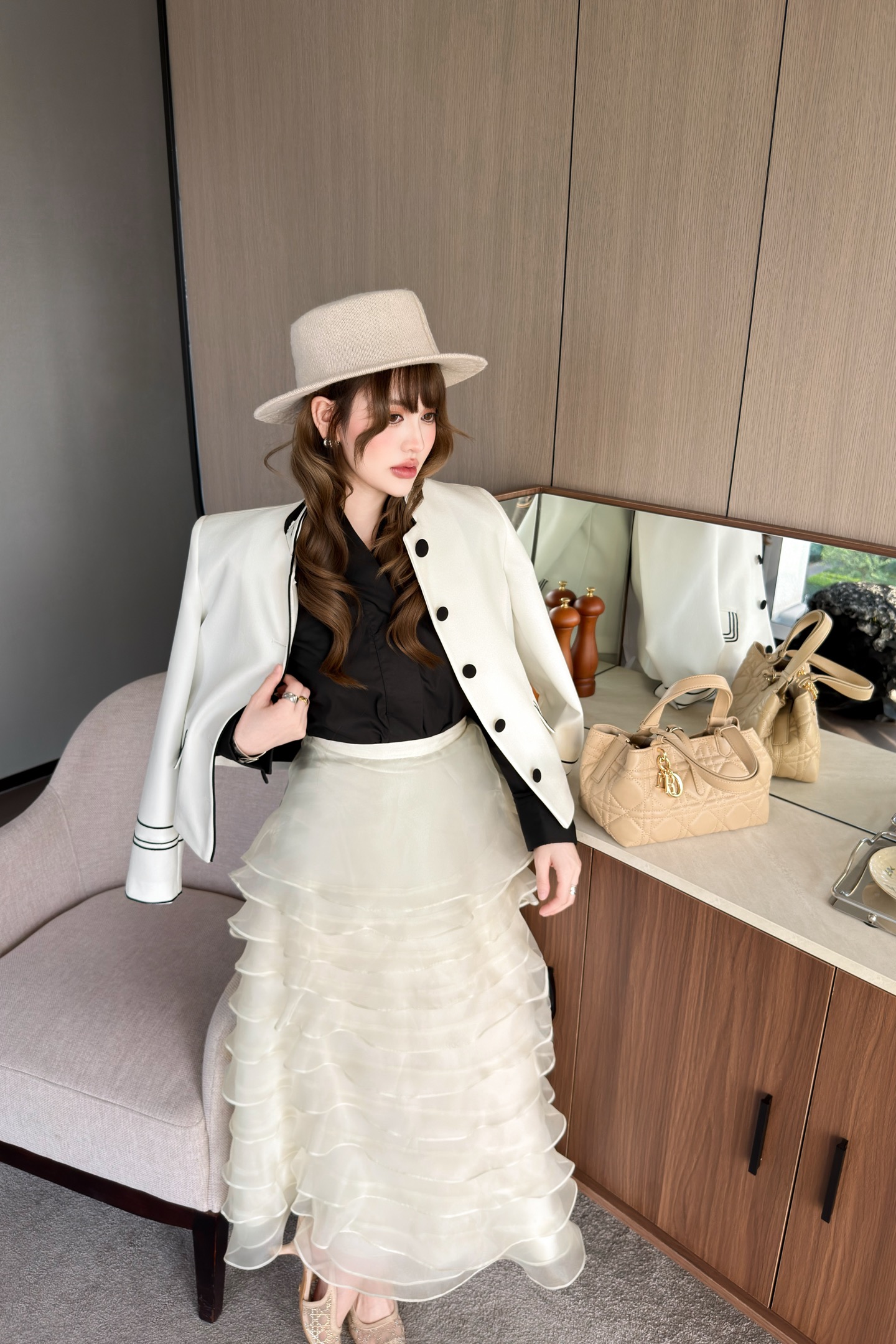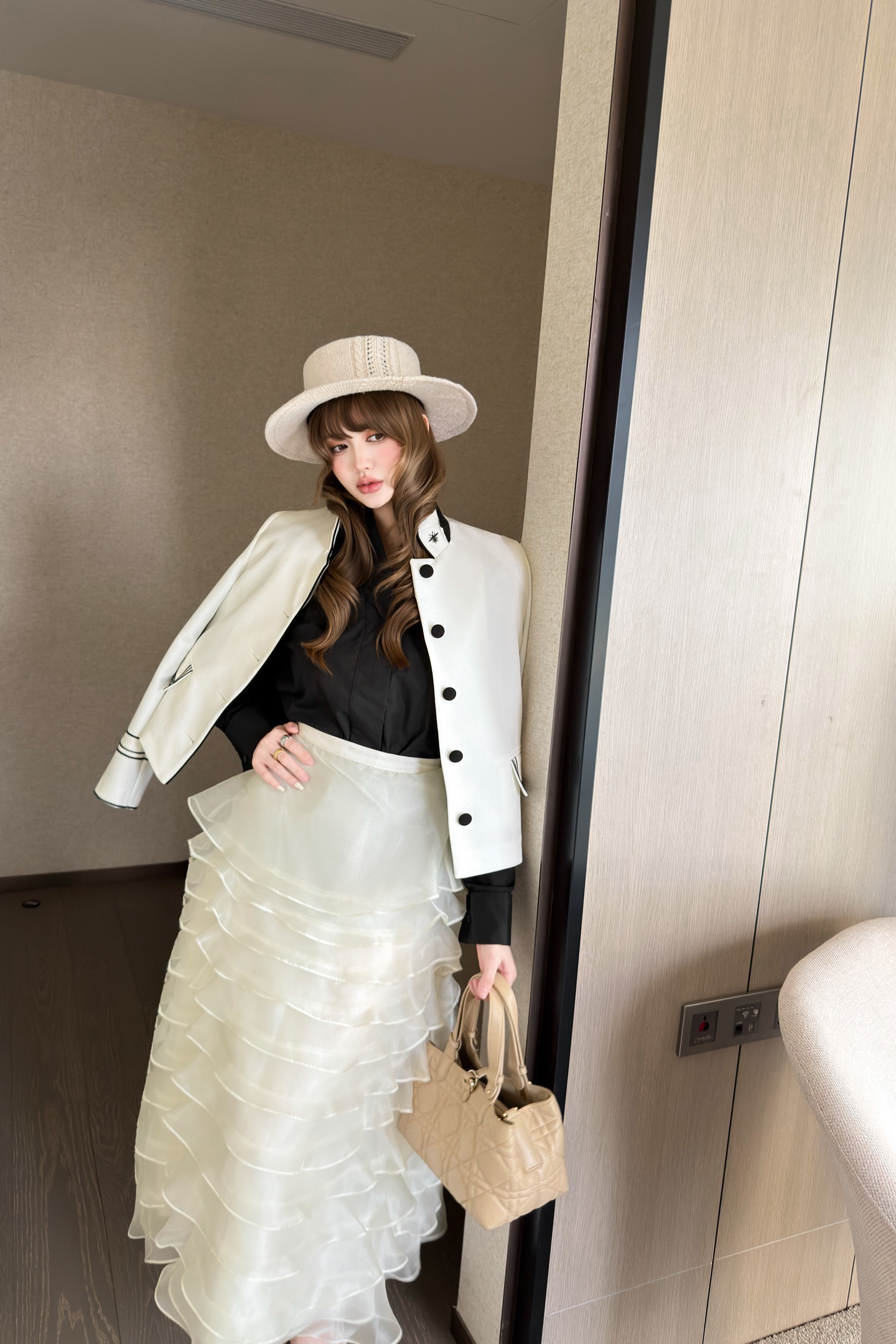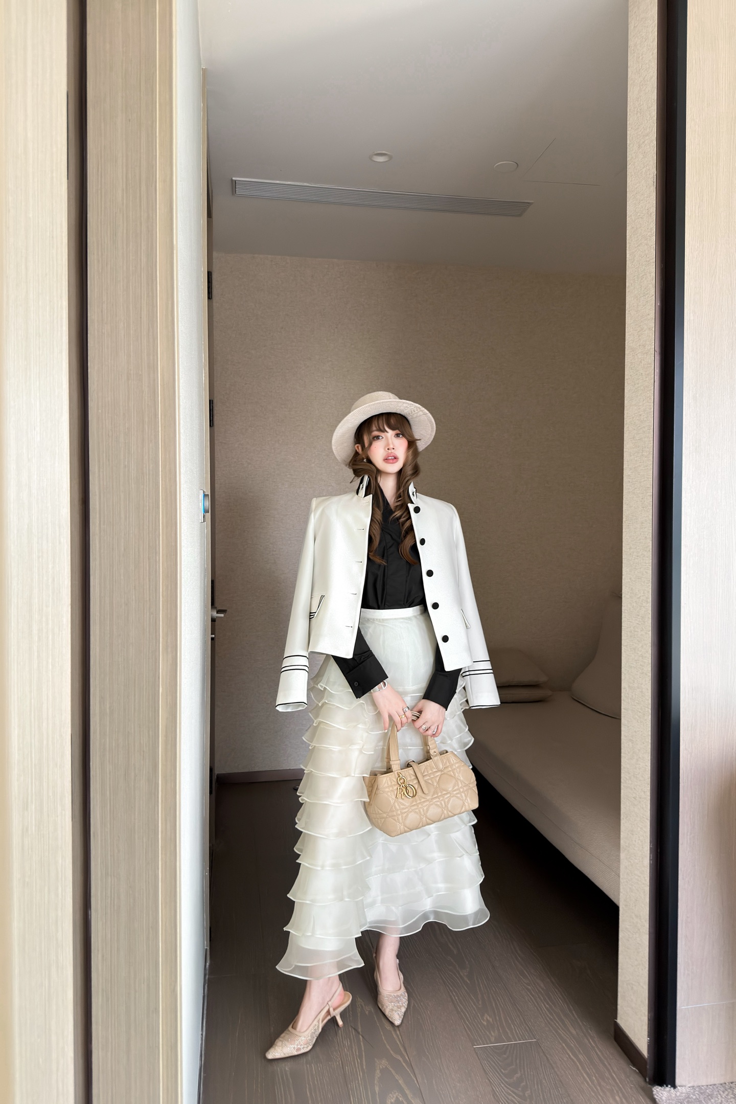 Elevate your wardrobe with this Dior-inspired high-waisted skirt. Featuring tiered ruffles, a flattering A-line silhouette, and a comfortable lining.