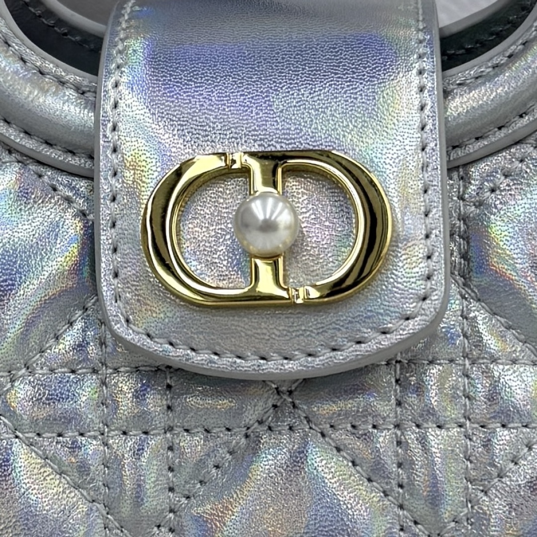 Elevate your style with the Dior Jolie mini bag, featuring silver lambskin, Cannage stitching, and a pearl-accented CD signature. Versatile for day or night.
