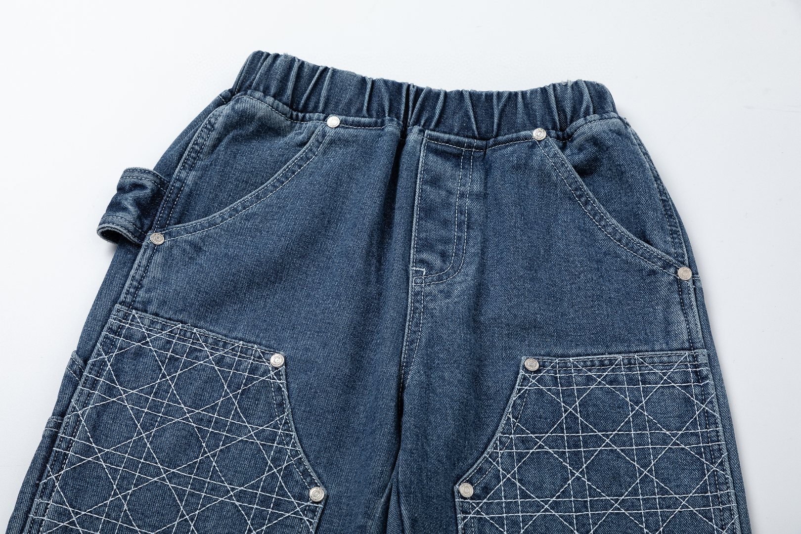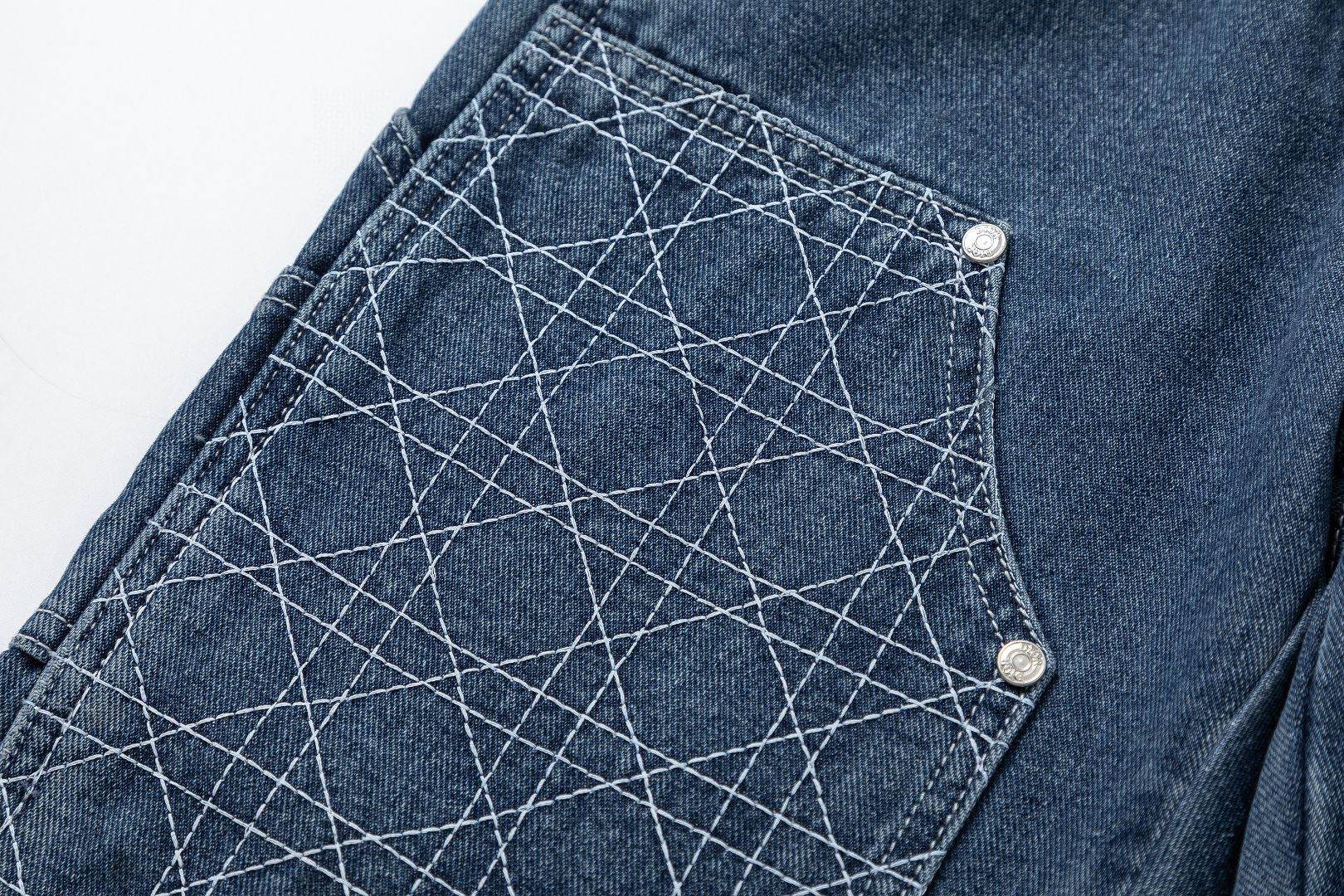 Stylish Dior kids' denim jeans featuring the iconic Cannage pattern. Made from comfortable cotton denim, perfect for a trendy street style look.