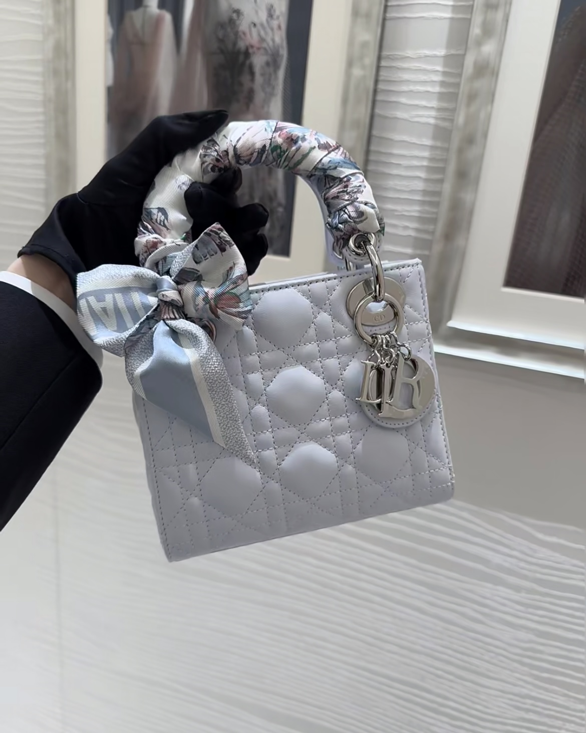 Indulge in the timeless elegance of the Lady Dior mini bag. Glacier blue lambskin with silver hardware offers a classic look. A limited edition must-have!