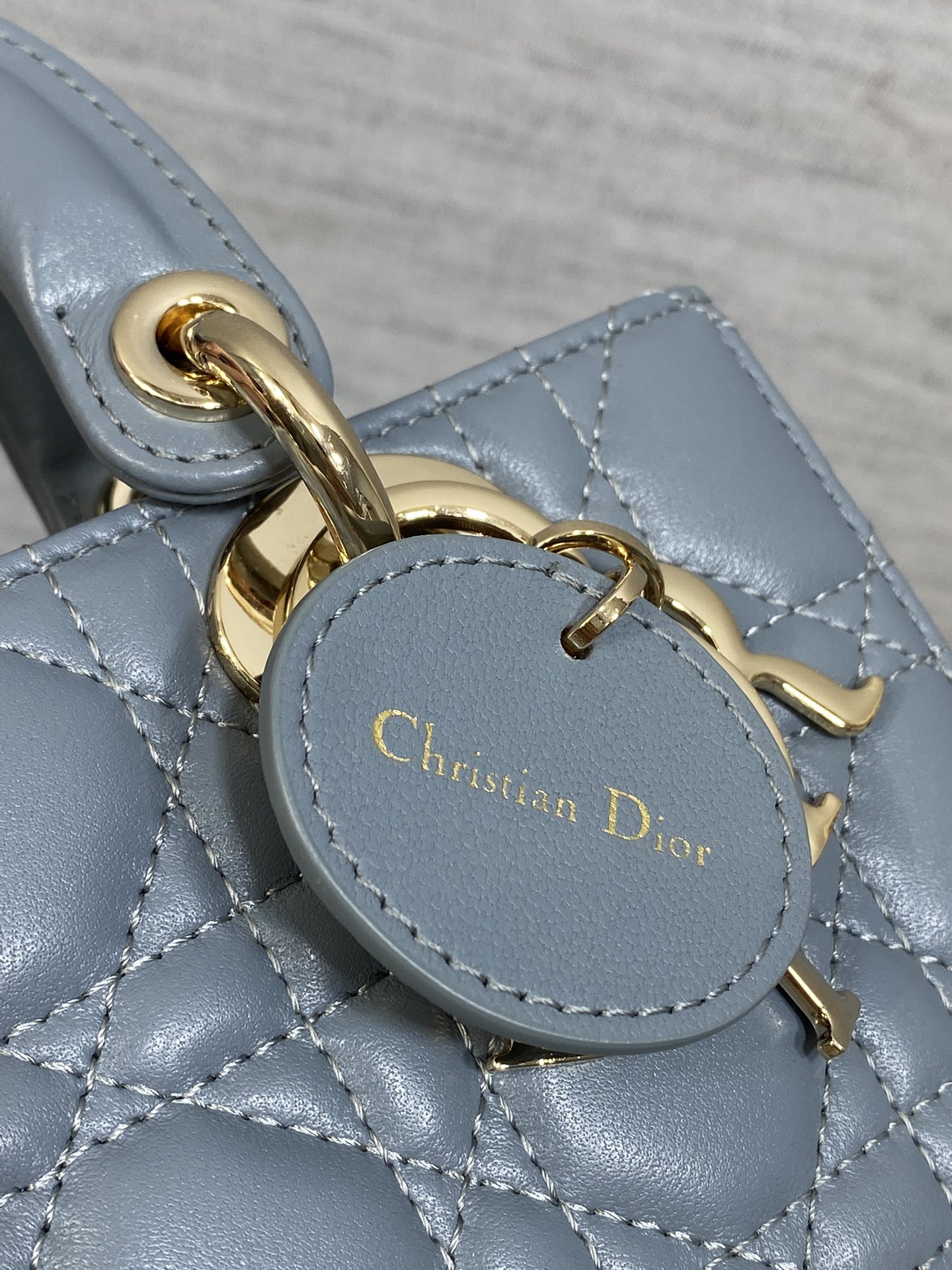 Discover the Lady Dior mini bag. Sky blue lambskin with iconic Cannage stitching and gold hardware. Perfect for daily use.