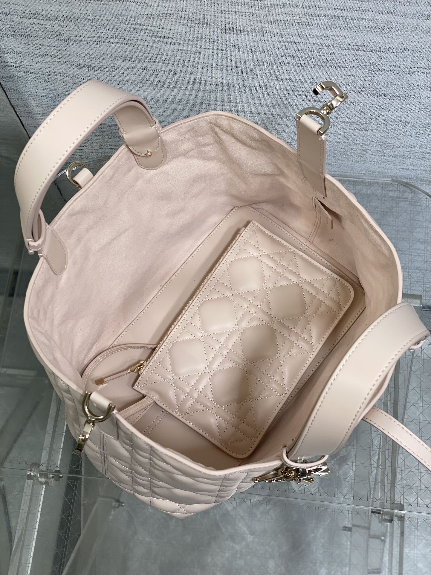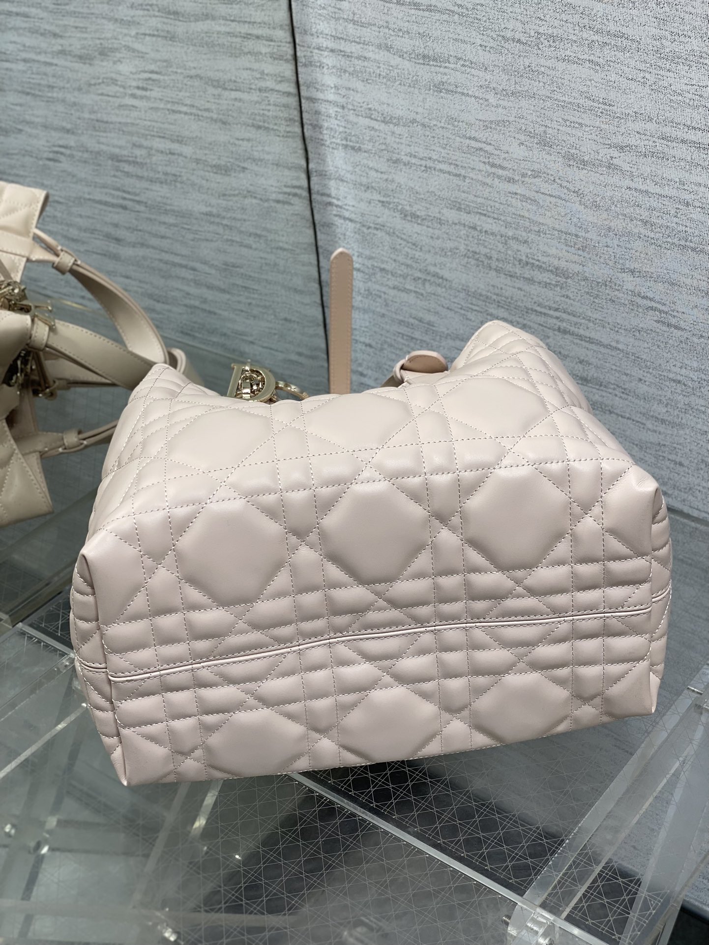 Chic Dior Toujours bag. Blush pink lambskin, diamond pattern, and gold hardware. Spacious interior with a unique foldable design.