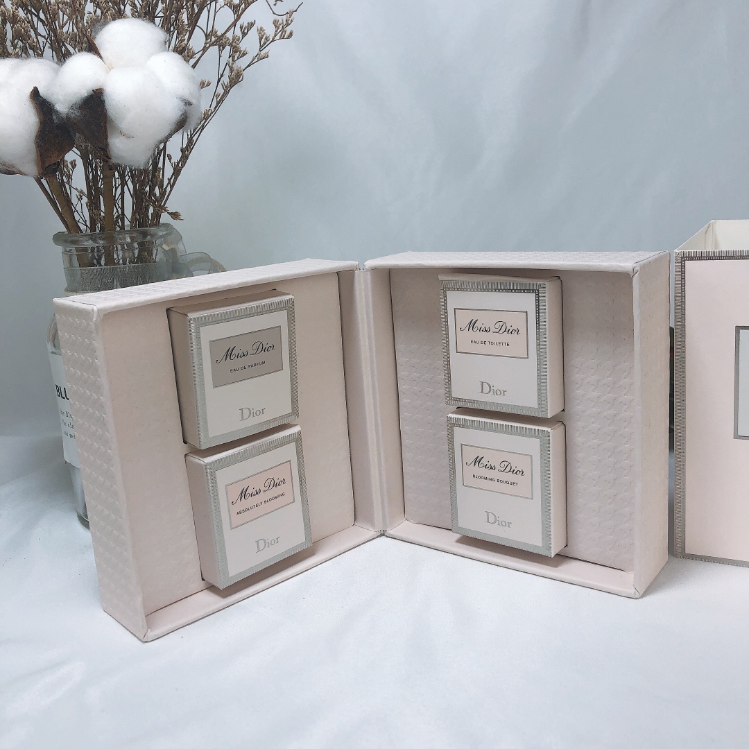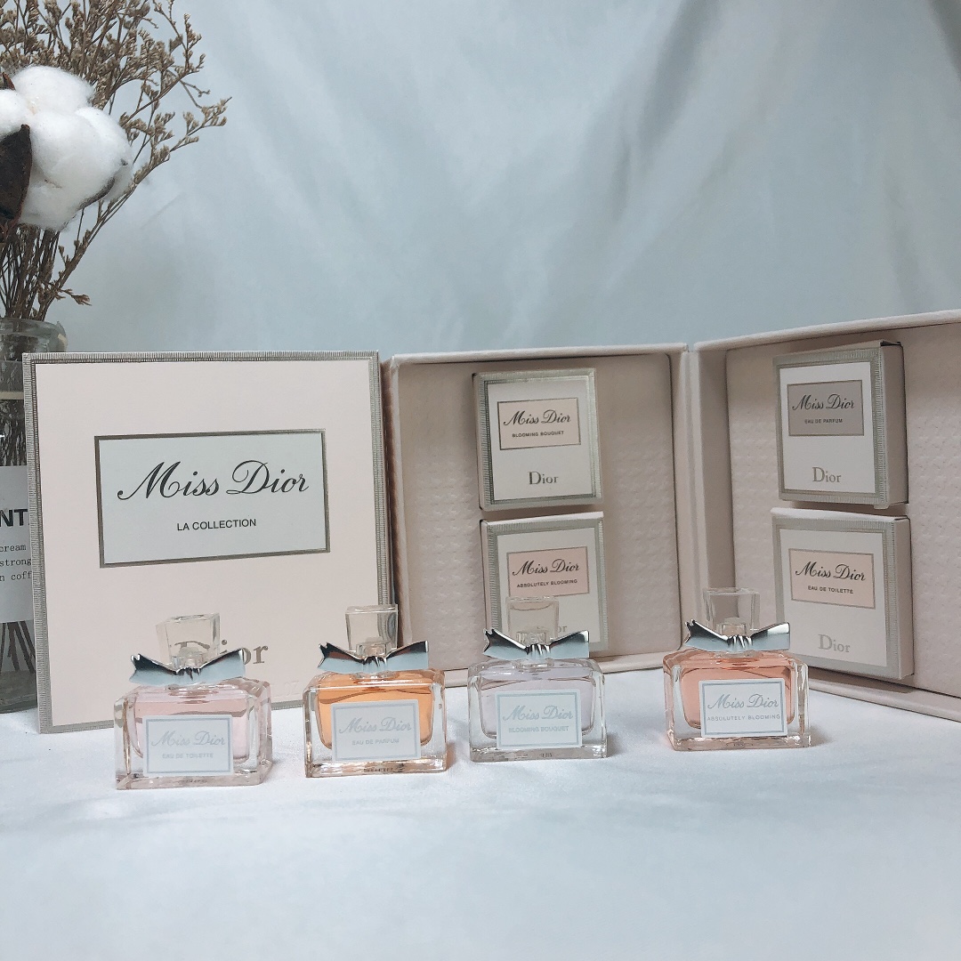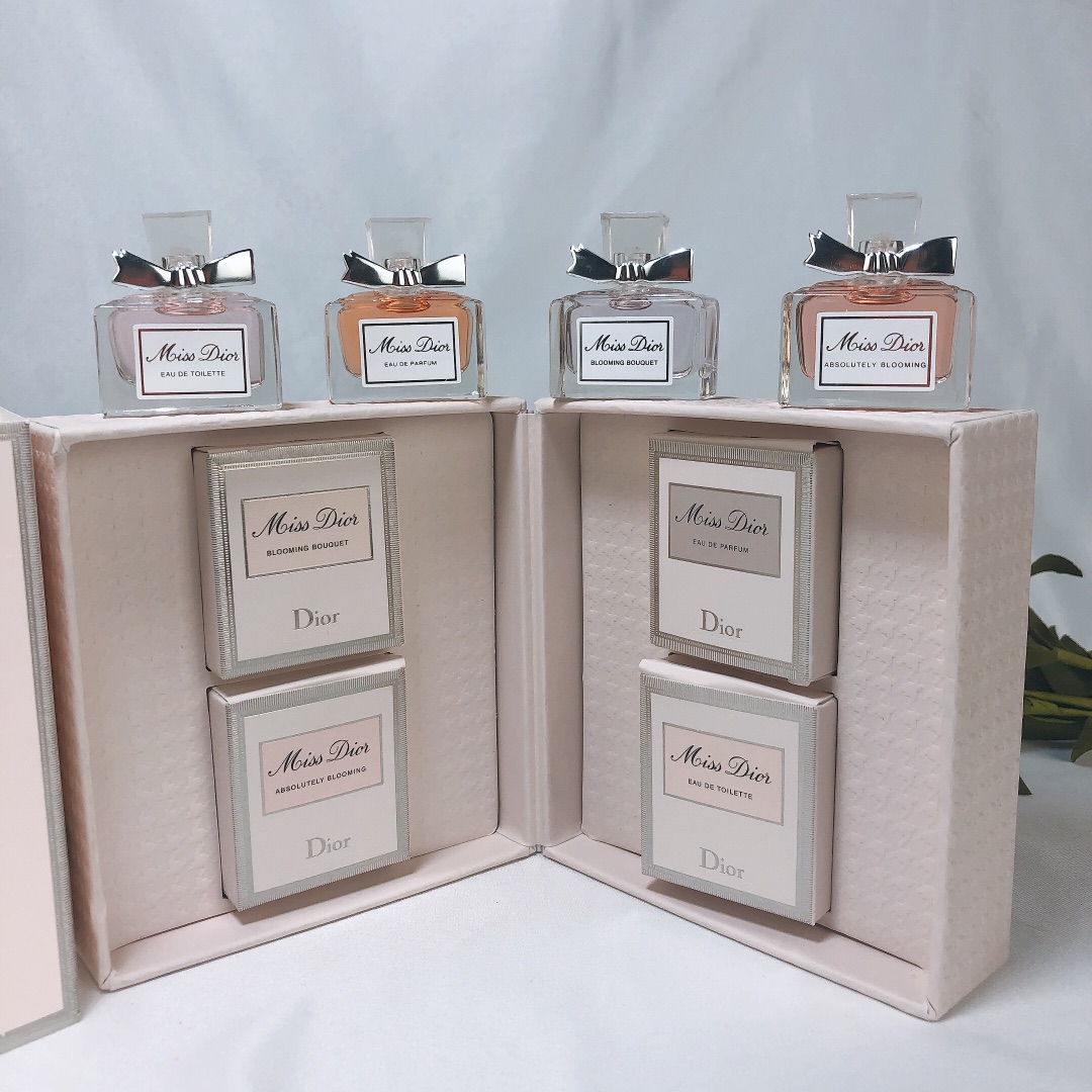 - Includes four miniature perfumes: Miss Dior EDT, Miss Dior Blooming Bouquet, Miss Dior EDP, and Miss Dior Absolutely Blooming.