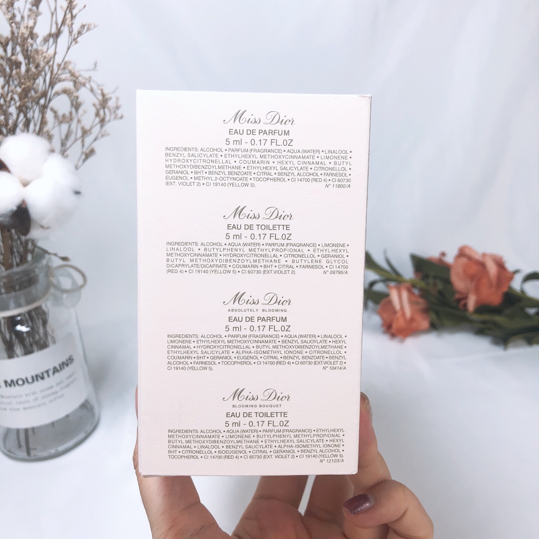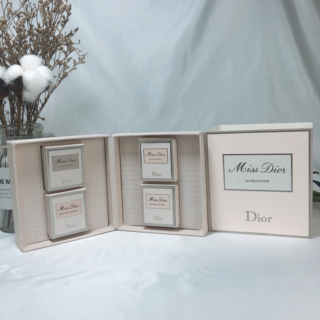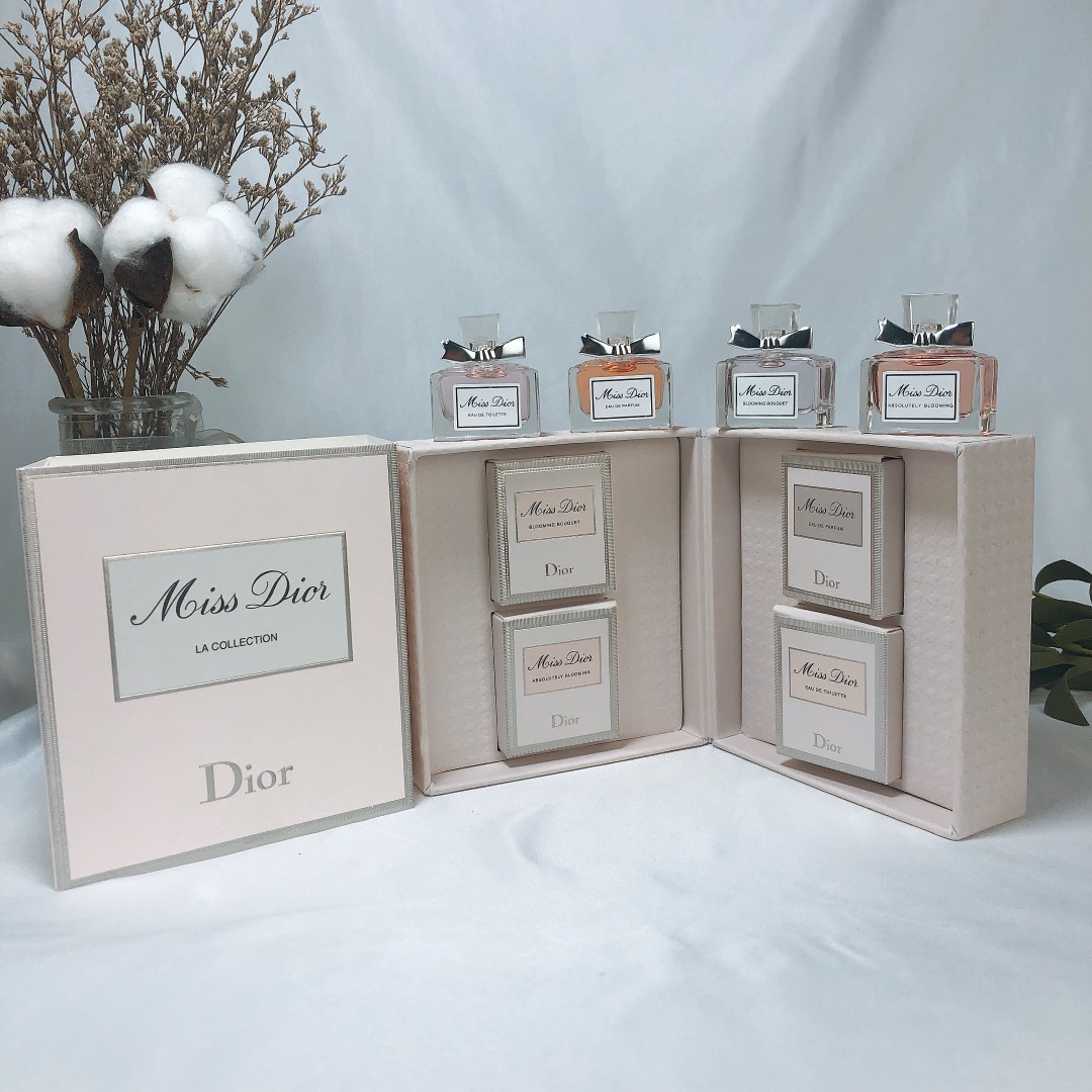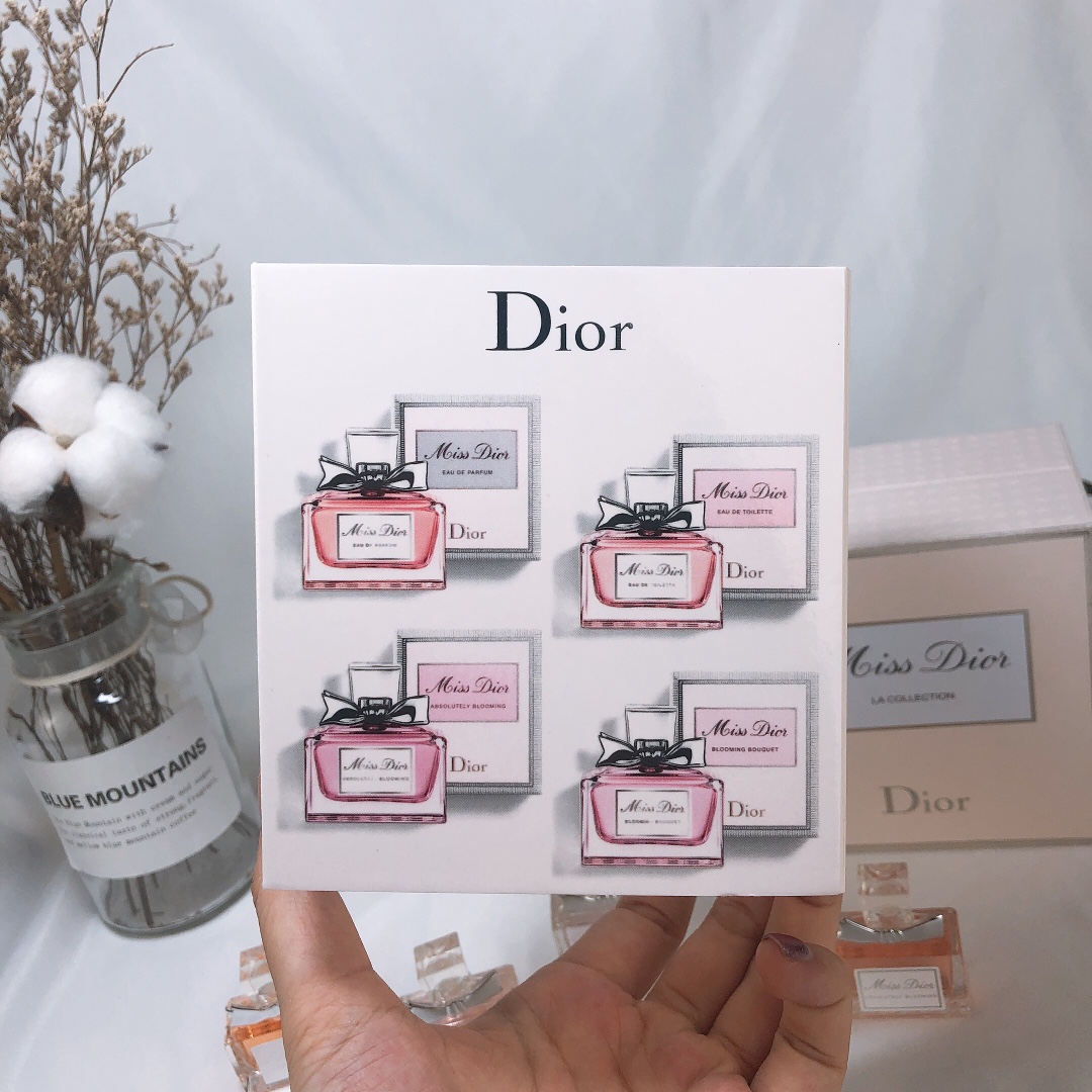 - Includes four miniature perfumes: Miss Dior EDT, Miss Dior Blooming Bouquet, Miss Dior EDP, and Miss Dior Absolutely Blooming.