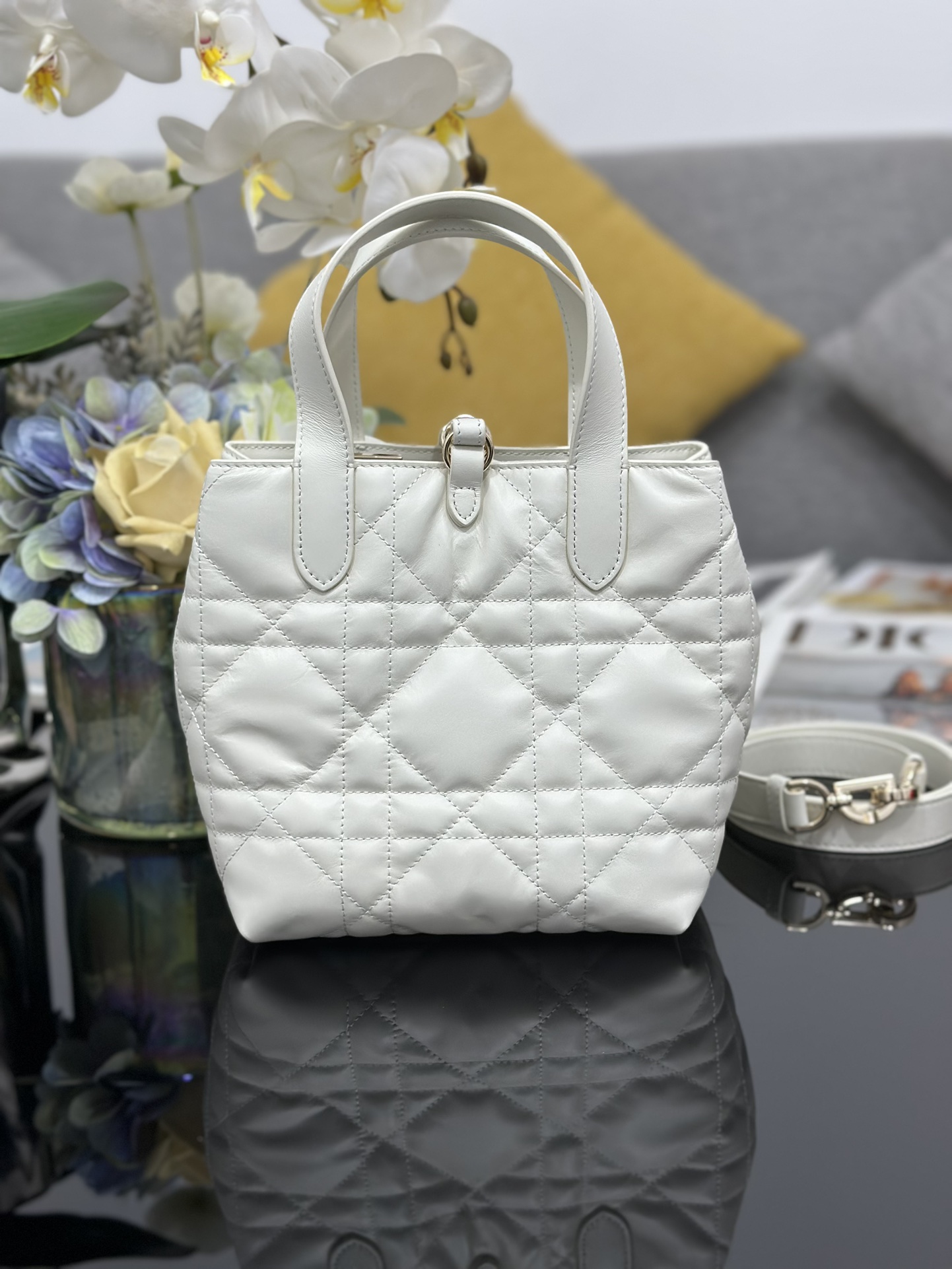Chic Dior Toujours small tote in white calfskin with oversized Cannage stitching and 'CD Lock' clasp. Includes detachable strap.