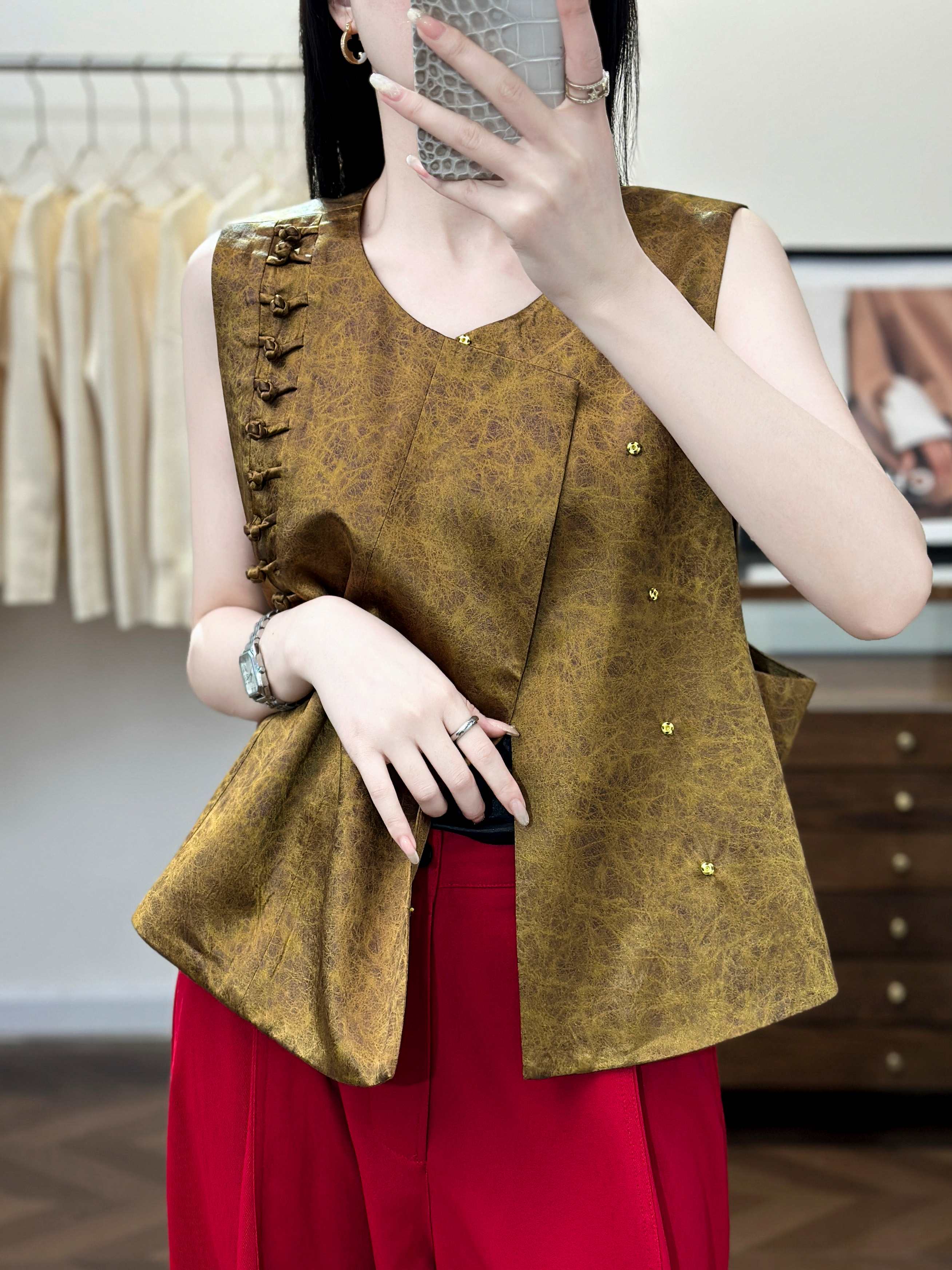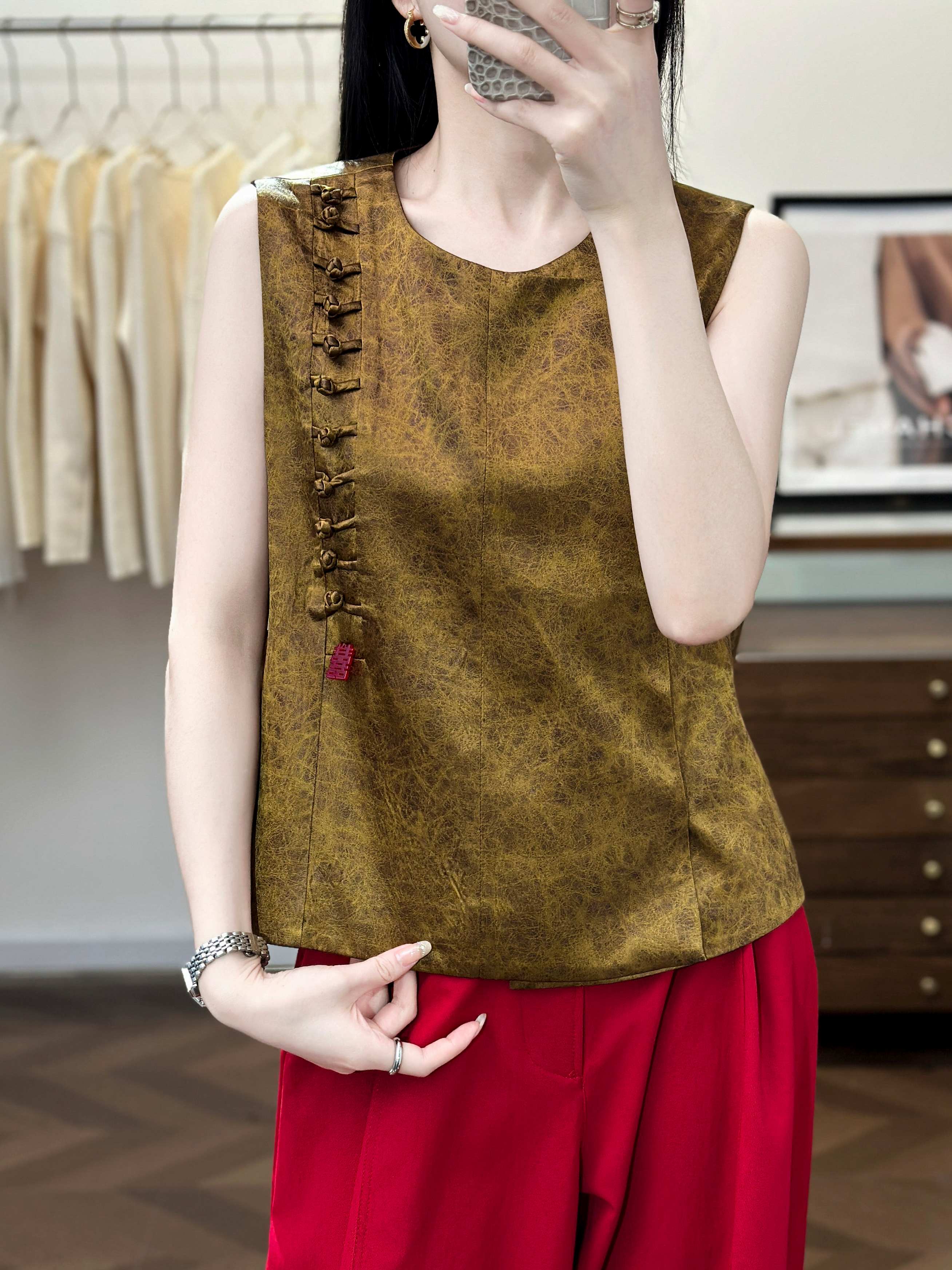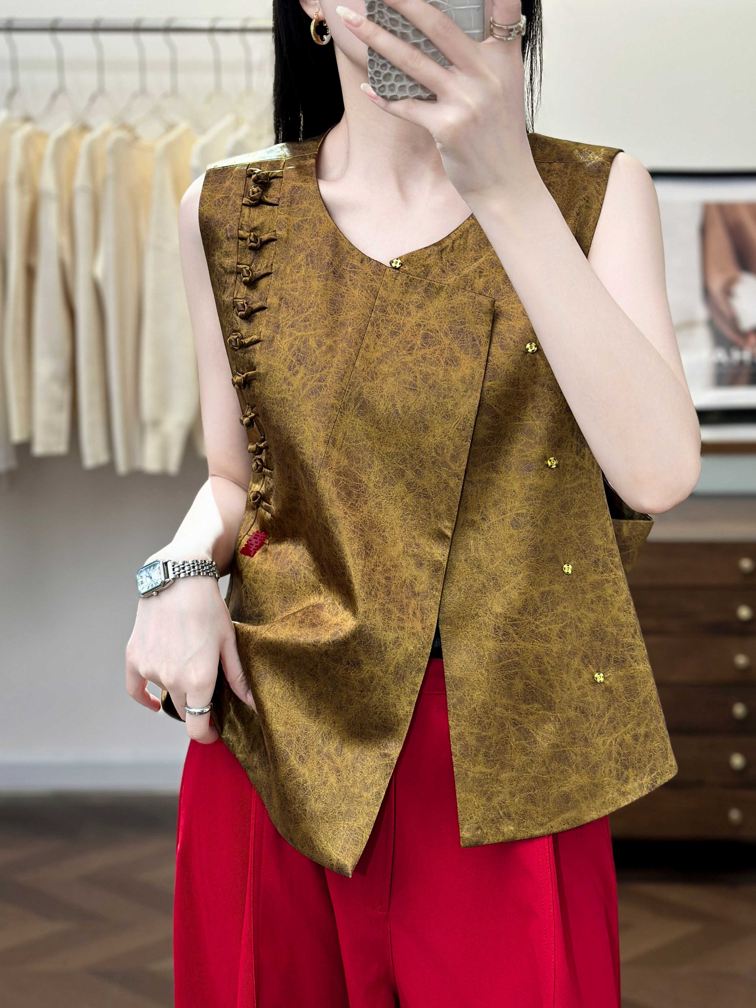 This exquisite jacquard sleeveless vest blends vintage charm with contemporary style. The unique oblique placket design and traditional frog closures add an authentic touch to any outfit.