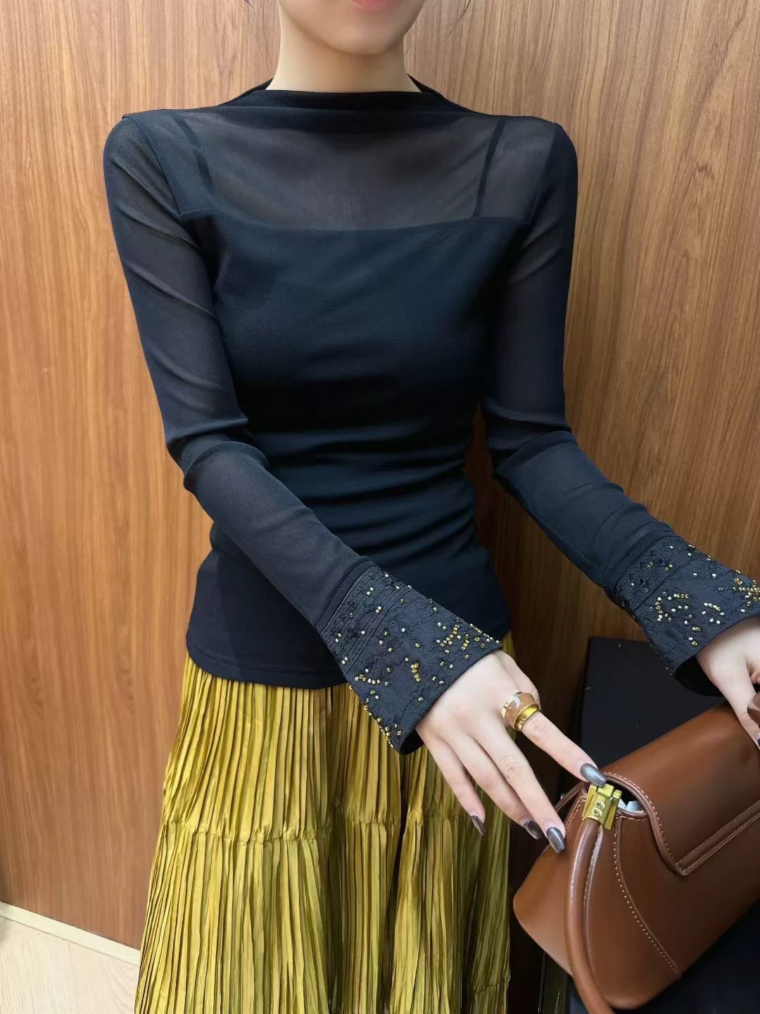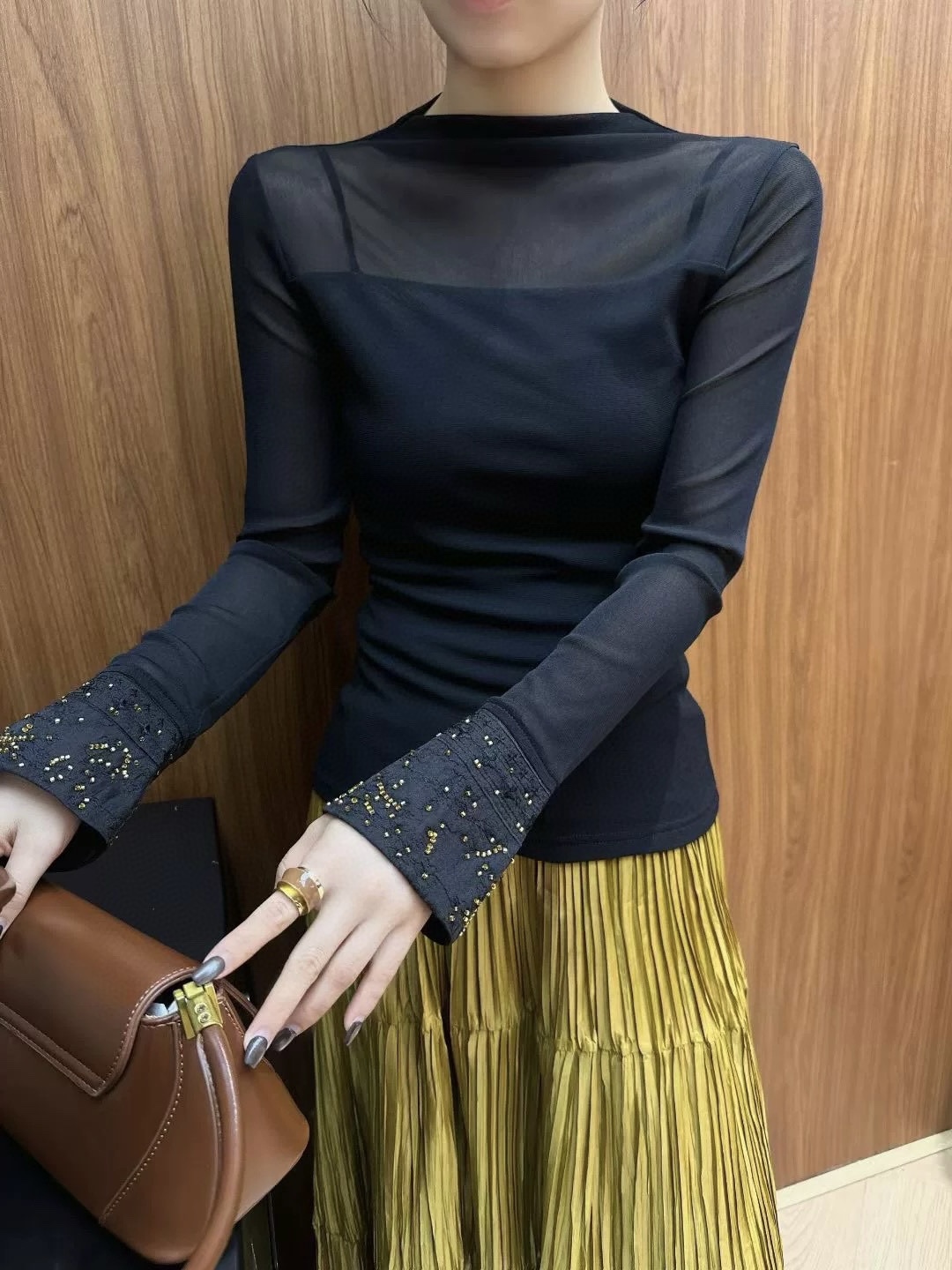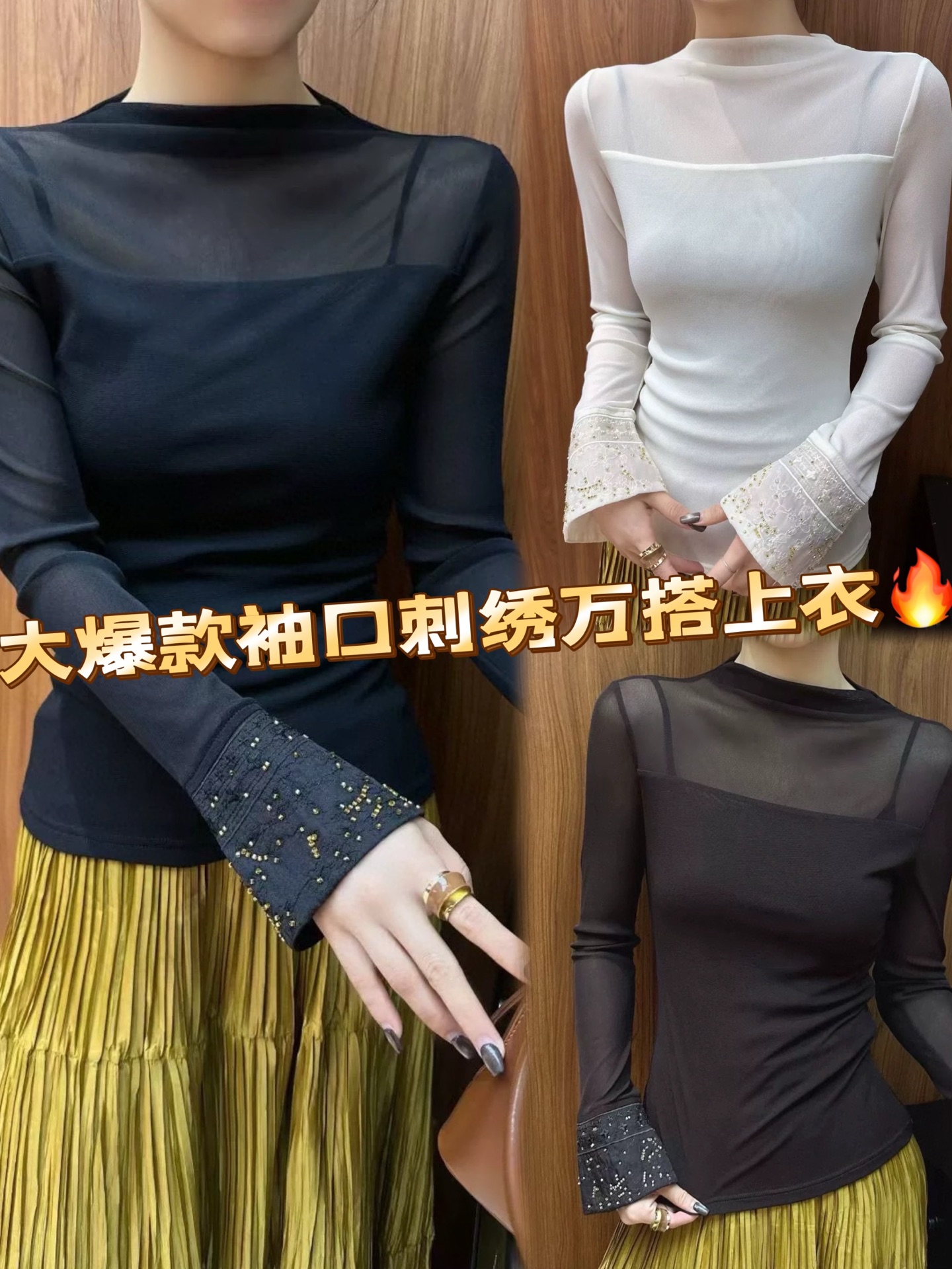 Elevate your style with this semi-high neck top featuring delicate beaded embroidery on the cuffs. Comfortable, flattering, and available in sizes S-XL.