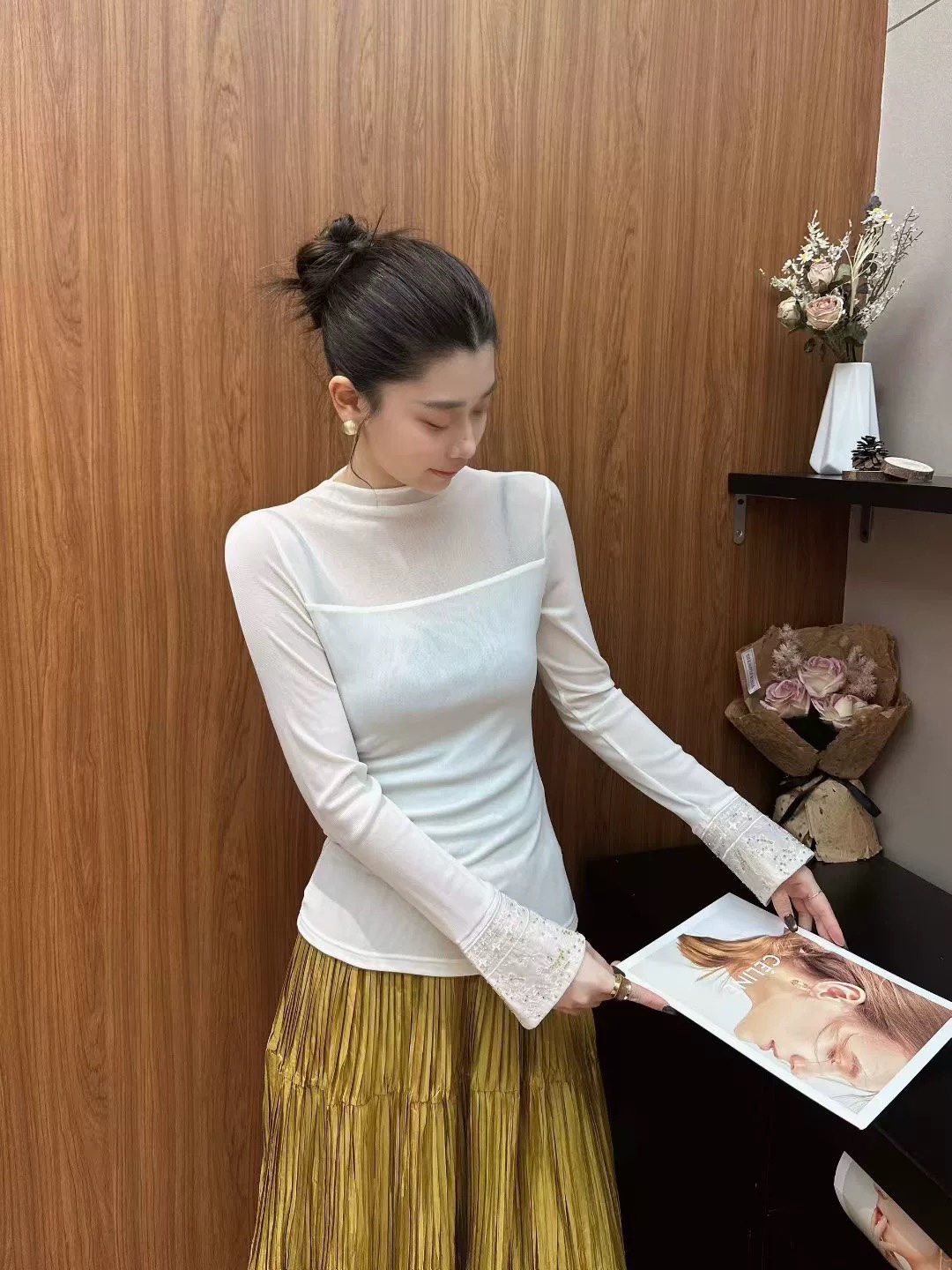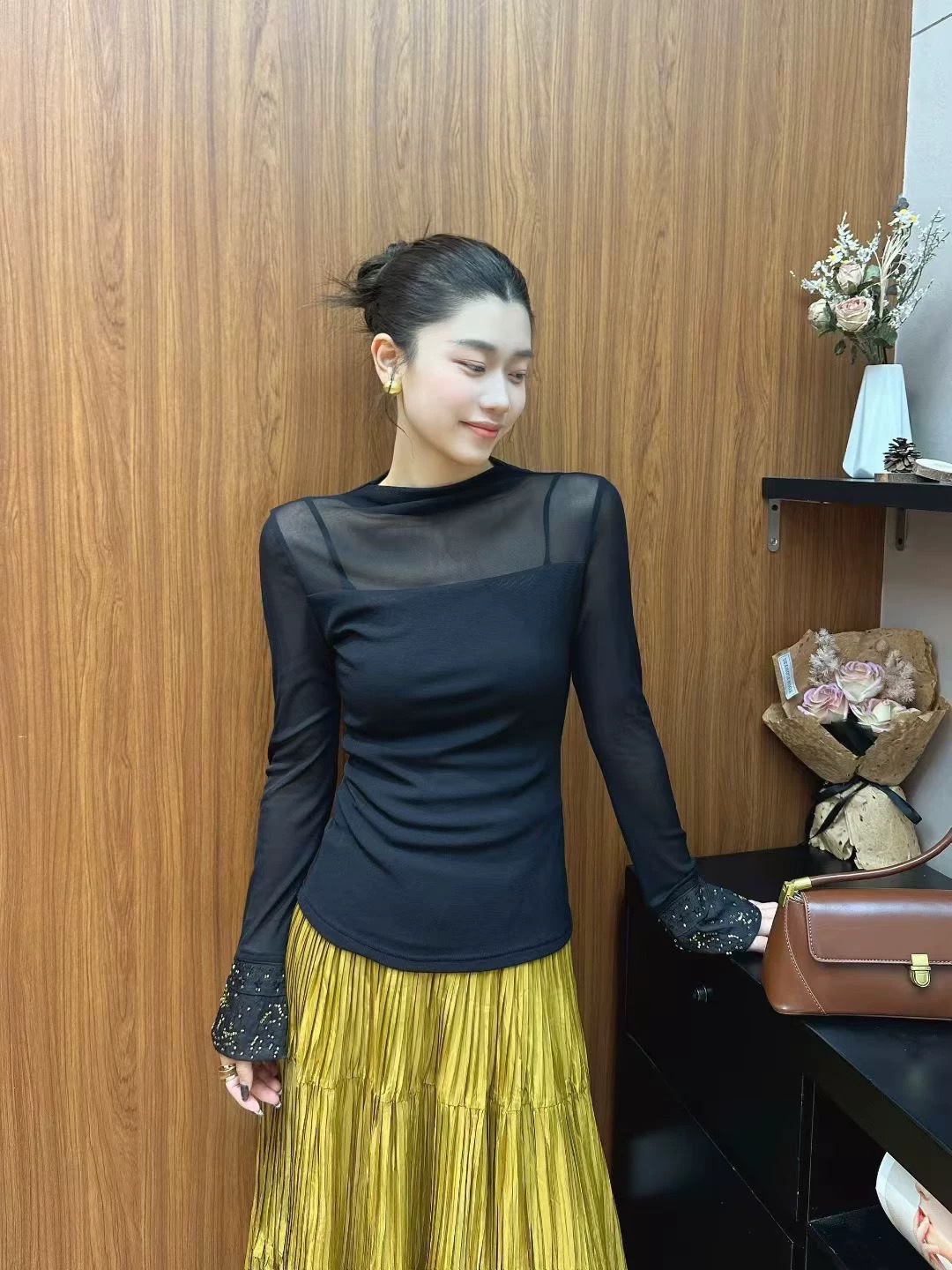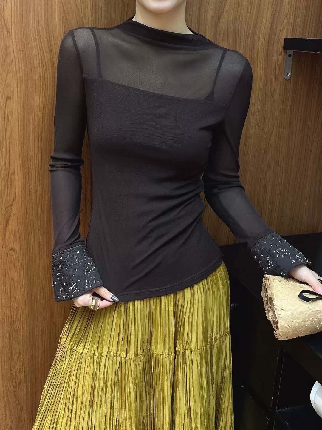 Elevate your style with this semi-high neck top featuring delicate beaded embroidery on the cuffs. Comfortable, flattering, and available in sizes S-XL.