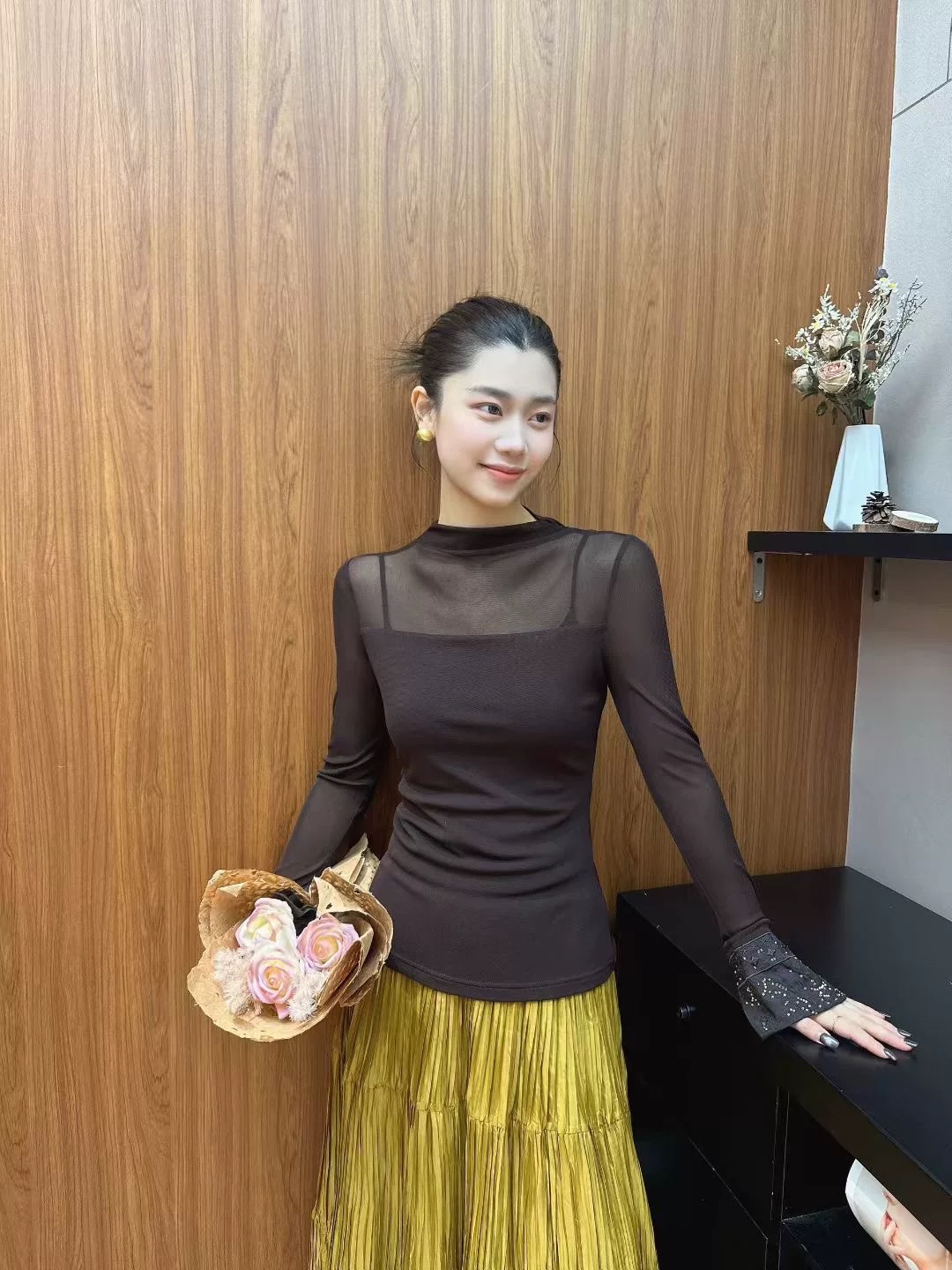 This elegant long-sleeve top combines comfort and style with its delicate details.