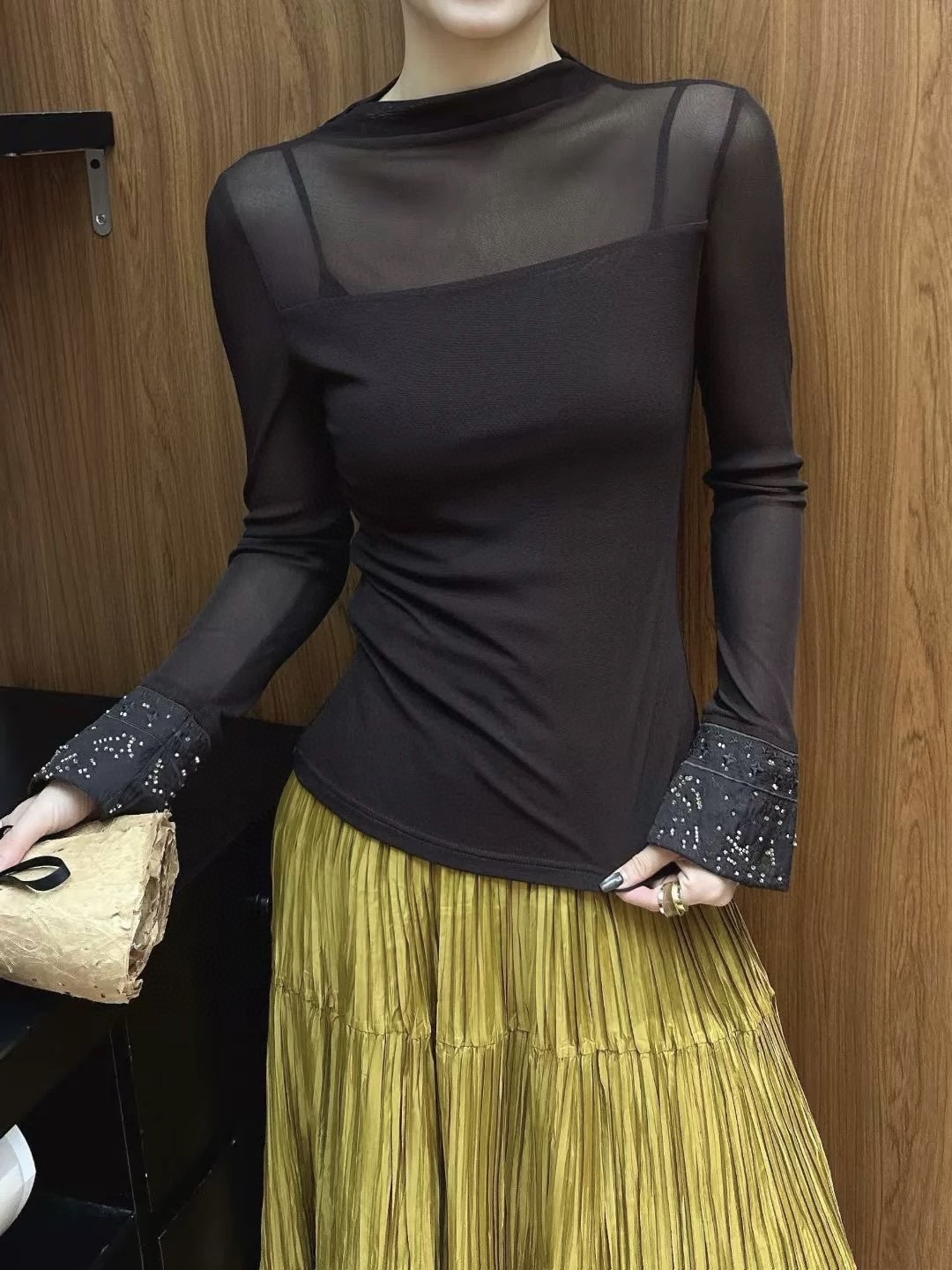 Elegant Beaded Embroidered Cuff Long Sleeve Top - Semi High Neck