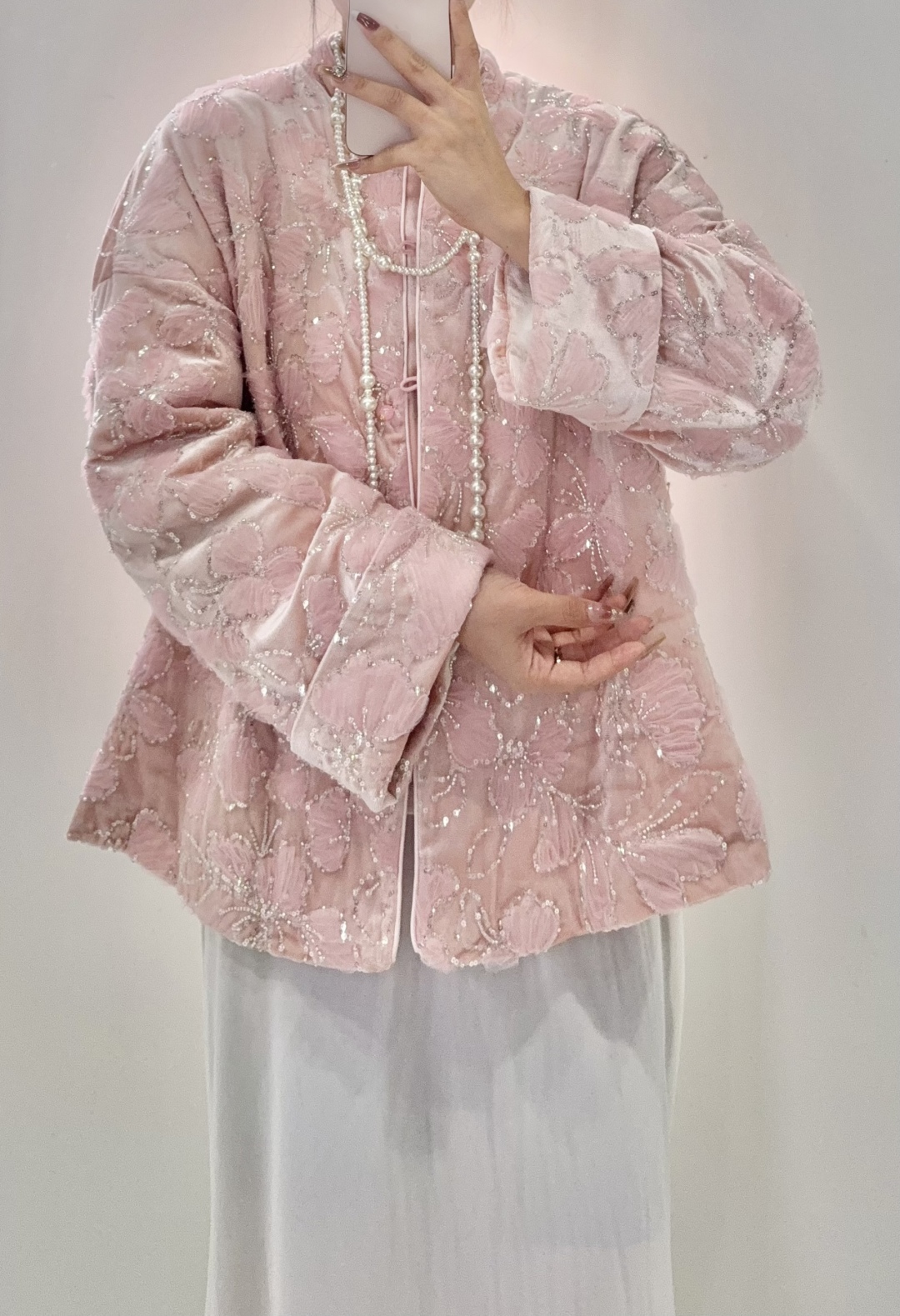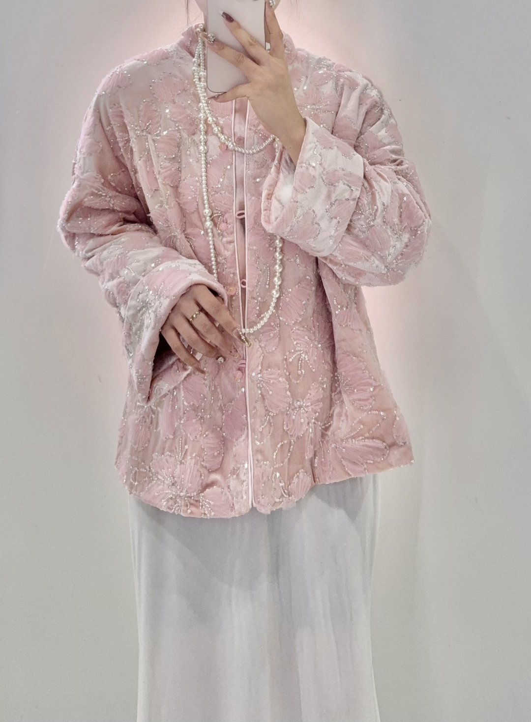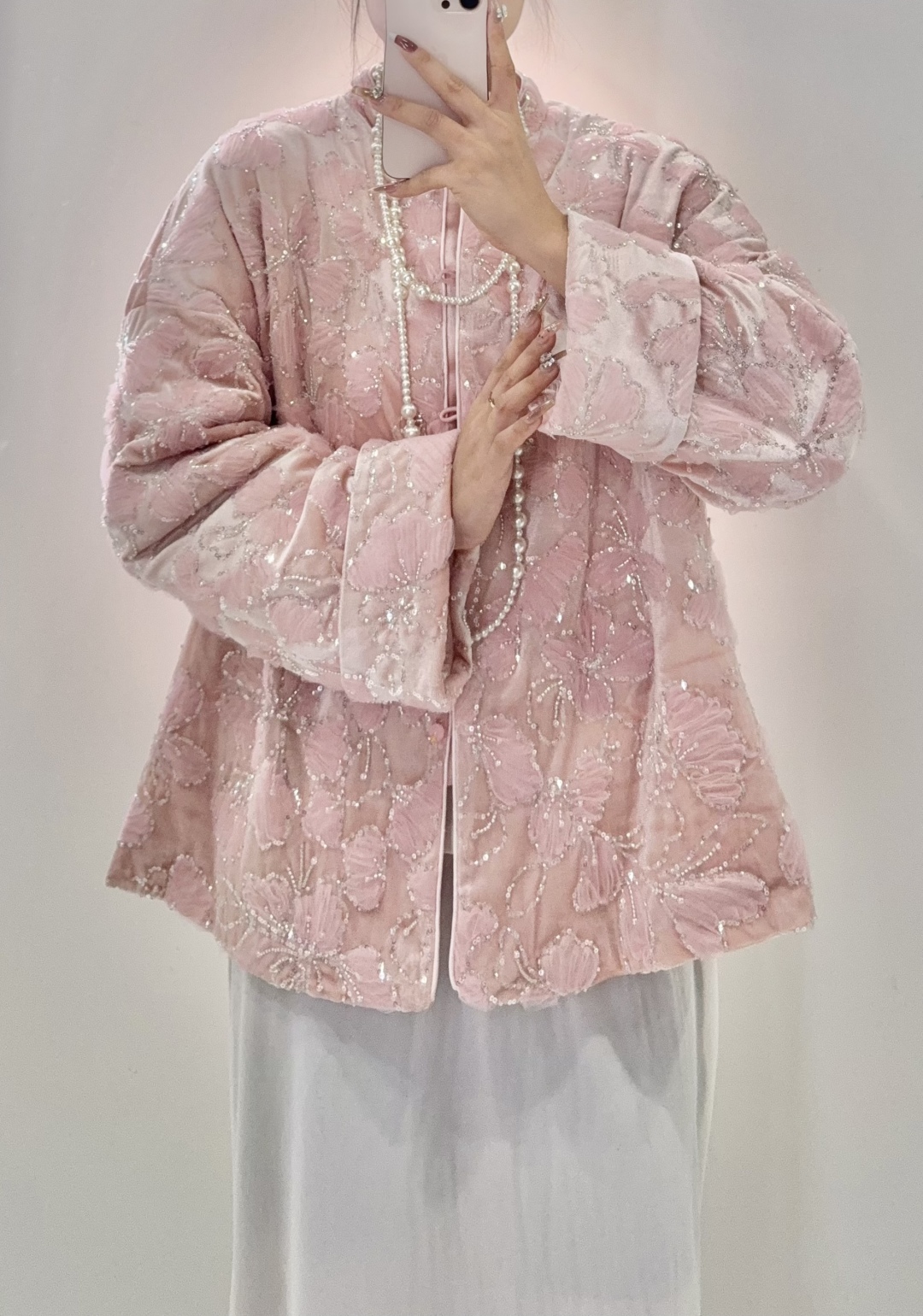 Elegant Beaded Velvet Jacket, Floral Embroidery Design, Pink Outerwear