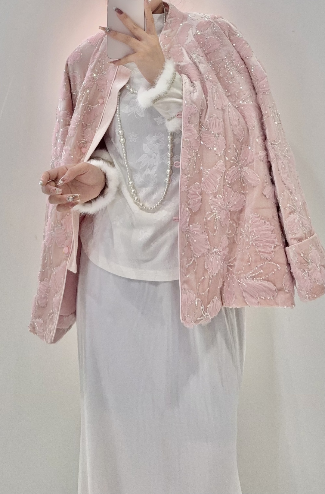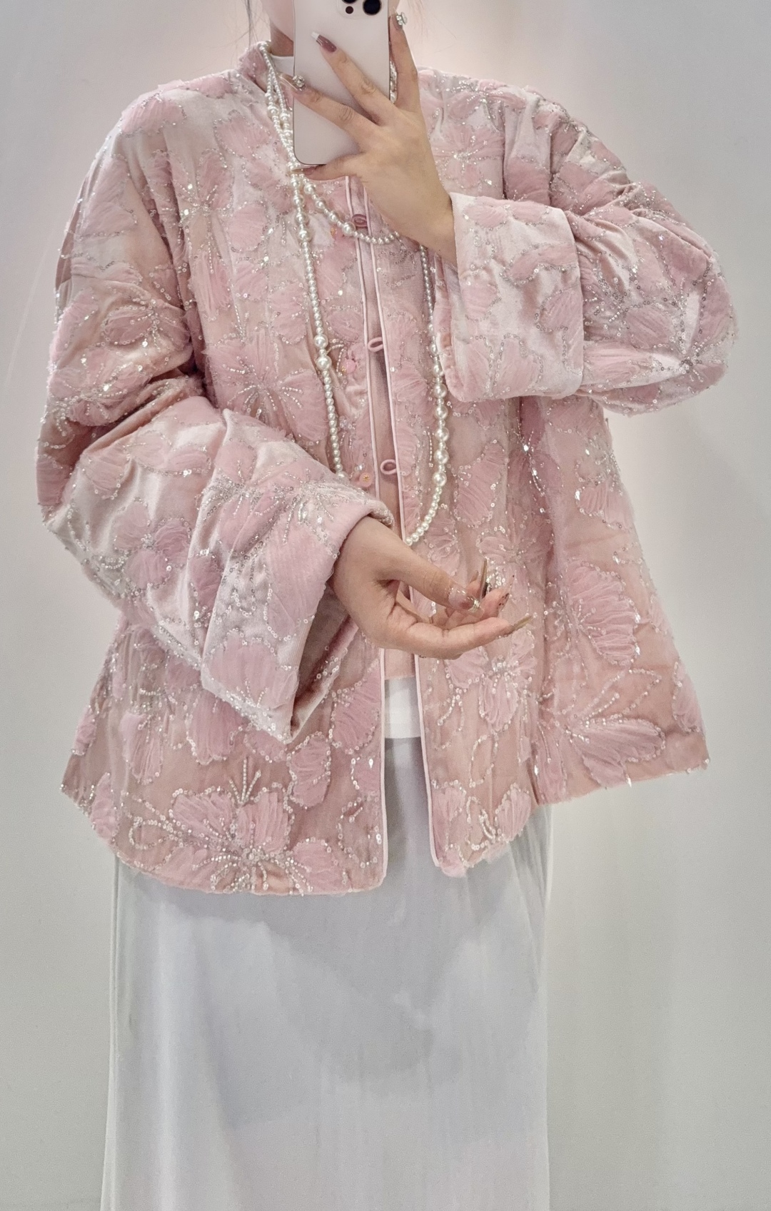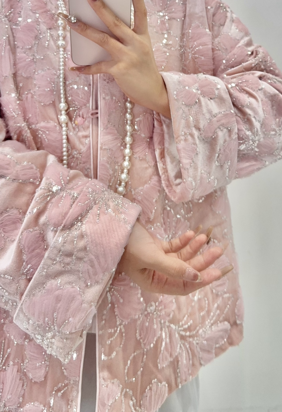 Elegant Beaded Velvet Jacket, Floral Embroidery Design, Pink Outerwear