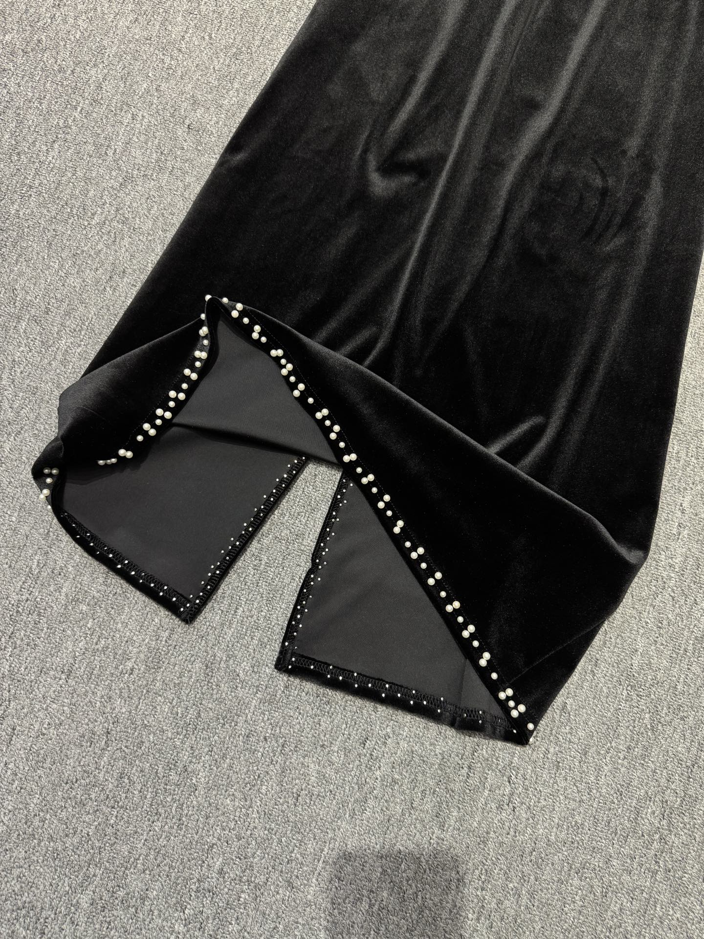 - Pearl embellishments along the hemline add a touch of glamour.
