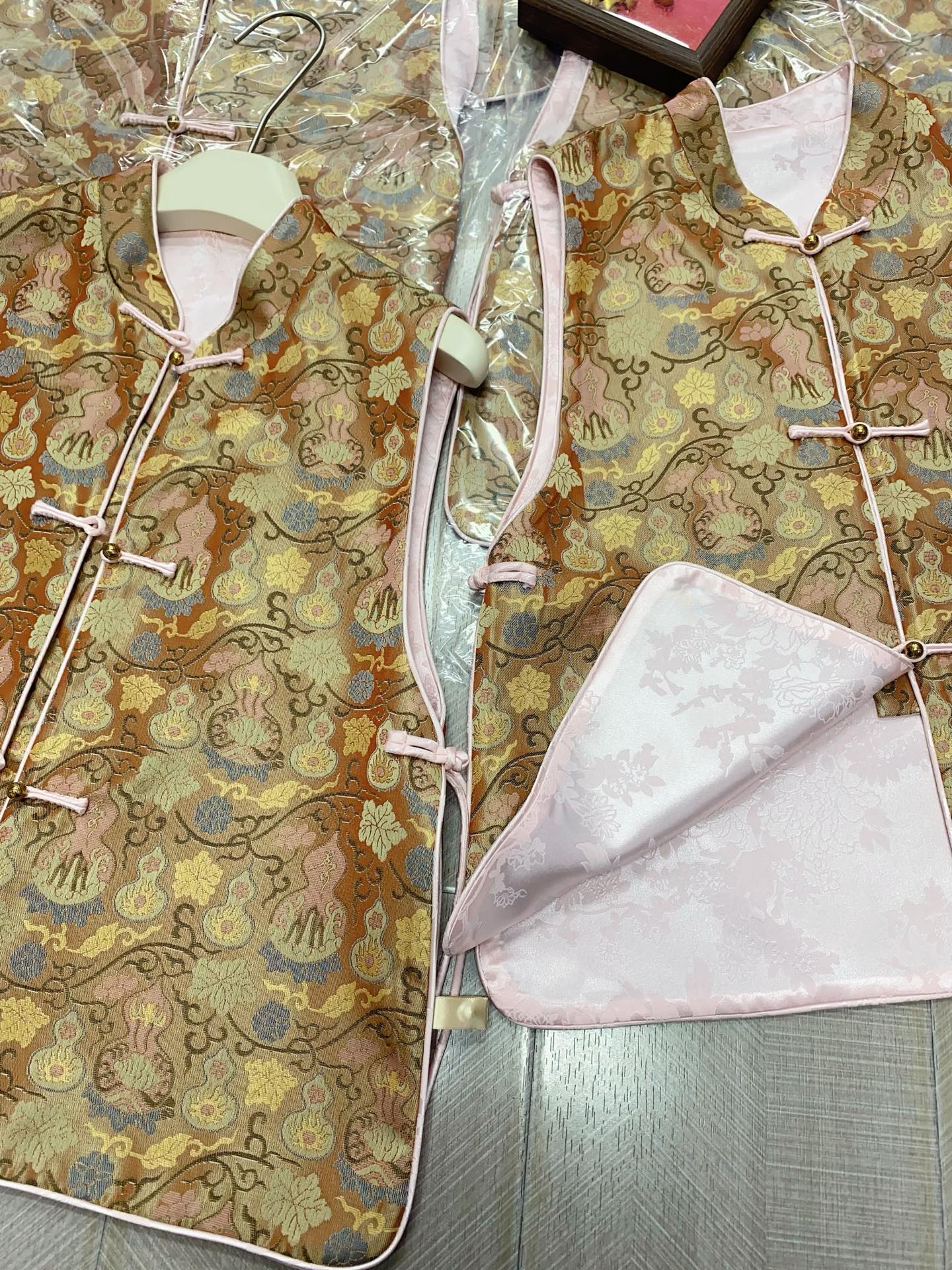 This early autumn brocade vest combines modern fashion with traditional elements. The exquisite entwined gourd pattern draws inspiration from ancient paintings housed in the Palace Museum. The vest features a rich yet elegant color palette, with a dark green base accented by soft pink edges.