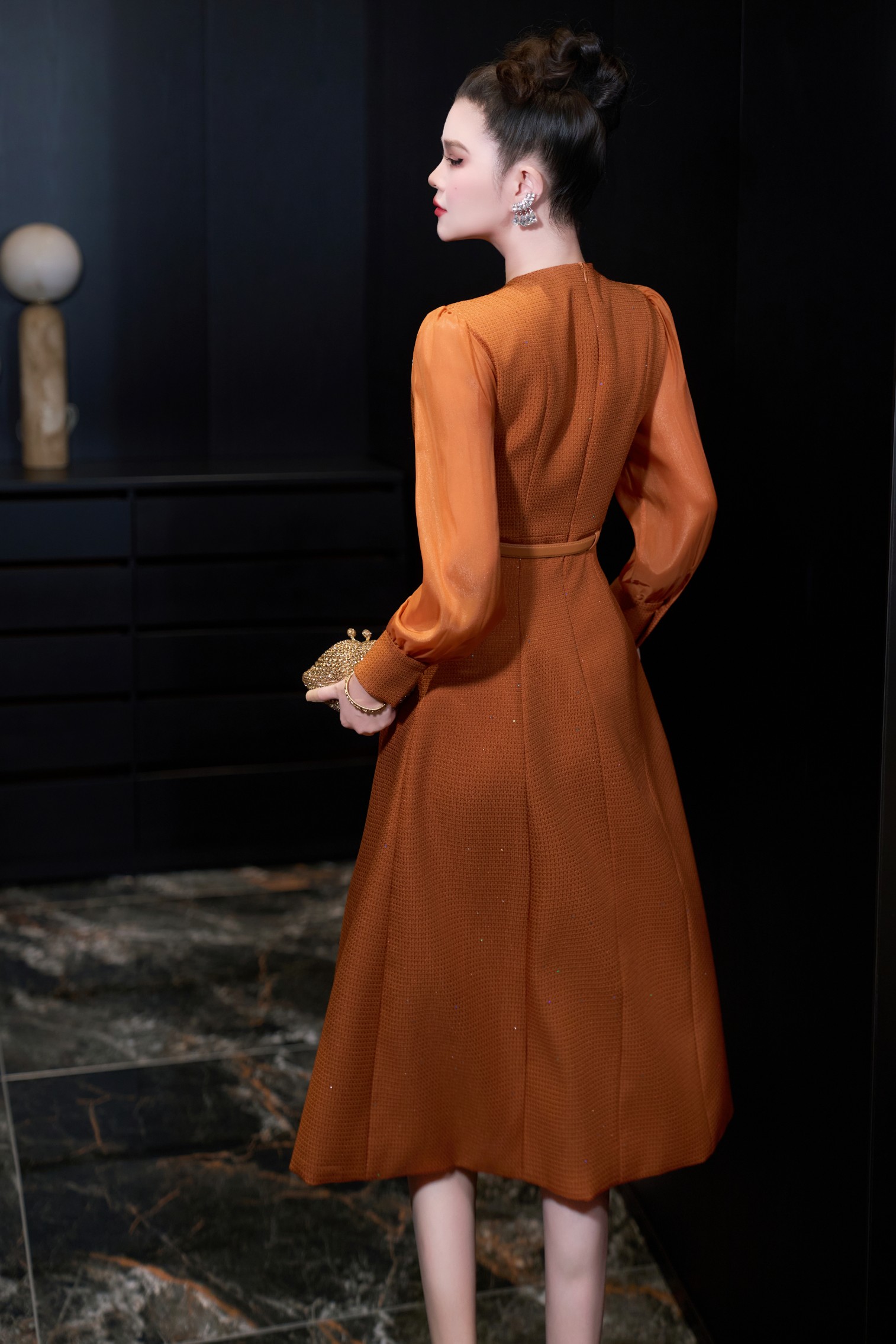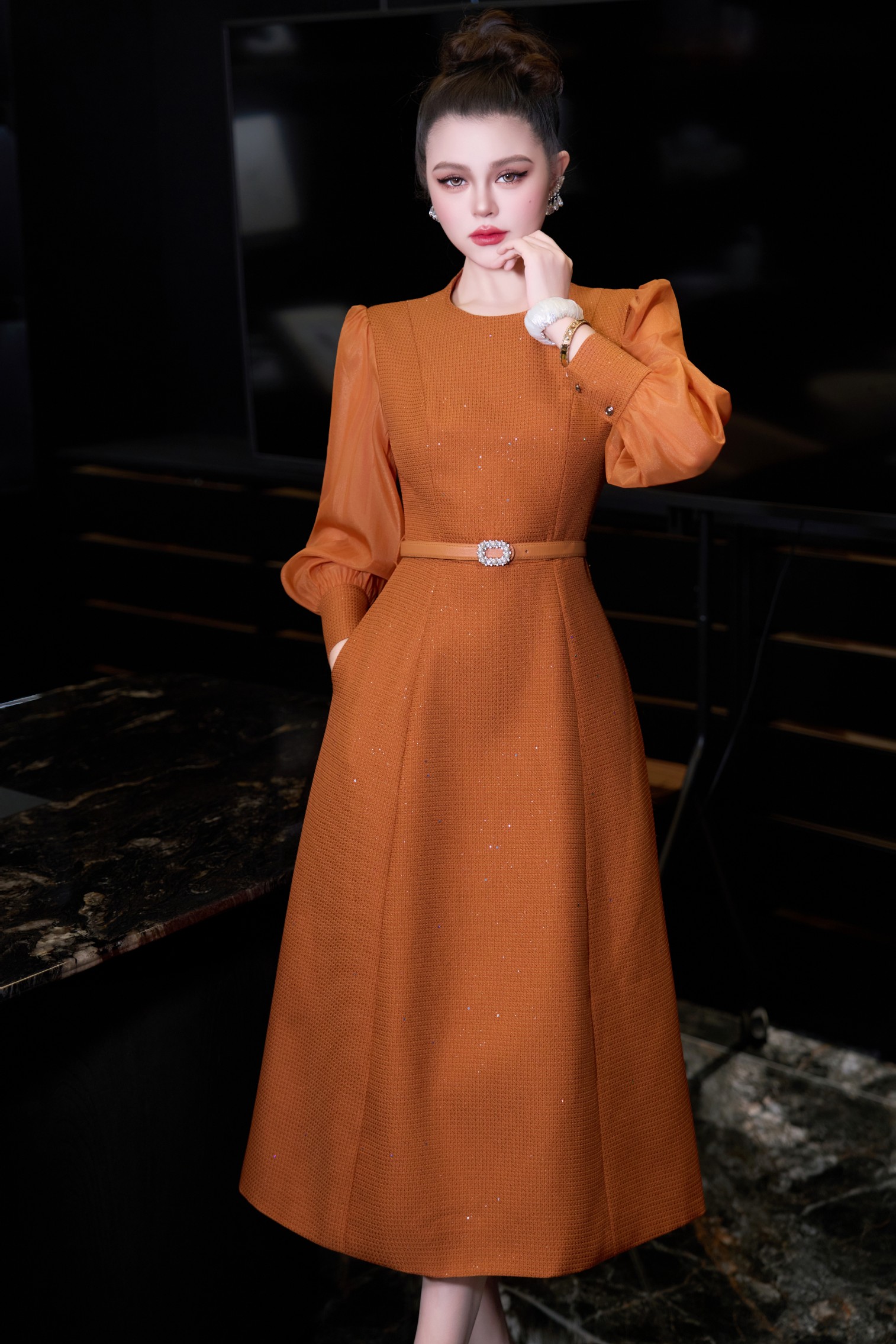 Elegant Caramel A-Line Midi Dress with Long Sleeves and Belted Waist