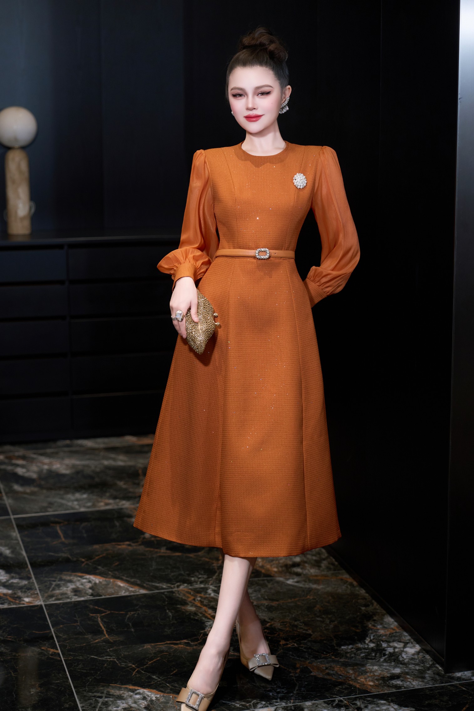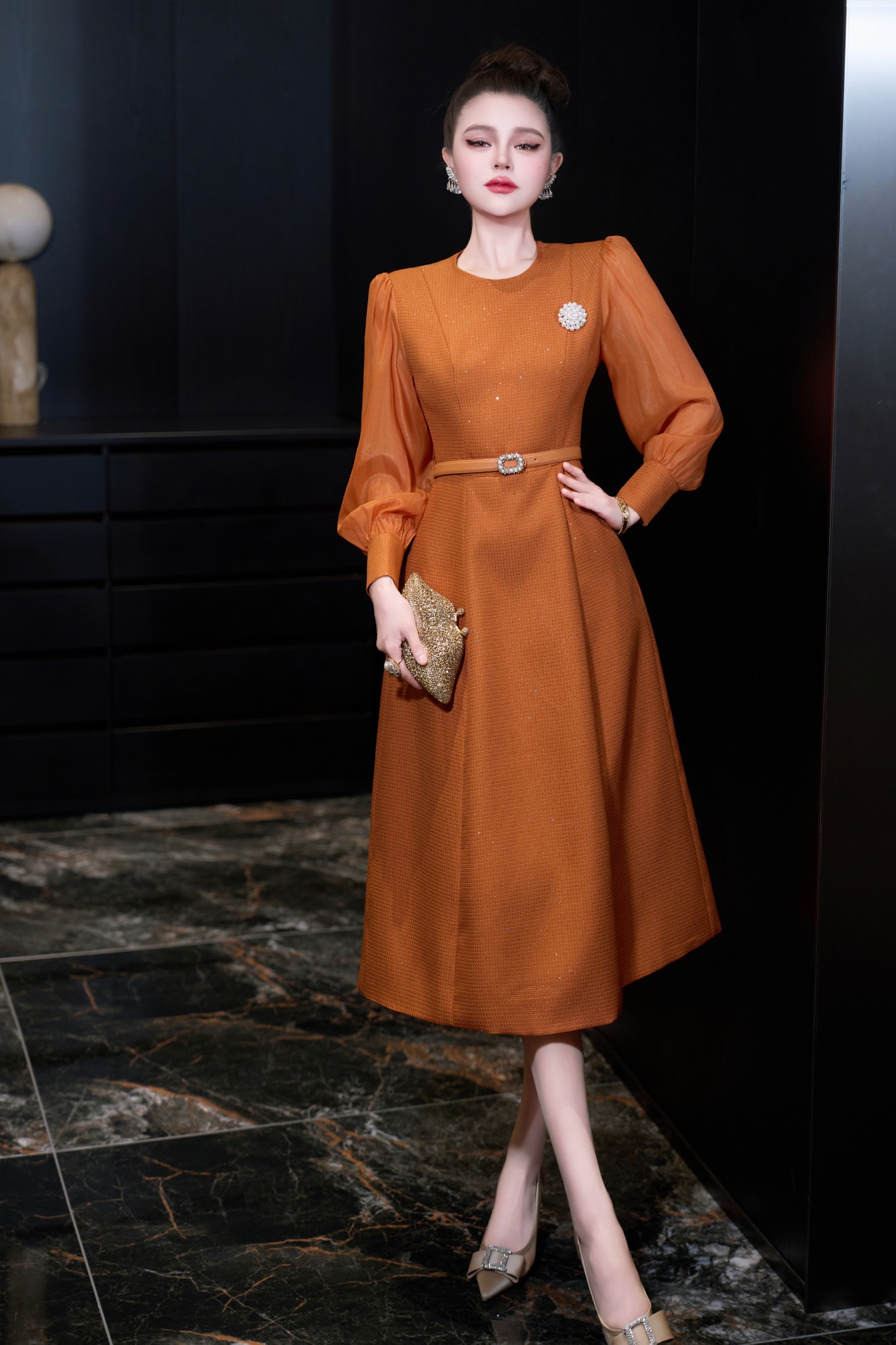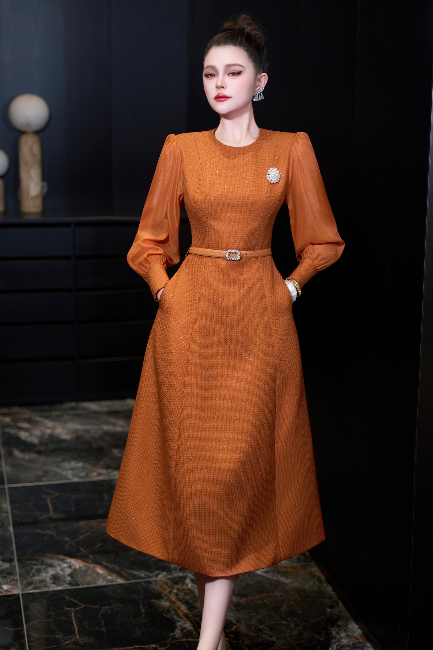 Elevate your style with this chic caramel midi dress. Featuring long sleeves, a flattering A-line silhouette, and a belted waist for a touch of elegance.