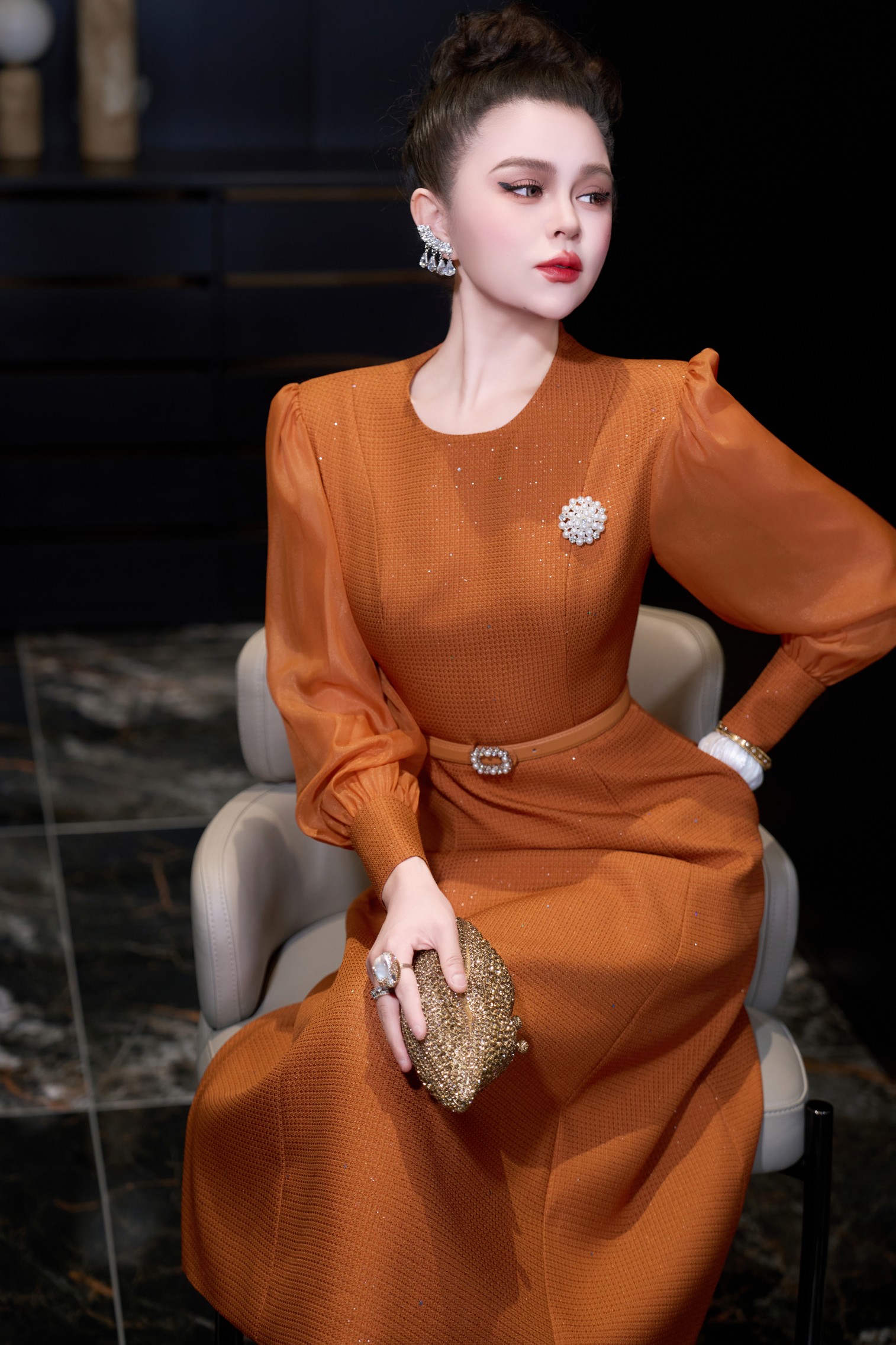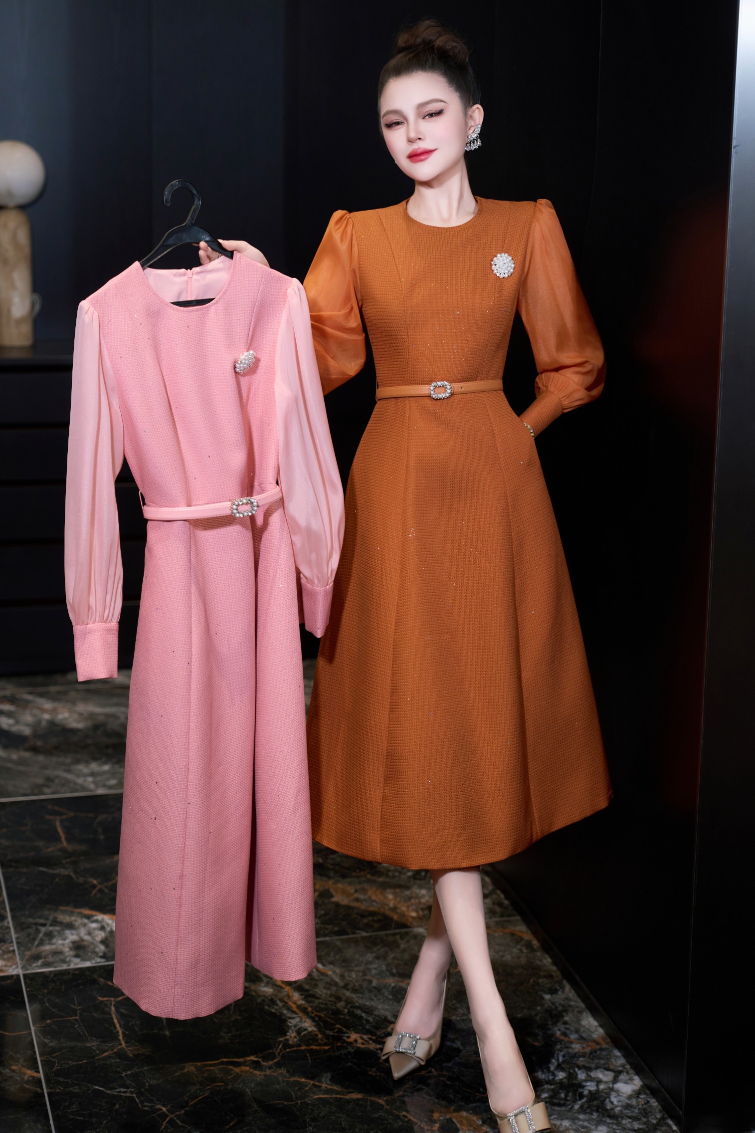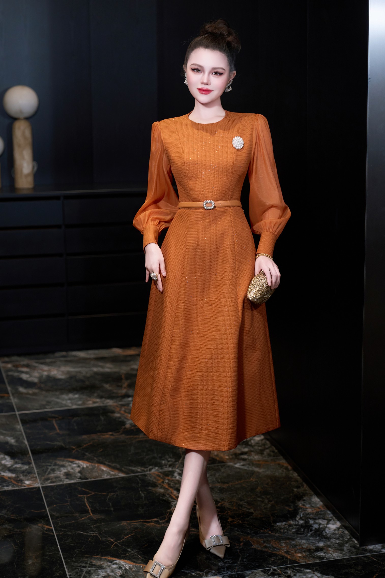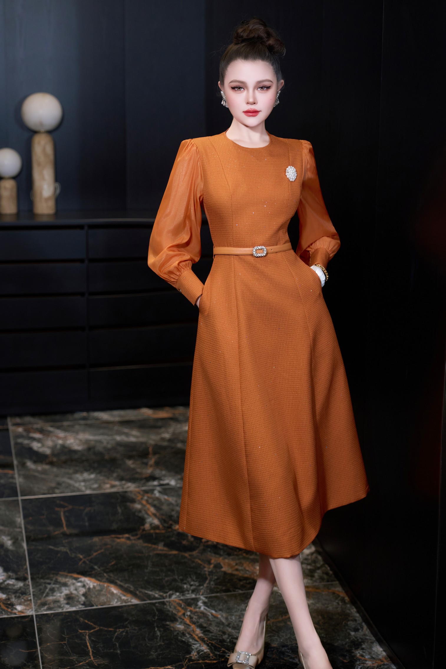 Elevate your style with this chic caramel midi dress. Featuring long sleeves, a flattering A-line silhouette, and a belted waist for a touch of elegance.