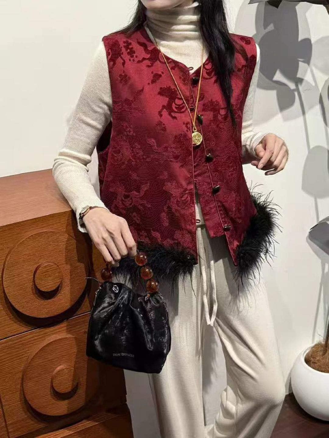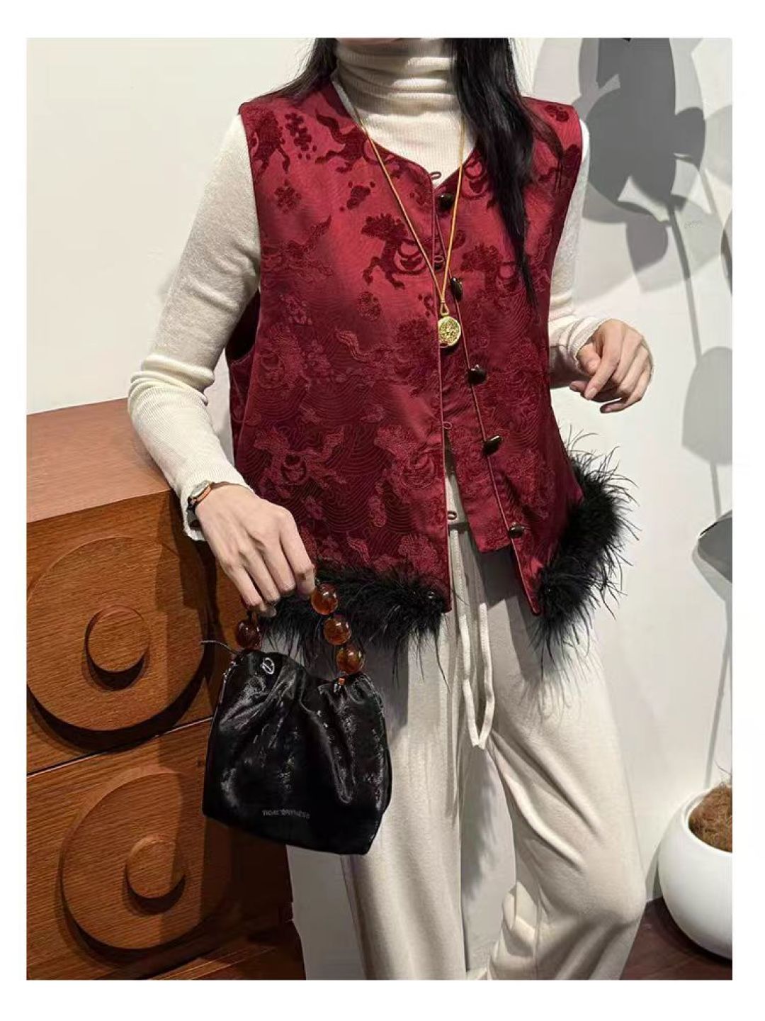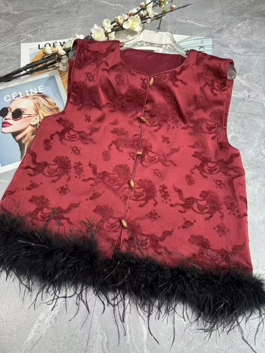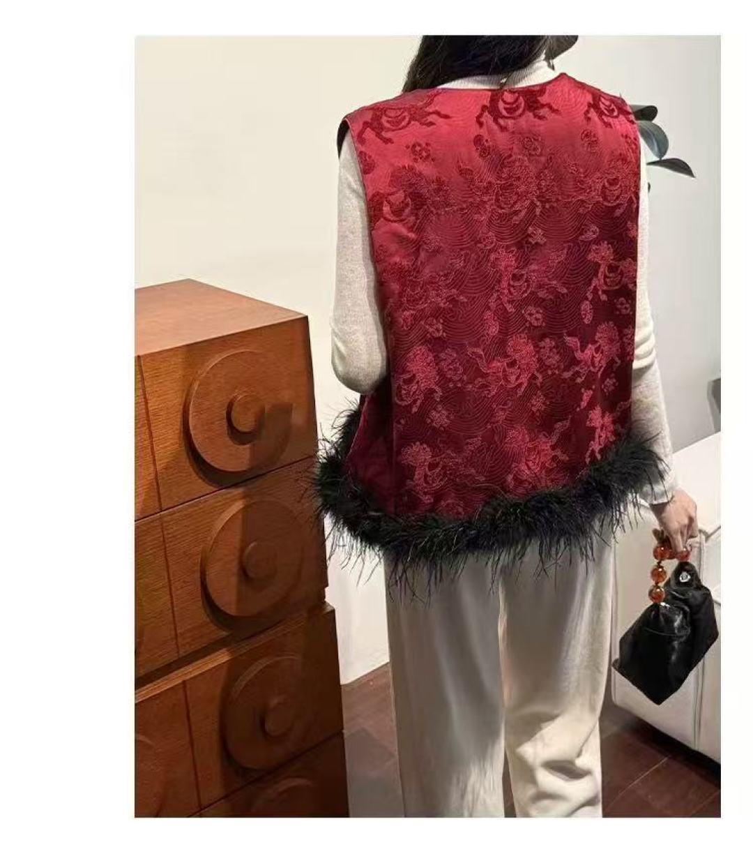 This vest is beautiful and well-made. The Chinese-style design is elegant, and the feather trim is detachable, which is a great feature. It's perfect for adding a touch of sophistication to my wardrobe.