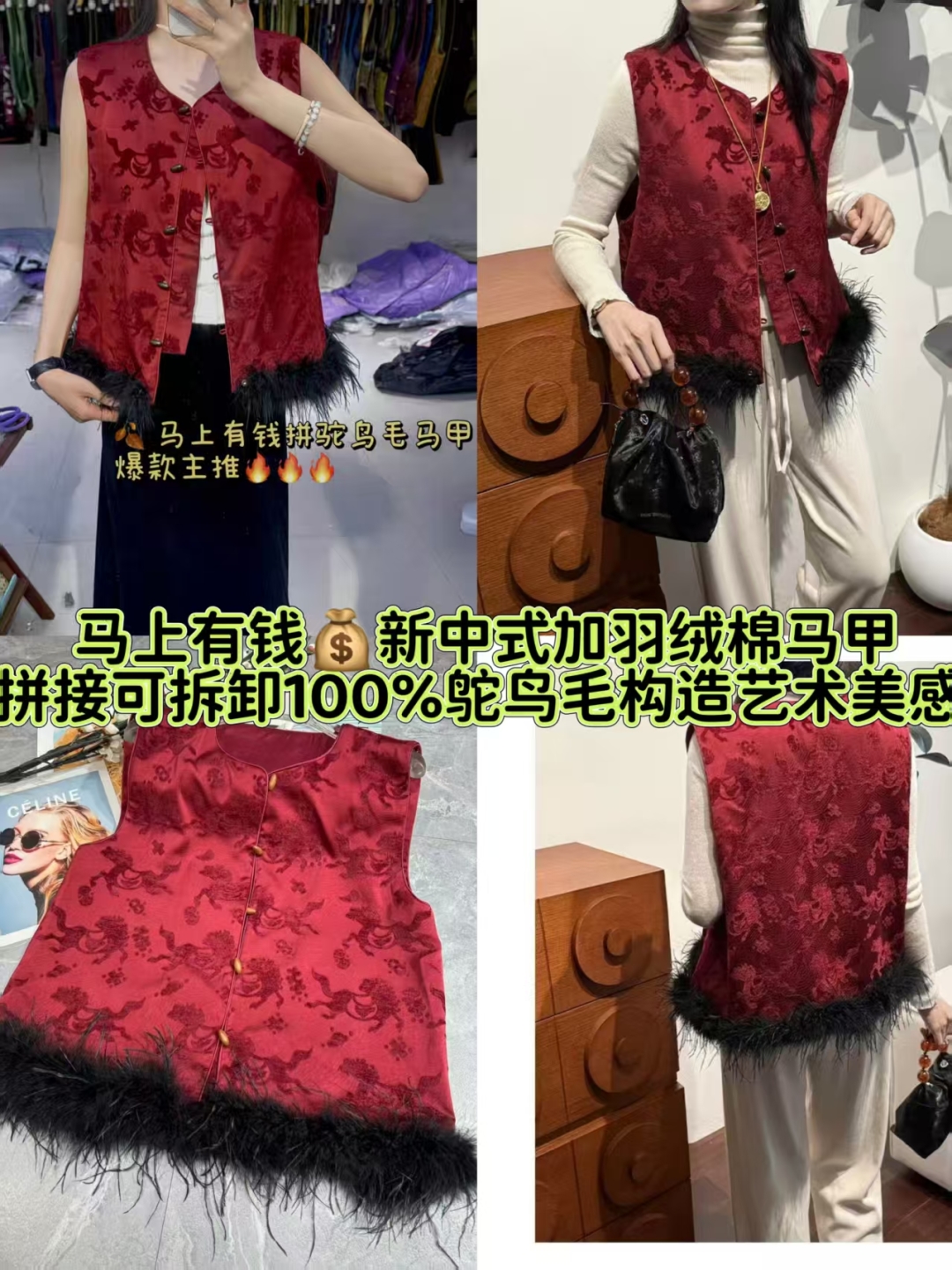 Tags: Artistic Detail Vest, Chinese style Vest, Detachable Feather Trim, Elegant Women's Vest, Ostrich Feather Vest, Winter Cotton Vest