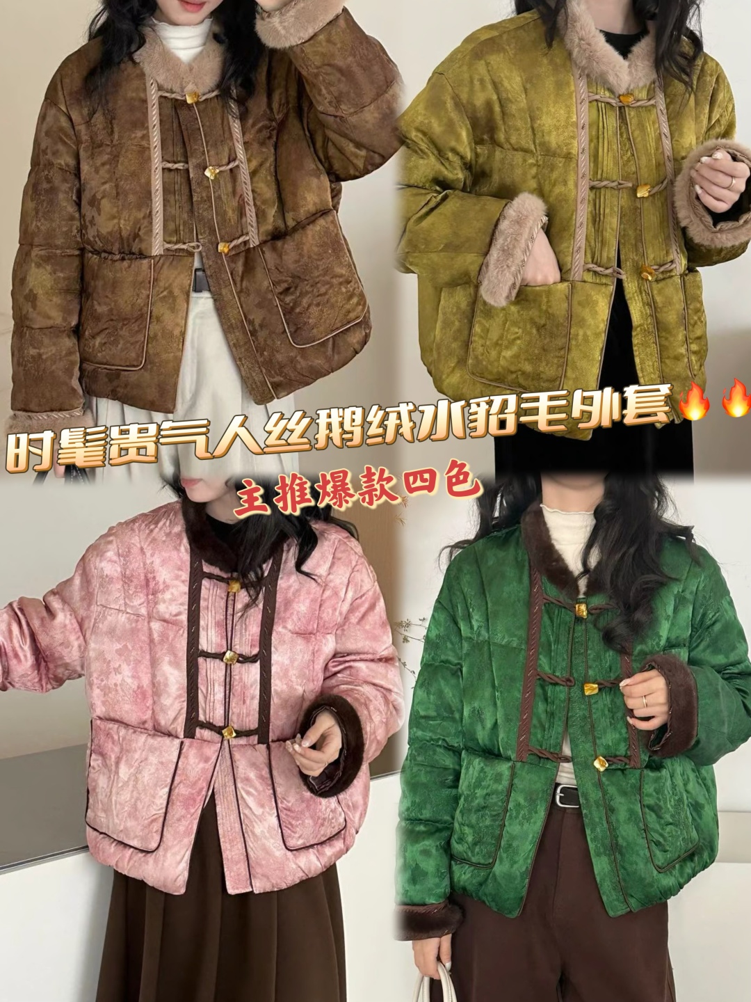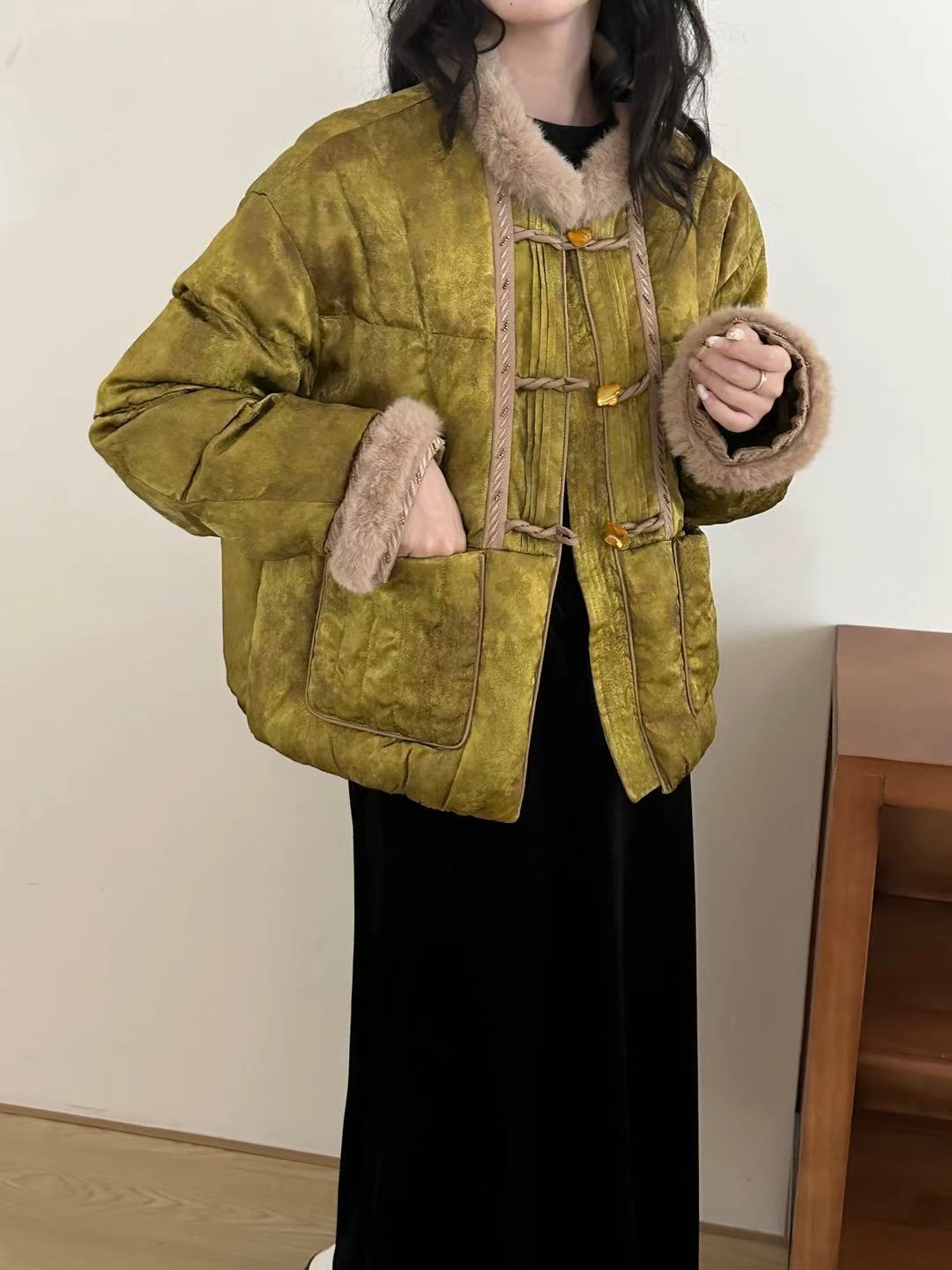 This stylish Chinese-inspired down jacket features a loose, flattering A-line cut, mink fur trim, and unique toggle closures. Perfect for a chic, warm look.