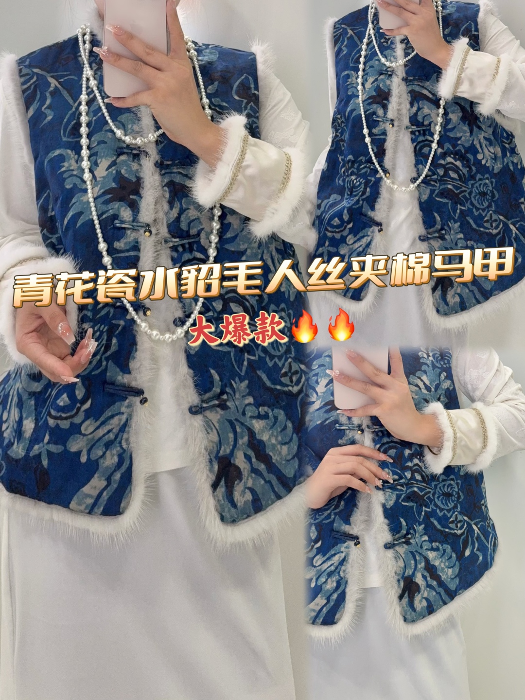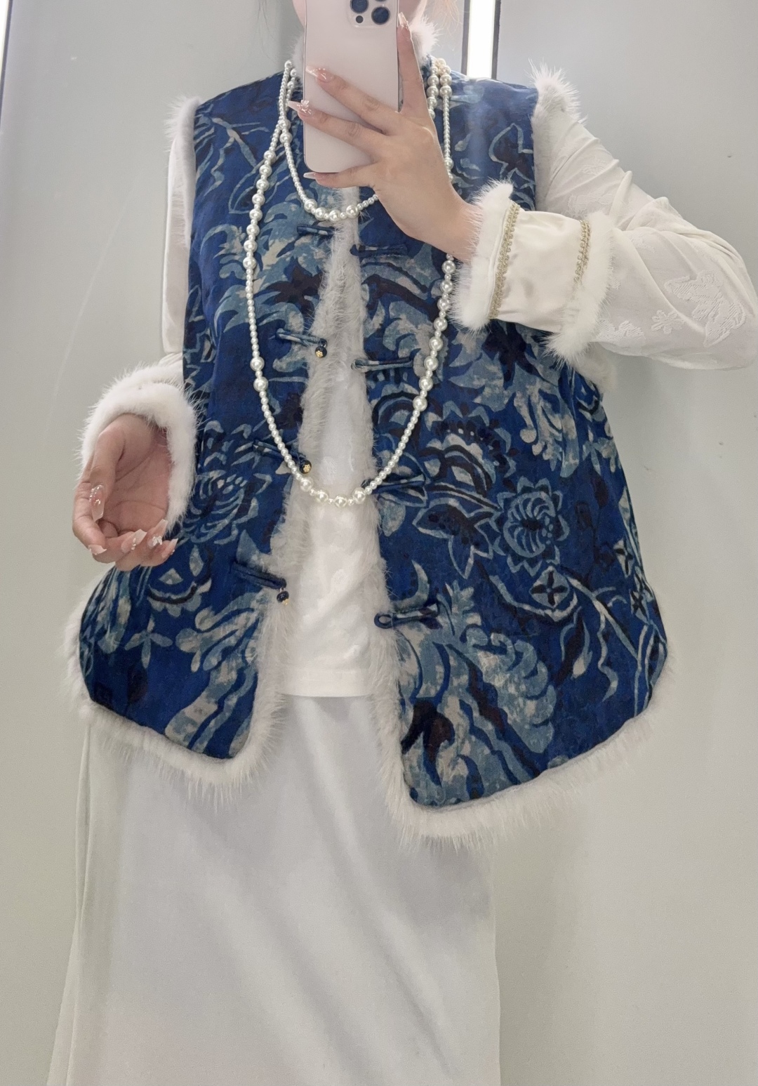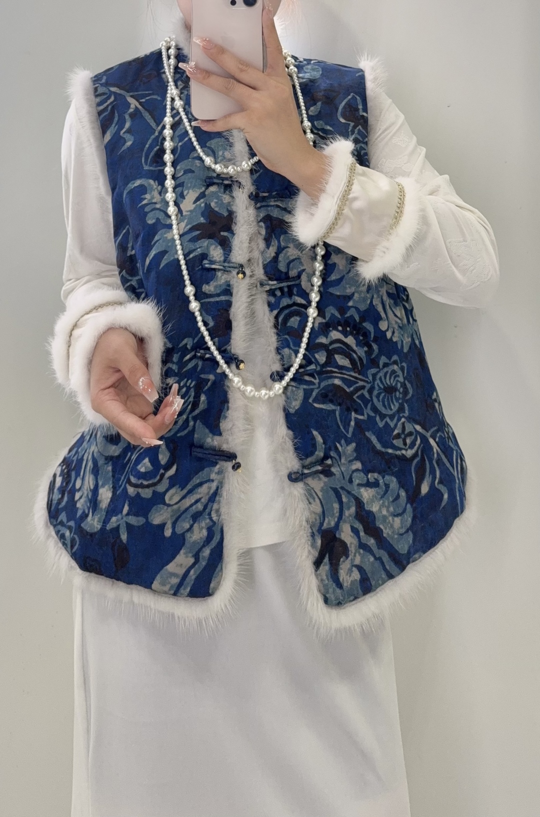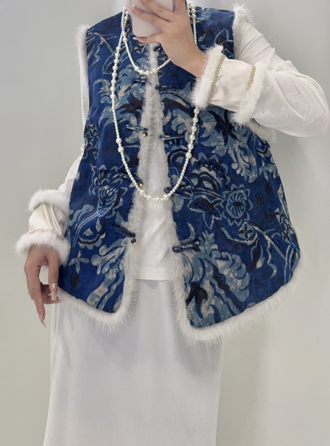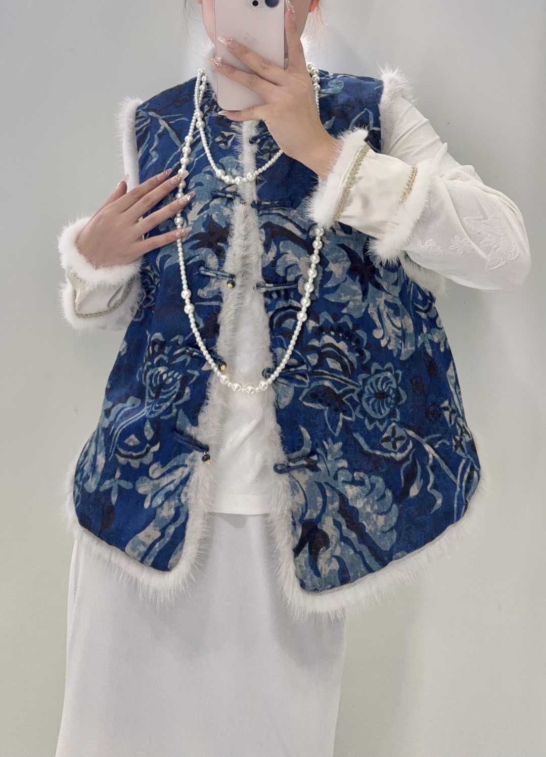 Elevate your style with this elegant Chinese-style vest, featuring a Qinghua porcelain pattern and trimmed with soft mink fur.