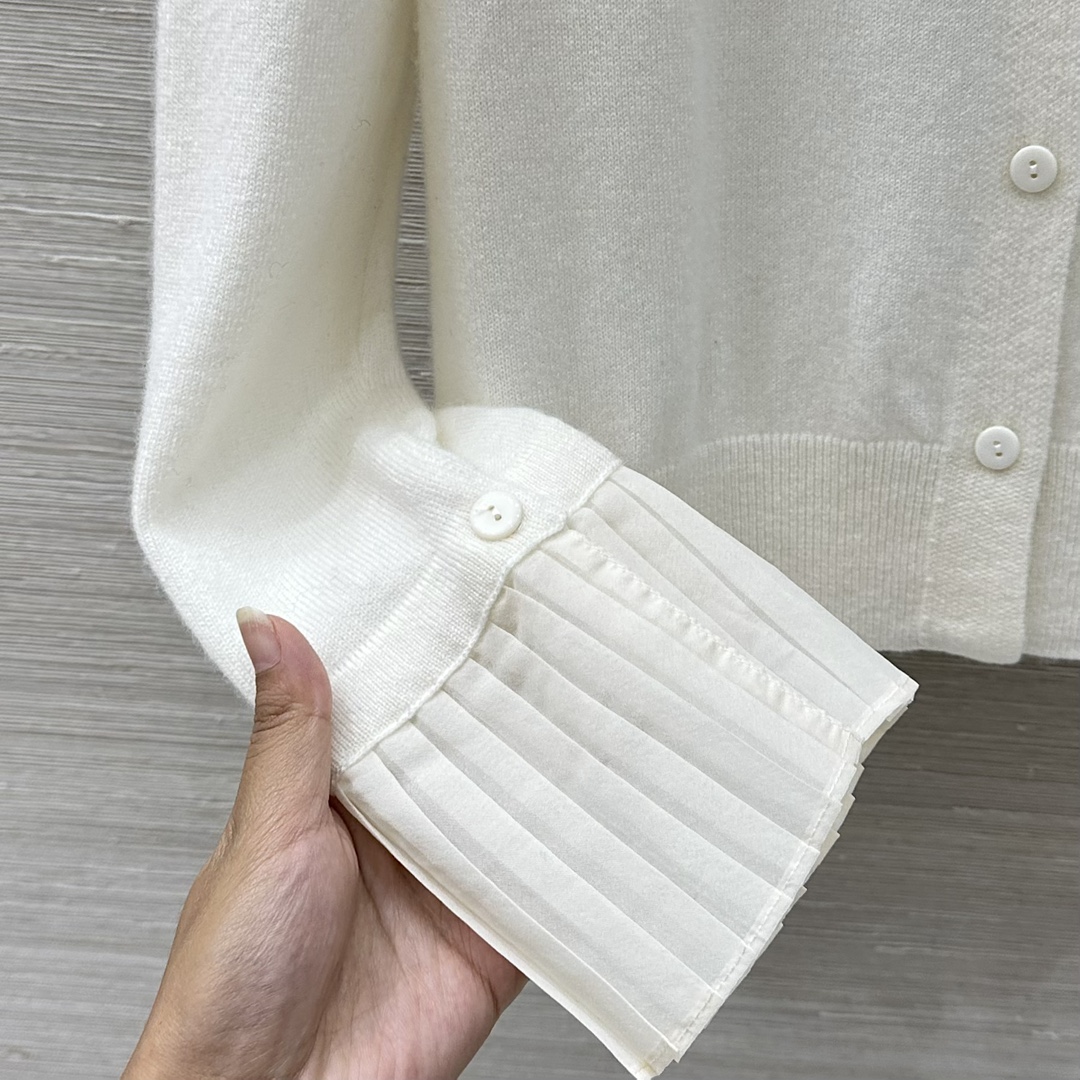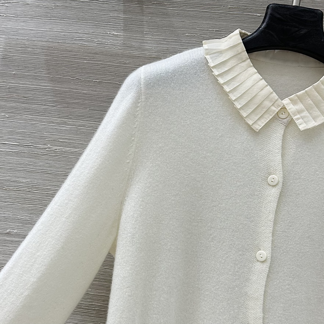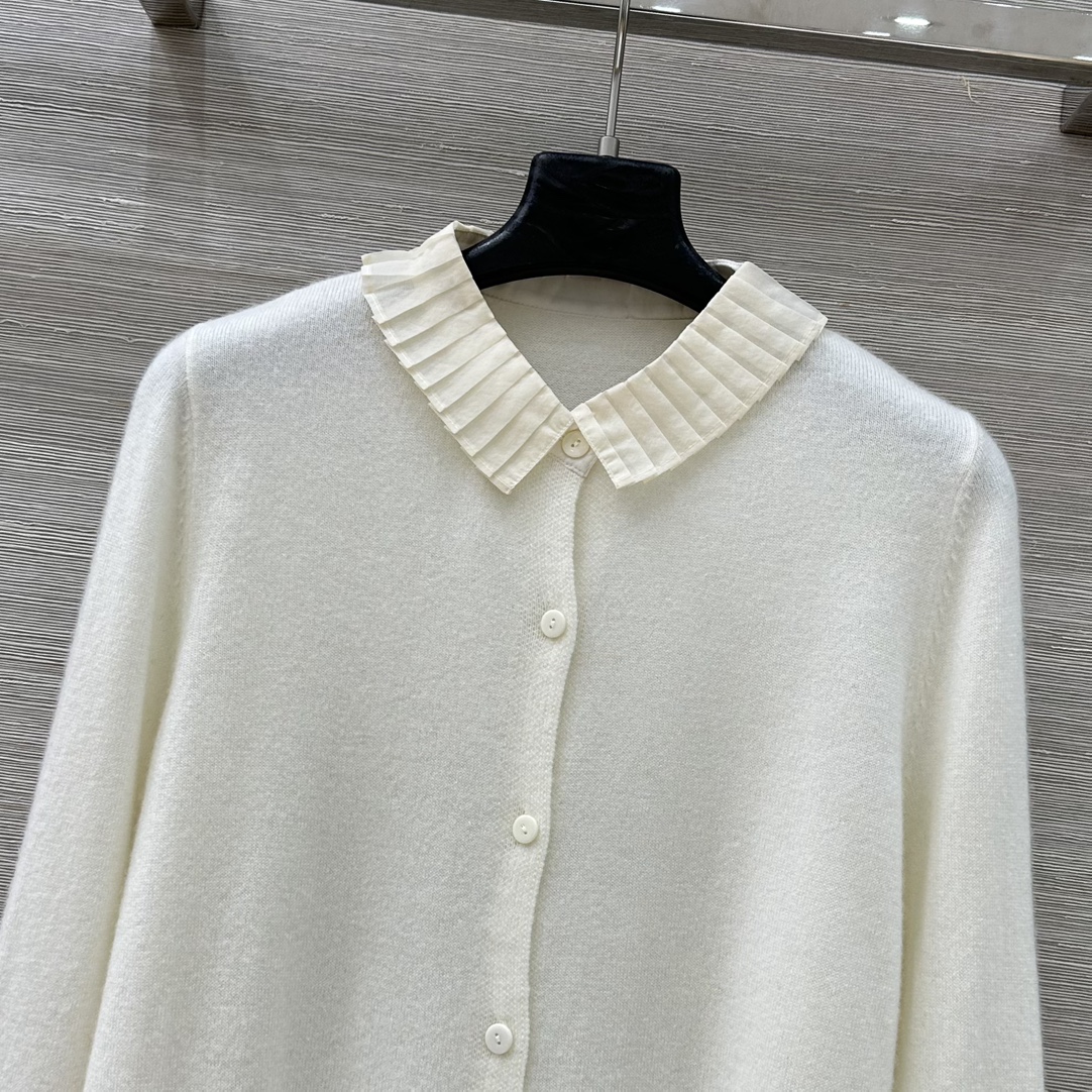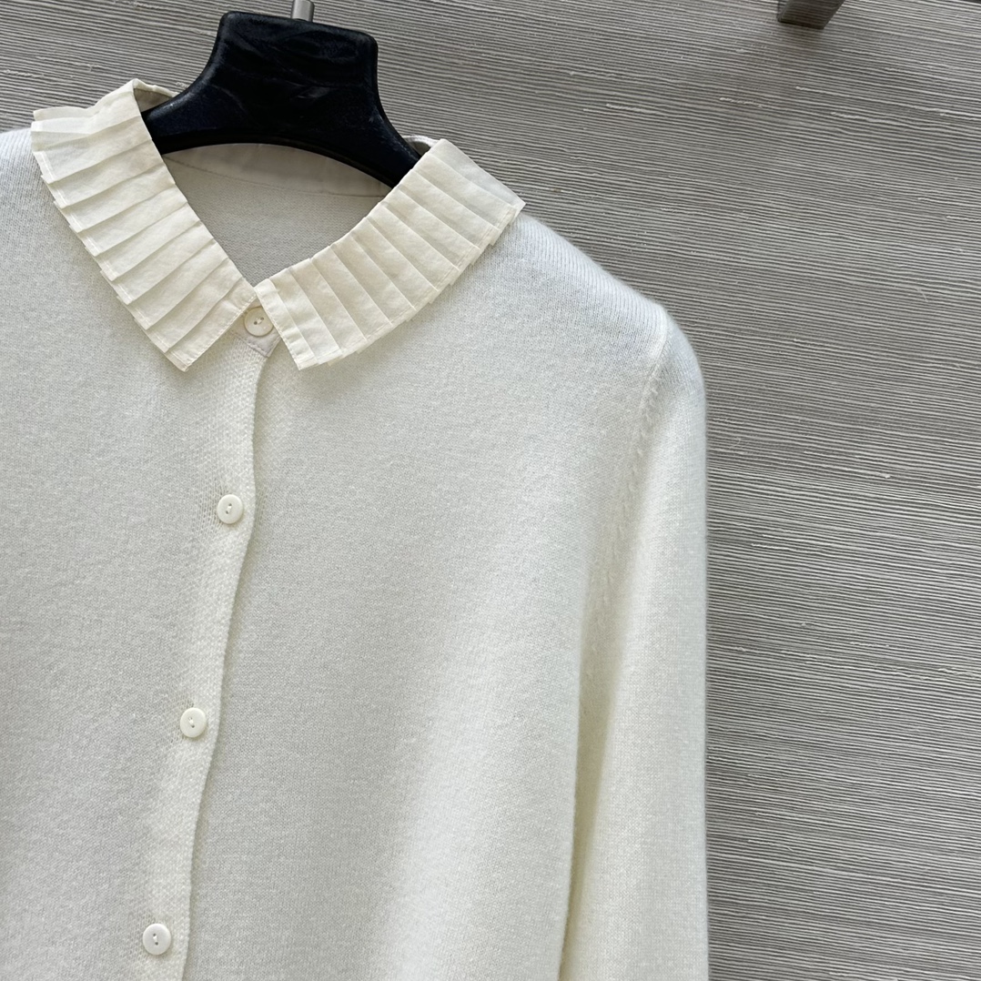 Elevate your style with this cashmere cardigan featuring a detachable silk pleated collar and cuffs.This soft, flattering knit is perfect for any occasion.