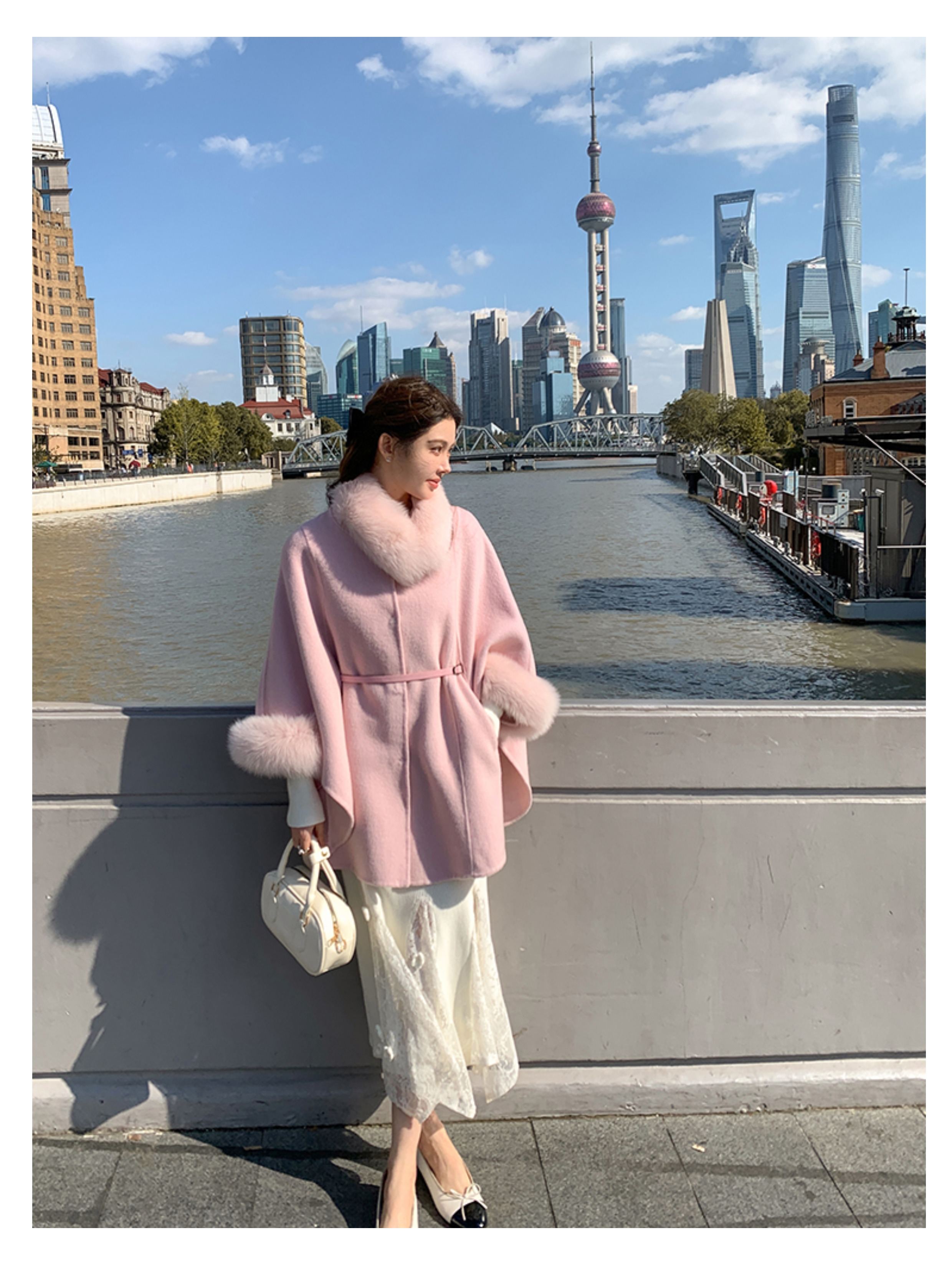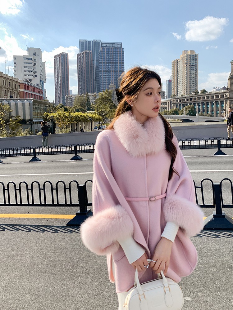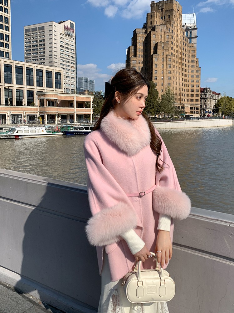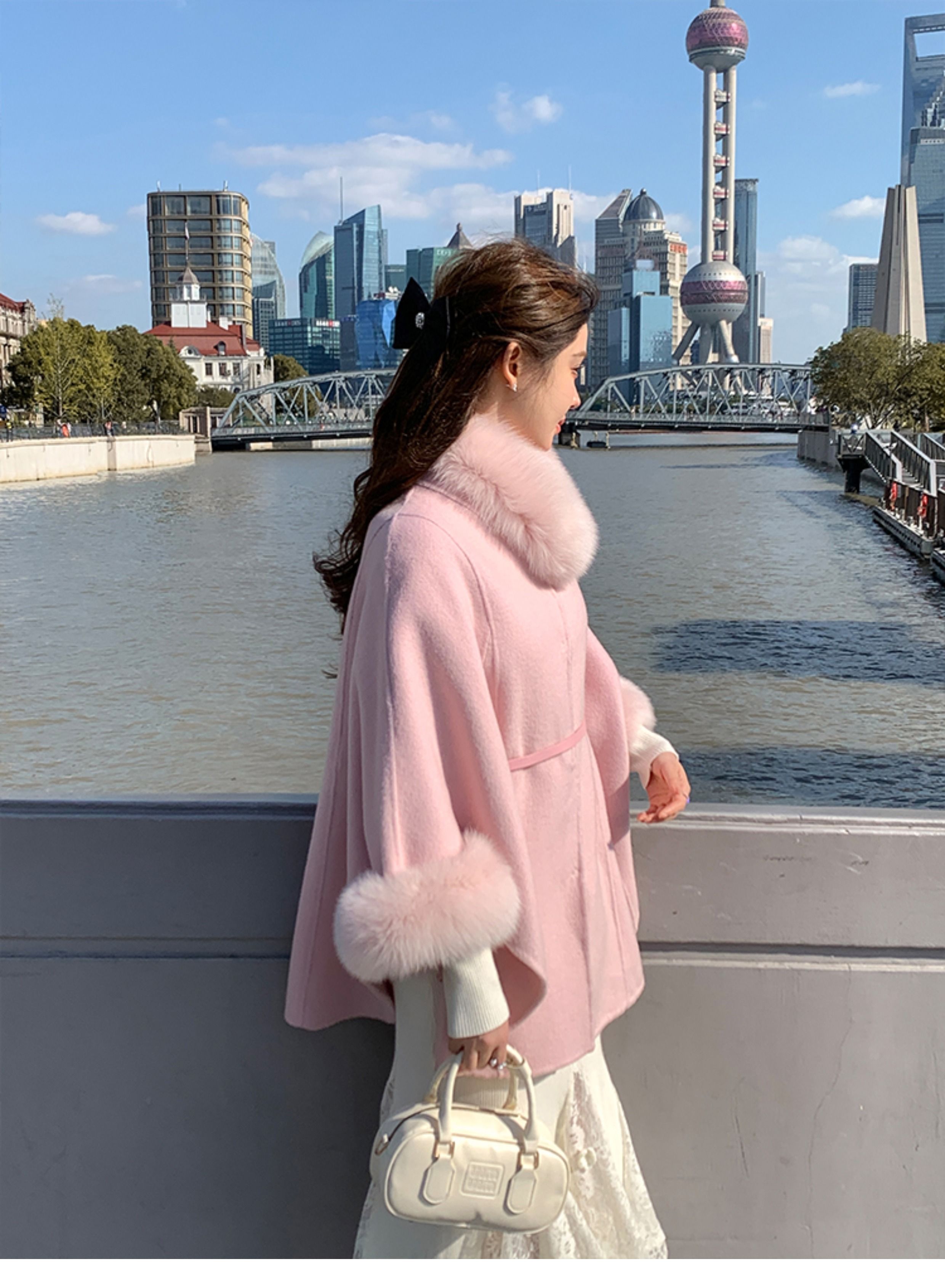 Elegant Double-Sided Wool Coat with Fur Trim in Pink | S, M, L