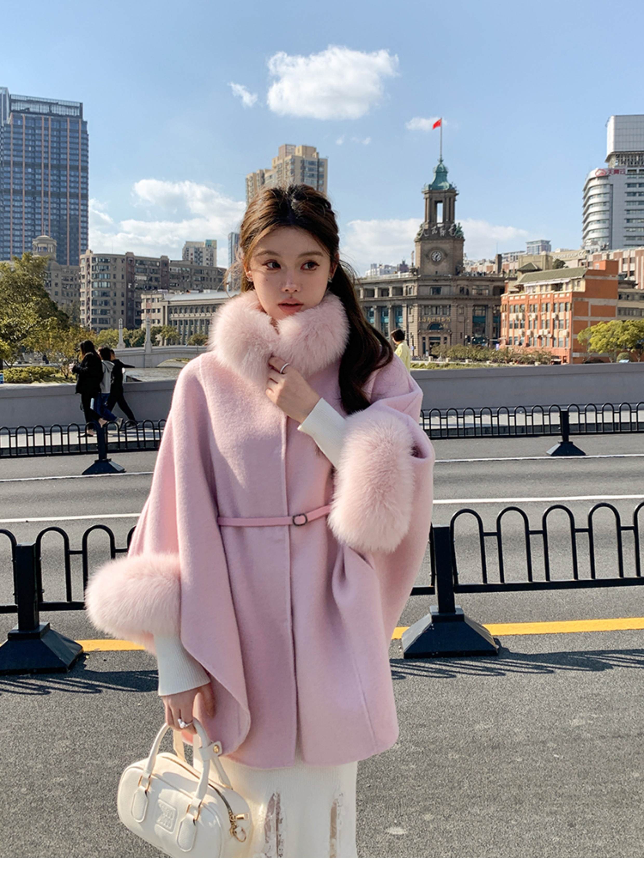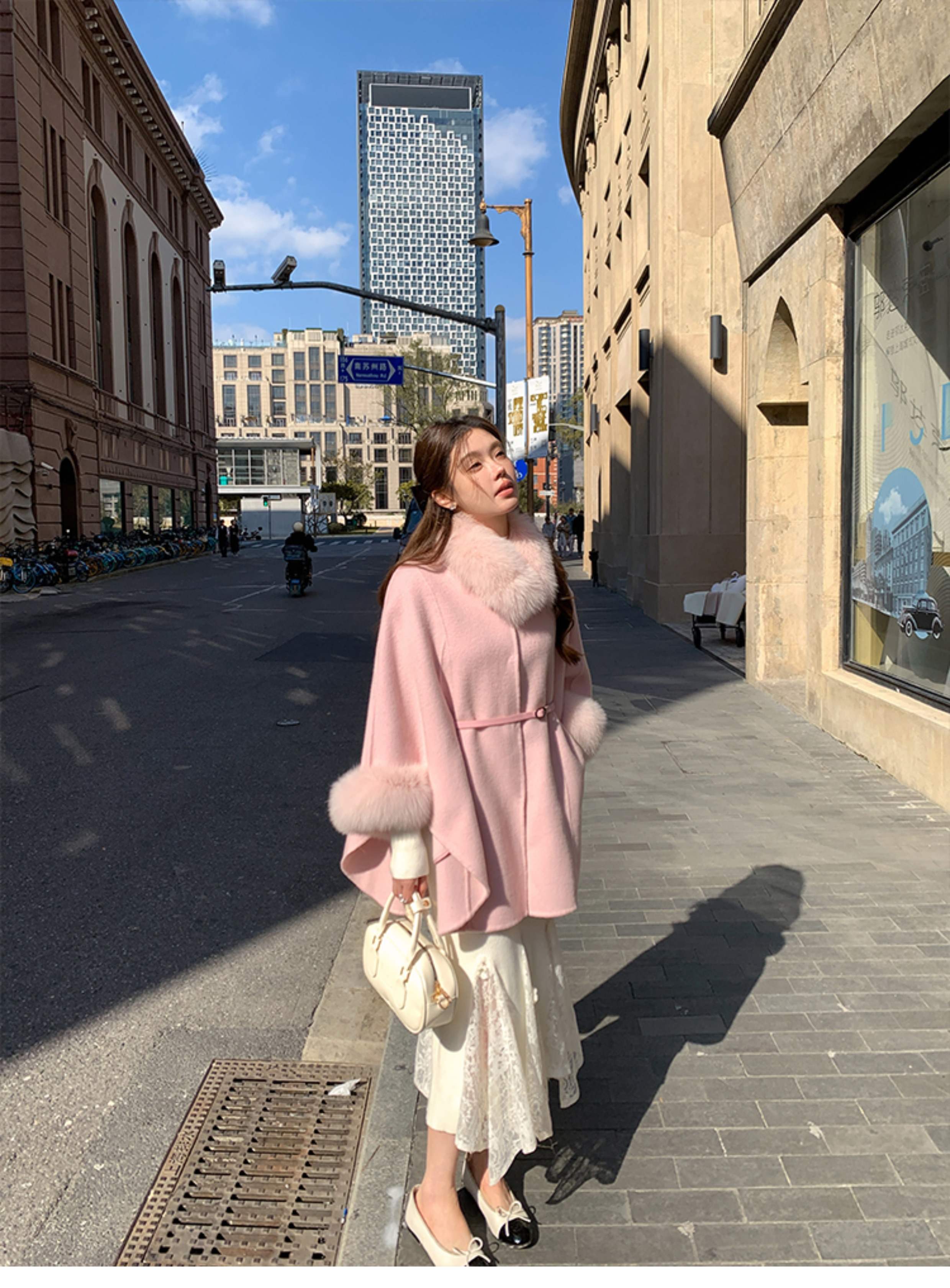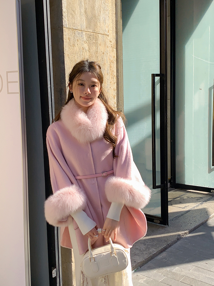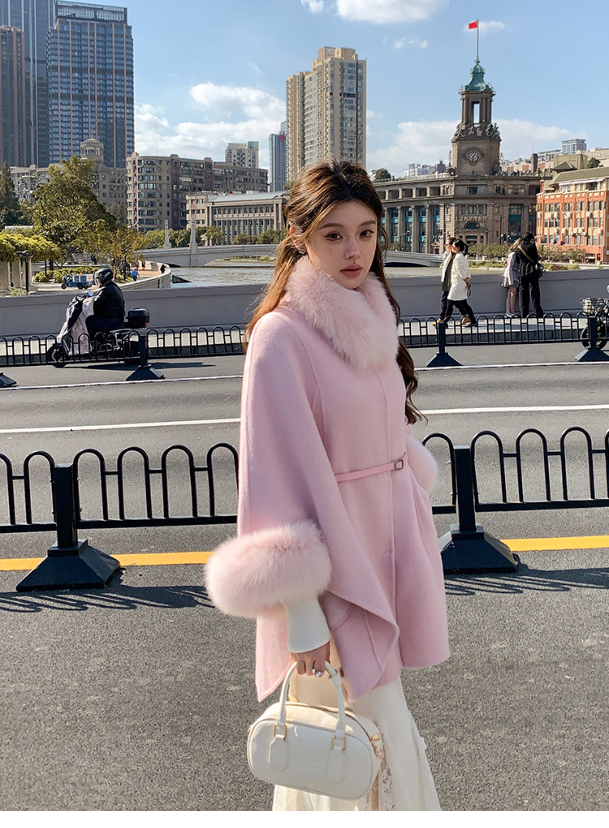 Elegant Double-Sided Wool Coat with Fur Trim in Pink | S, M, L