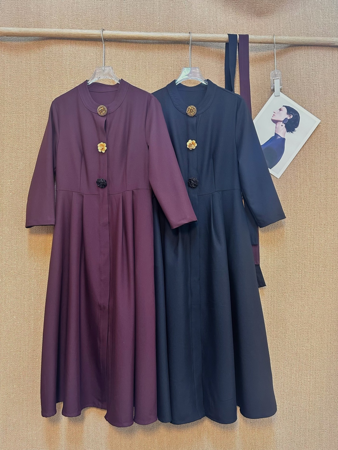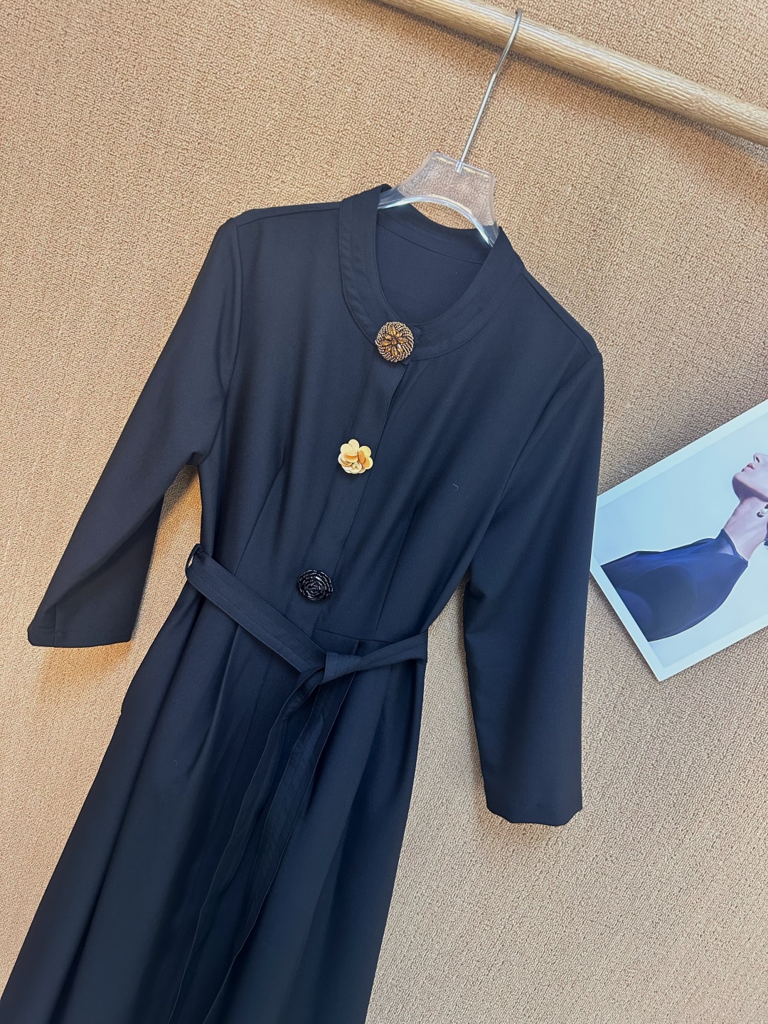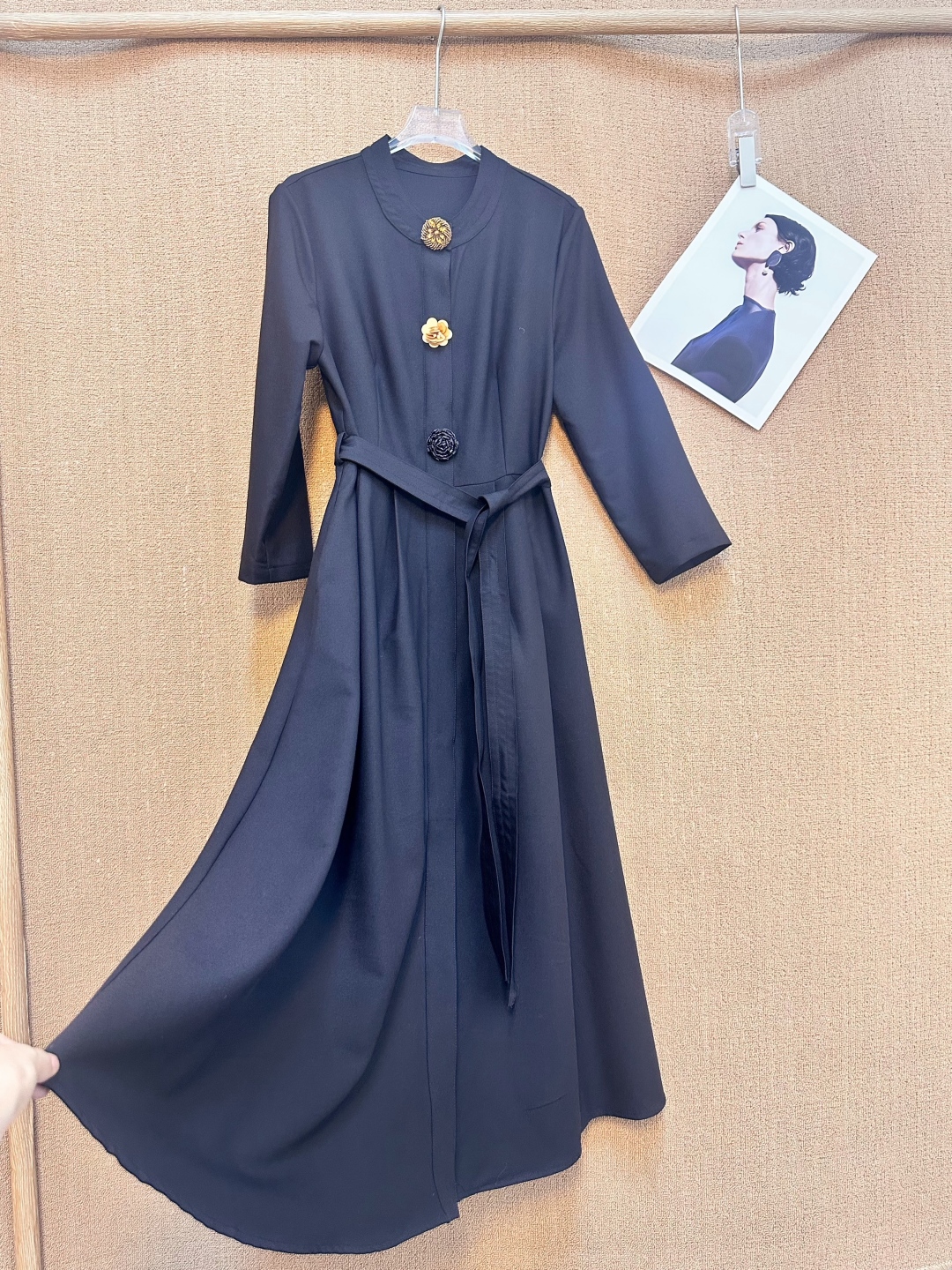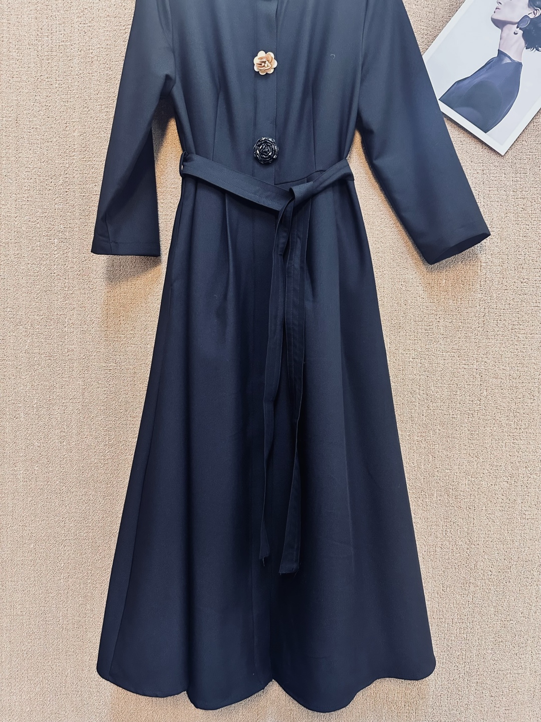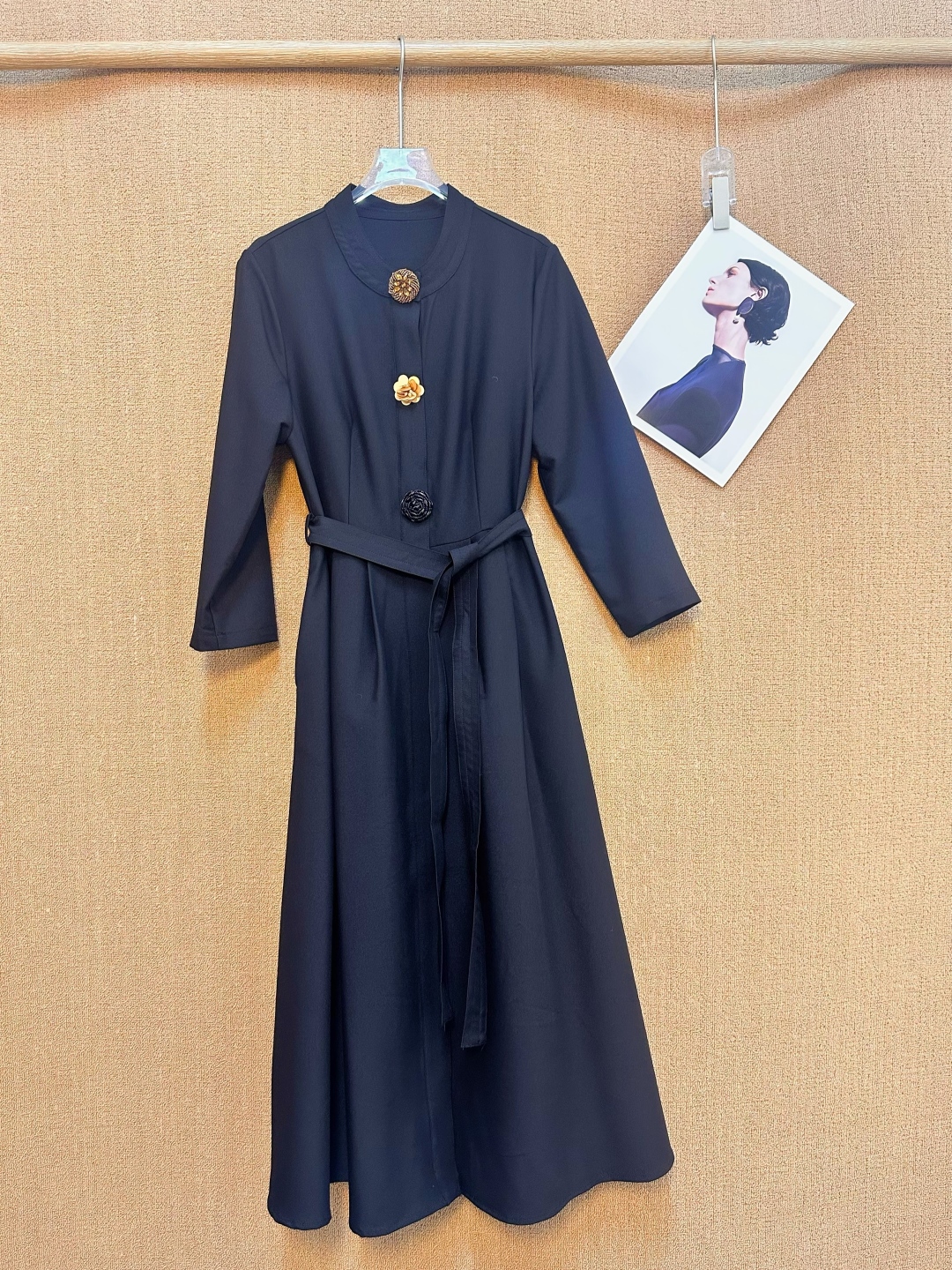 Vintage-inspired midi dress featuring a stand collar, floral button accents, tie-waist, and long sleeves. Perfect for adding a touch of retro elegance to any occasion.