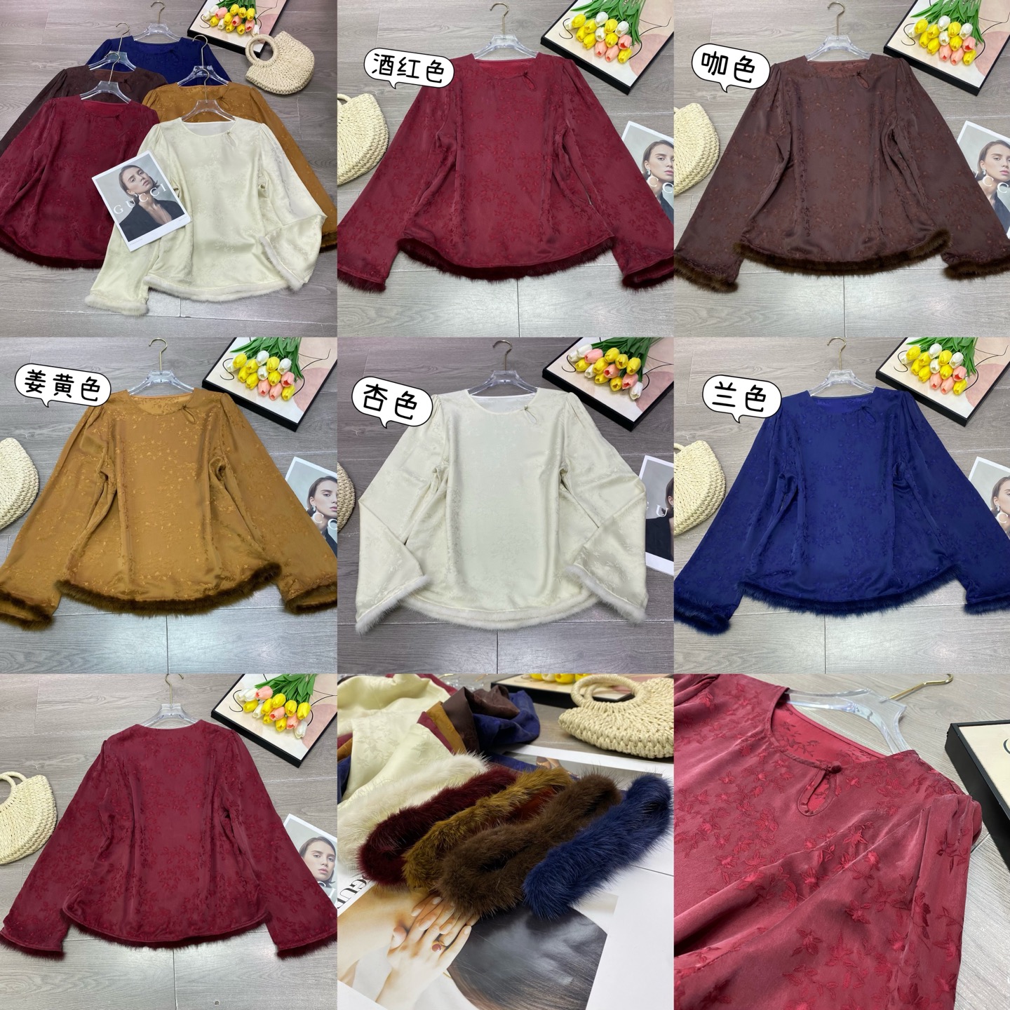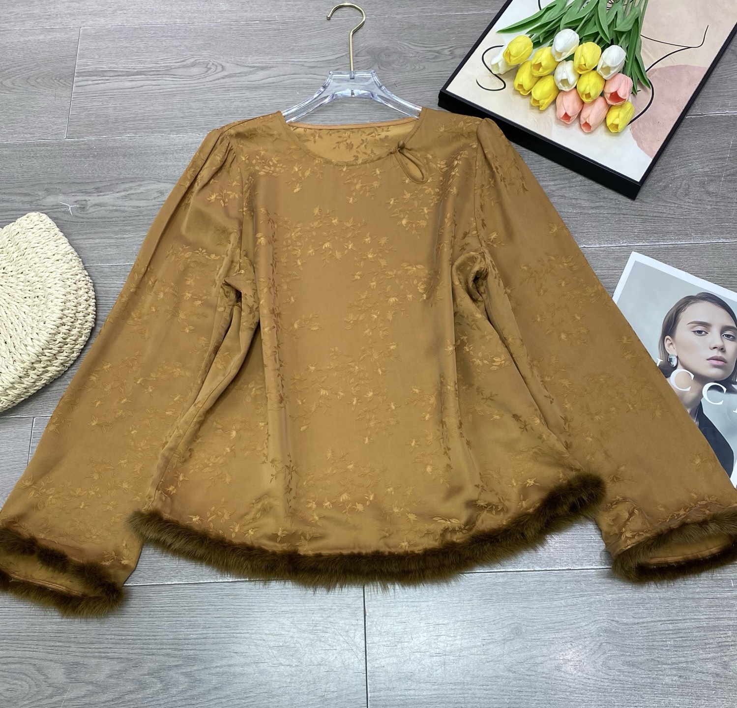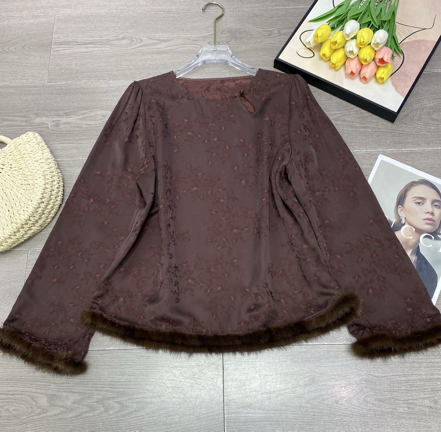 This exquisite long-sleeve top combines classic elegance with modern design. Crafted from high-quality jacquard copper ammonia silk and trimmed with luxurious mink fur, it offers both comfort and sophistication. Perfect for adding a touch of glamour to any outfit.