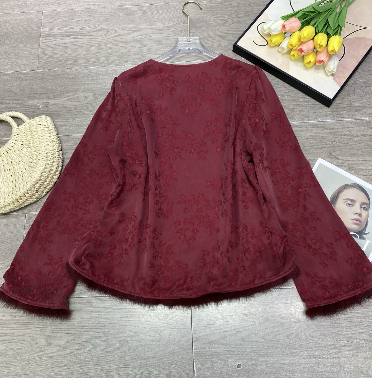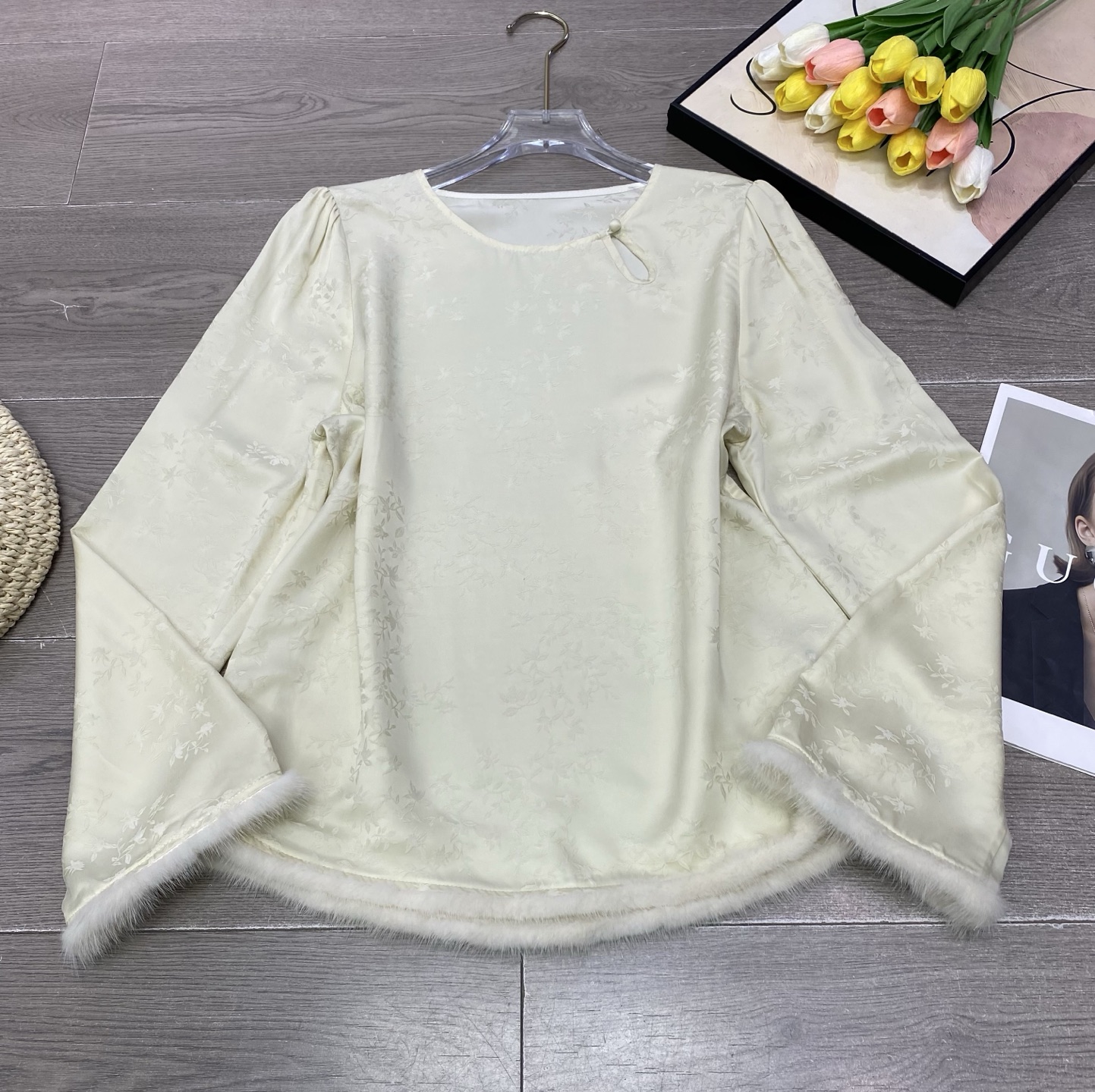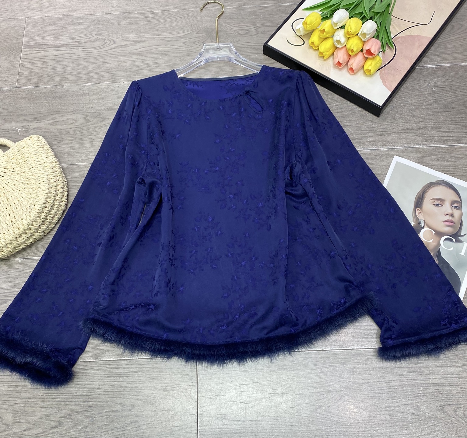 This exquisite long-sleeve top combines classic elegance with modern design. Crafted from high-quality jacquard copper ammonia silk and trimmed with luxurious mink fur, it offers both comfort and sophistication. Perfect for adding a touch of glamour to any outfit.
