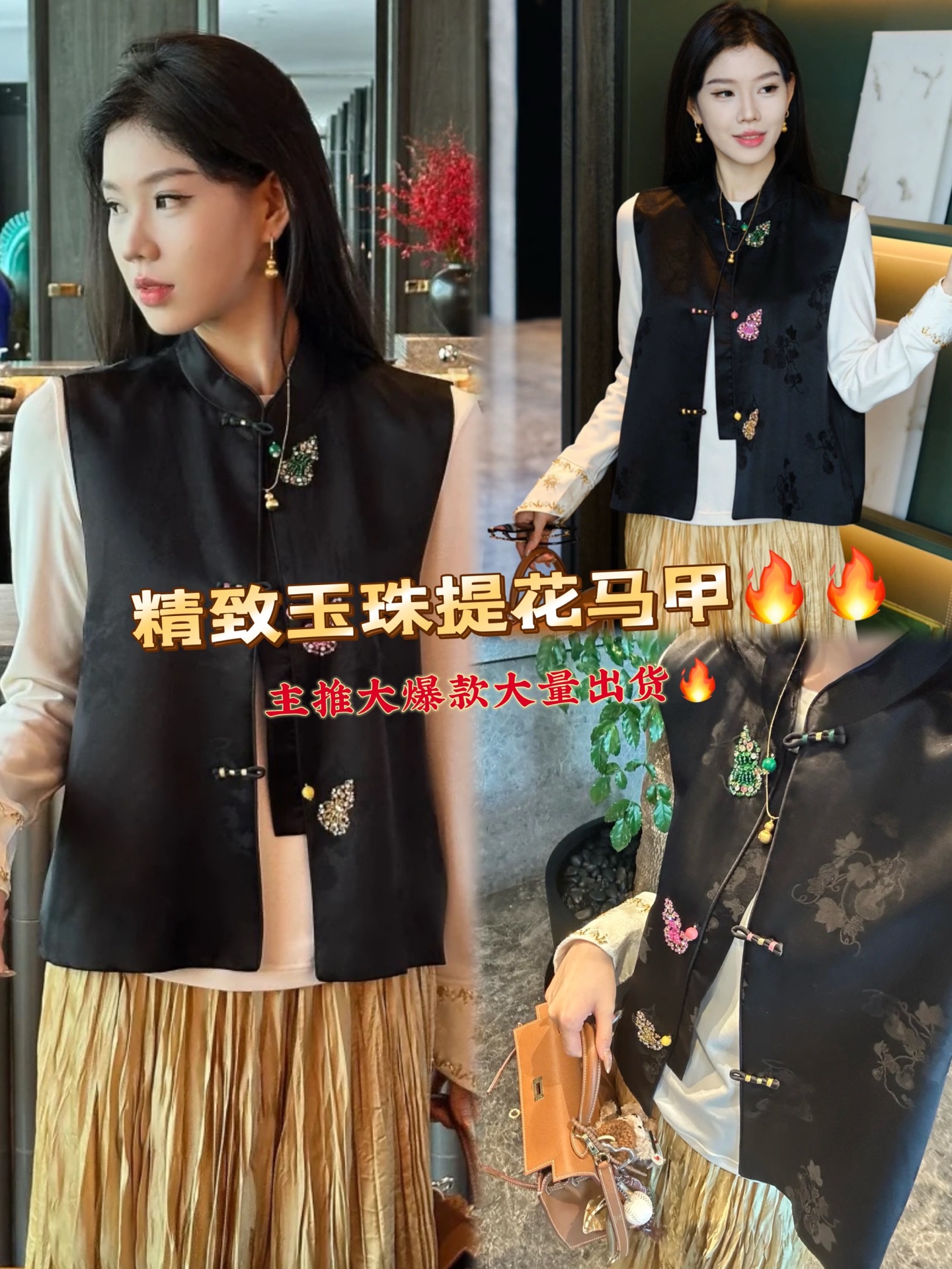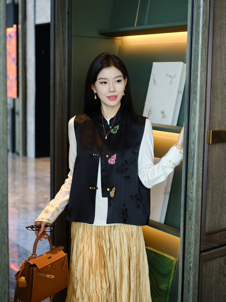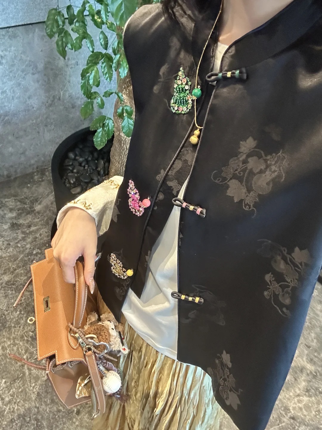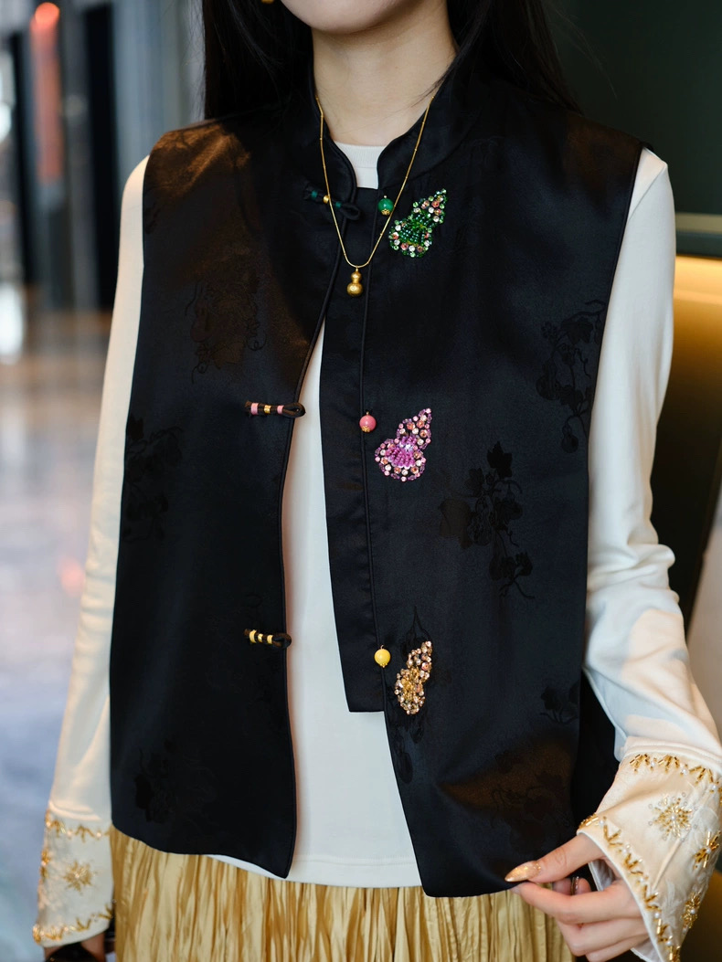 Elevate your style with this exquisite jacquard vest featuring delicate jade bead embellishments. A timeless piece with a touch of vintage charm.