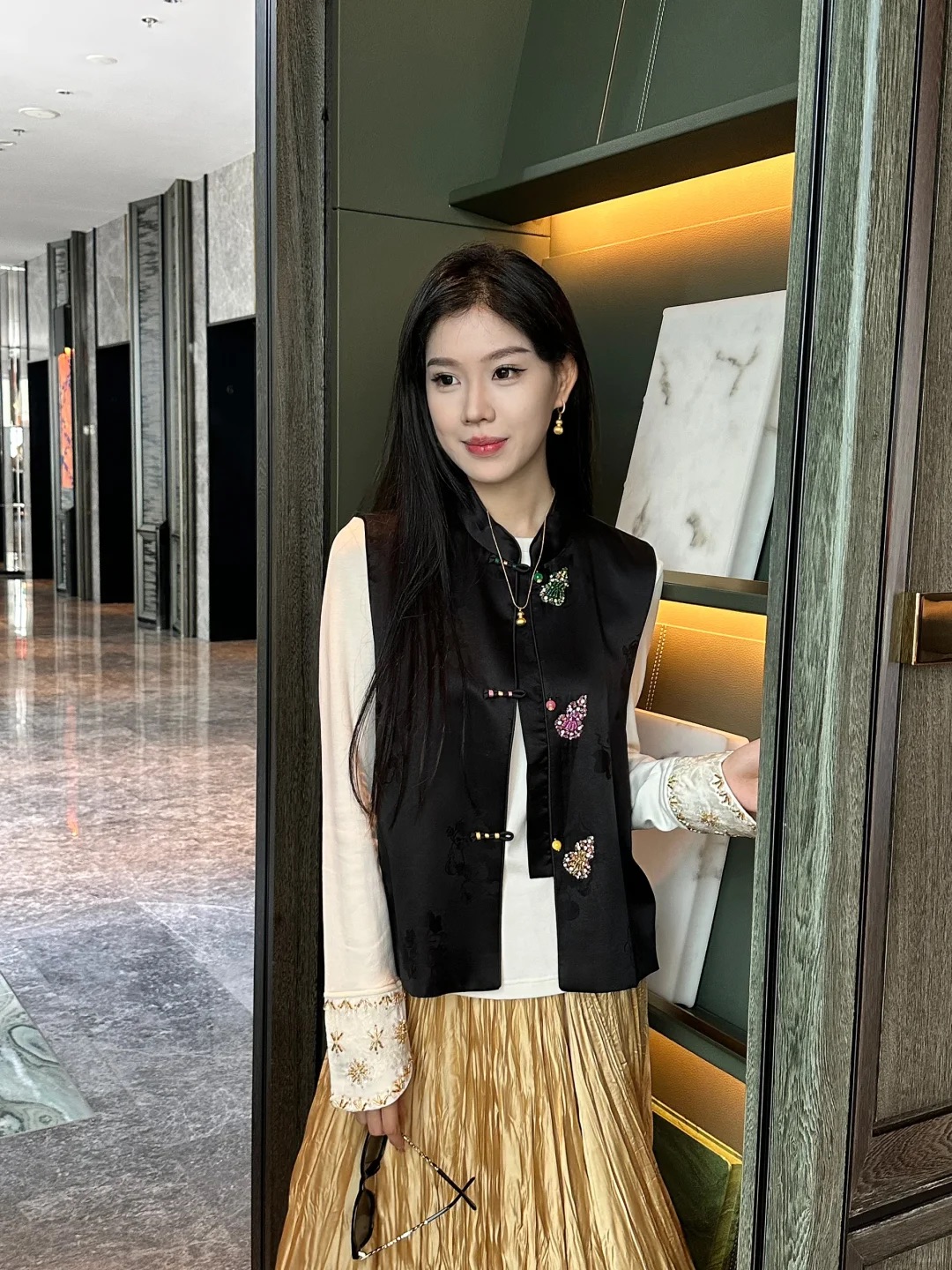 Elegant Jacquard Jade Bead Embellished Vest, Vintage Style Stand Collar Top