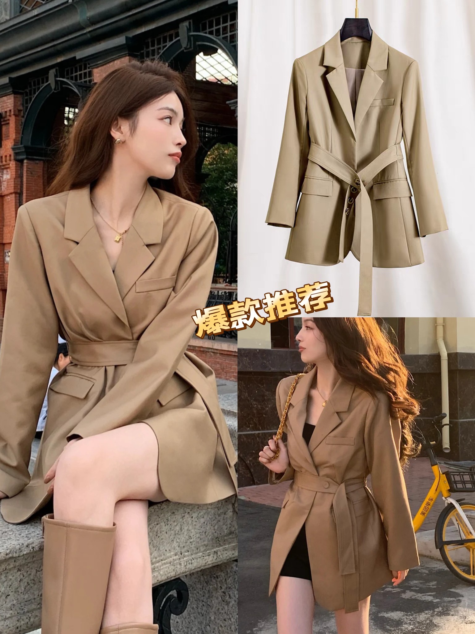 Elegant Women's Khaki Blazer Dress with Belt - Slim Fit, Chic Style