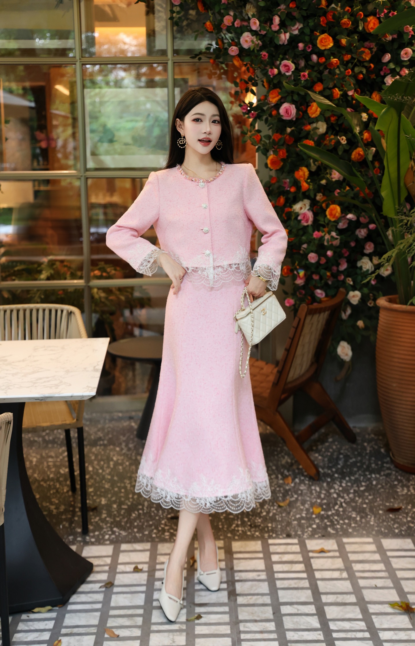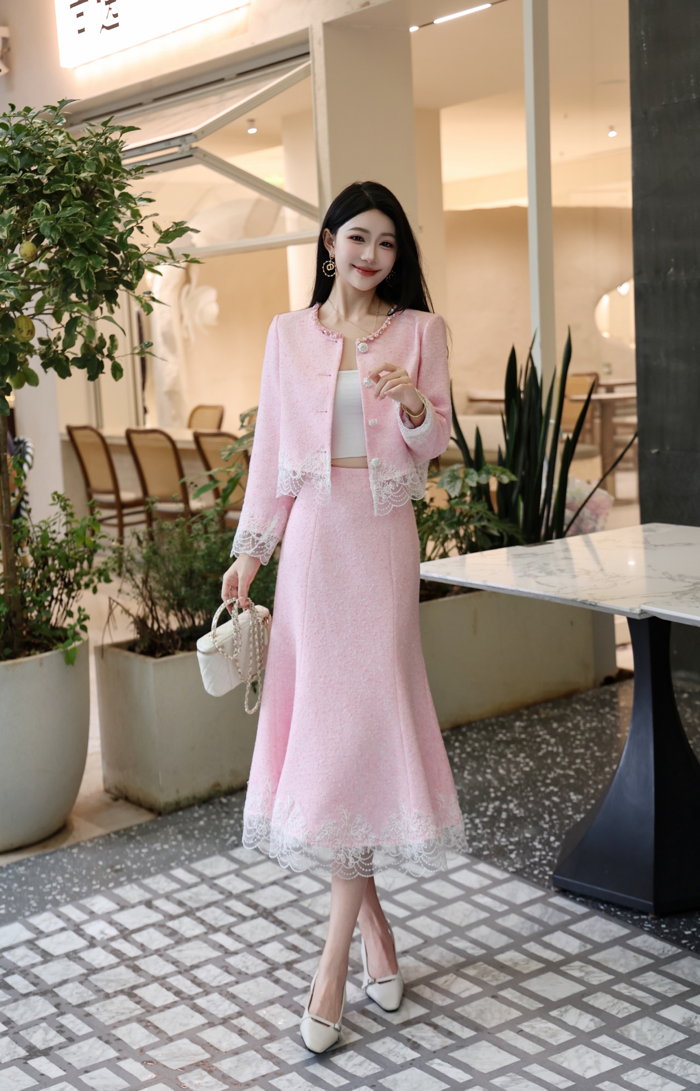 This chic tweed skirt set is a must-have for your autumn wardrobe. The delicate lace trim adds a touch of elegance, making it perfect for both casual and formal occasions.