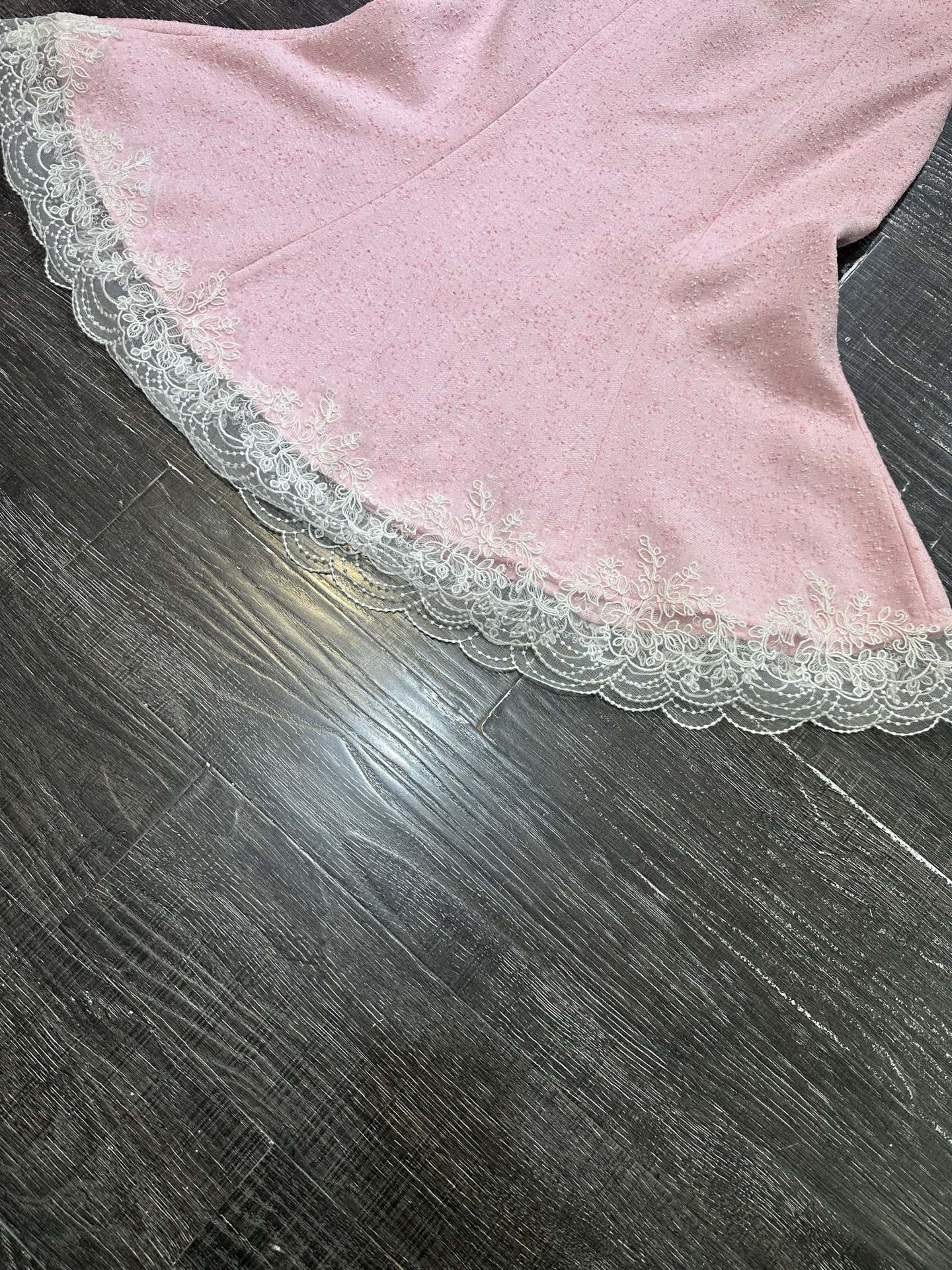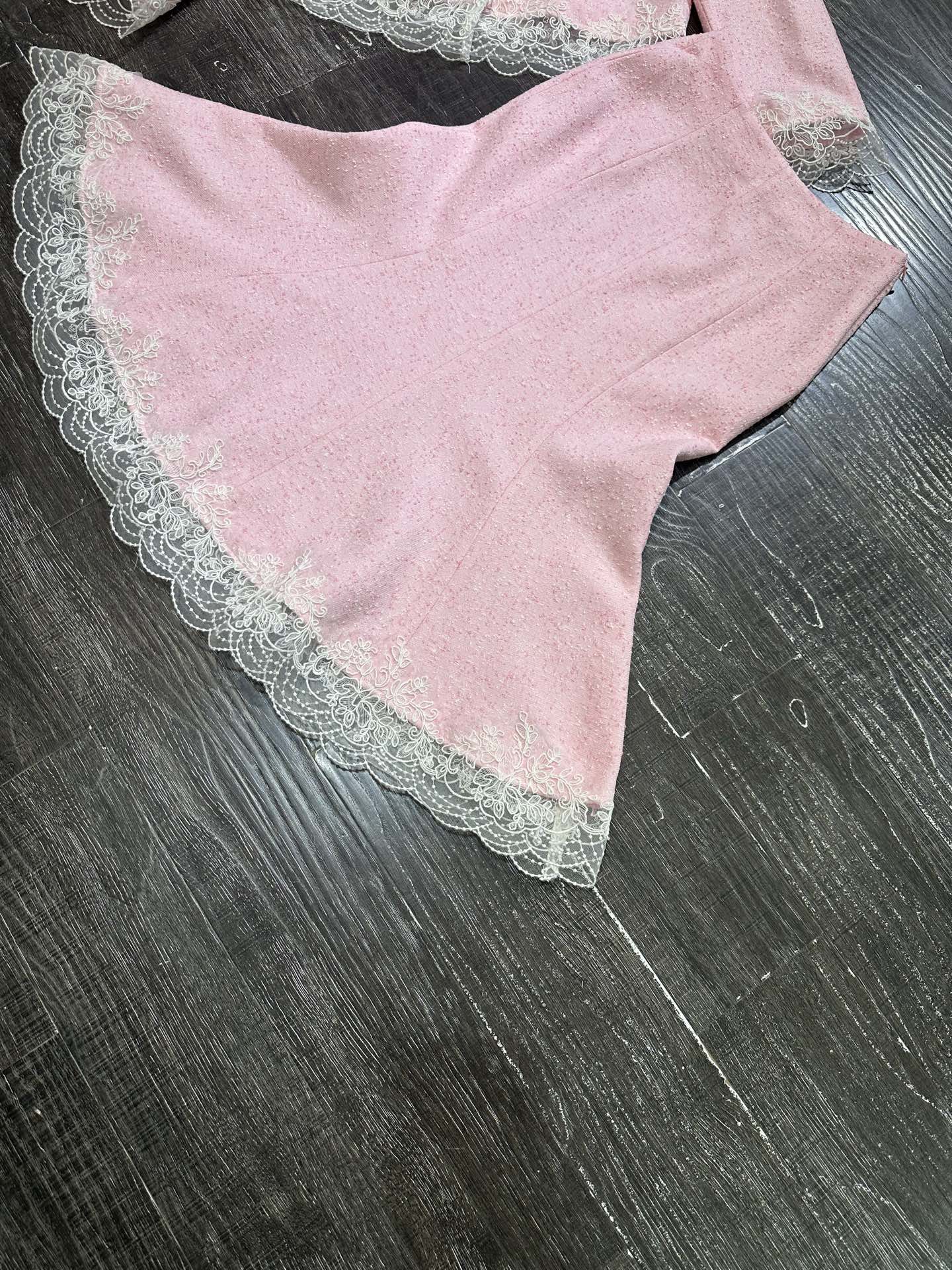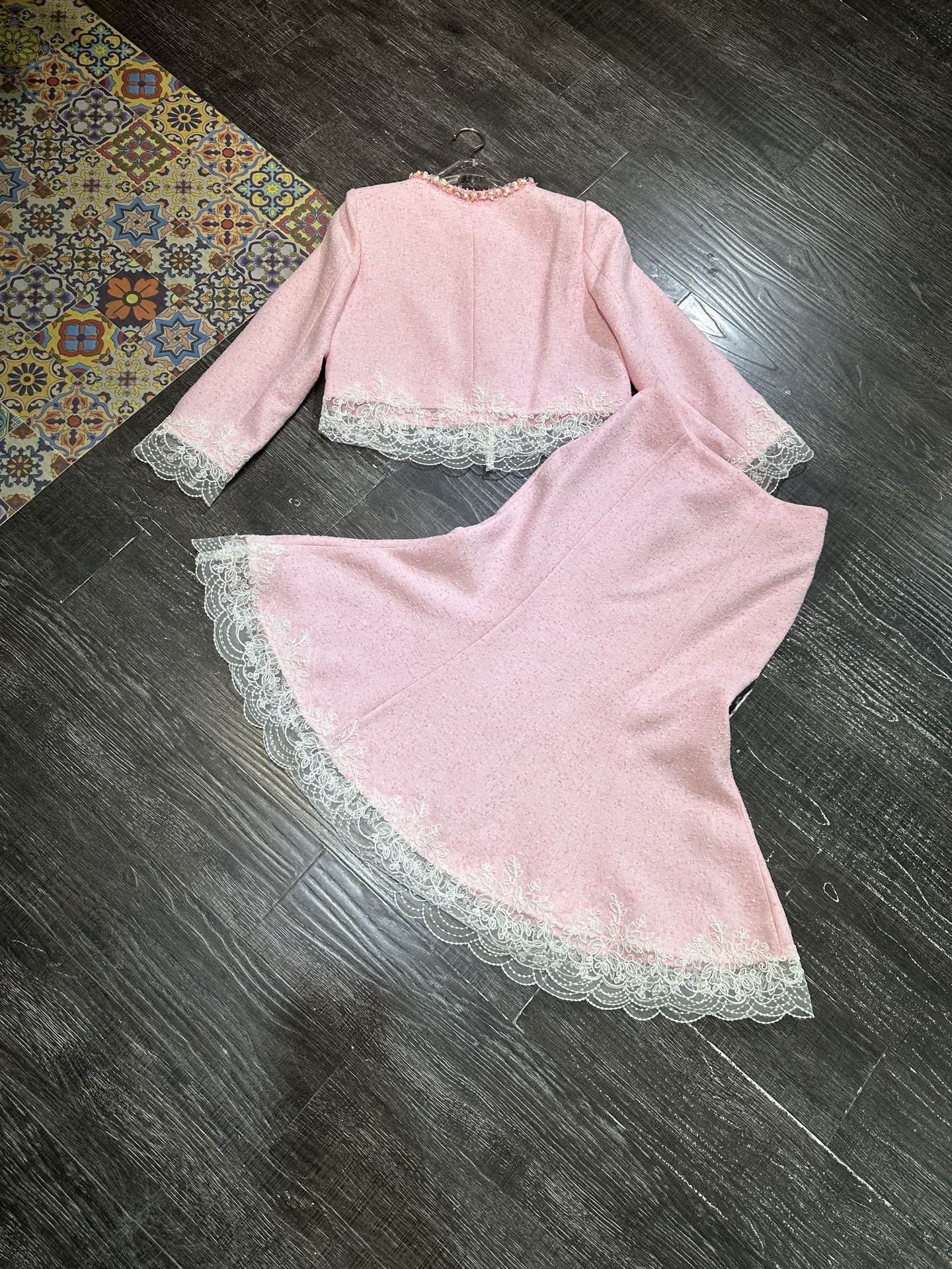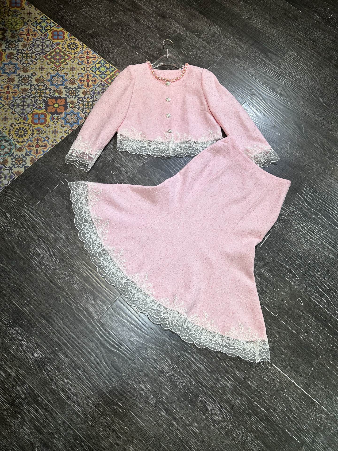 Elevate your style with this elegant tweed skirt set featuring delicate lace trim. Perfect for autumn, this outfit exudes sophistication and grace.