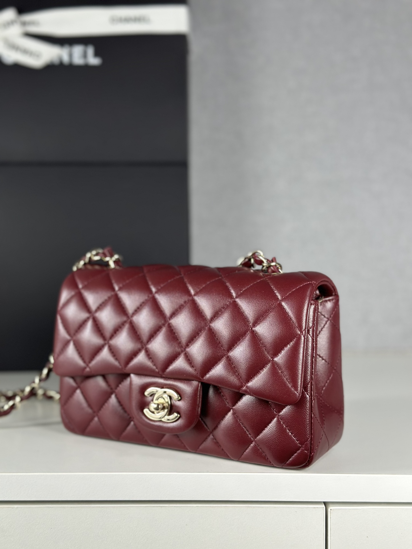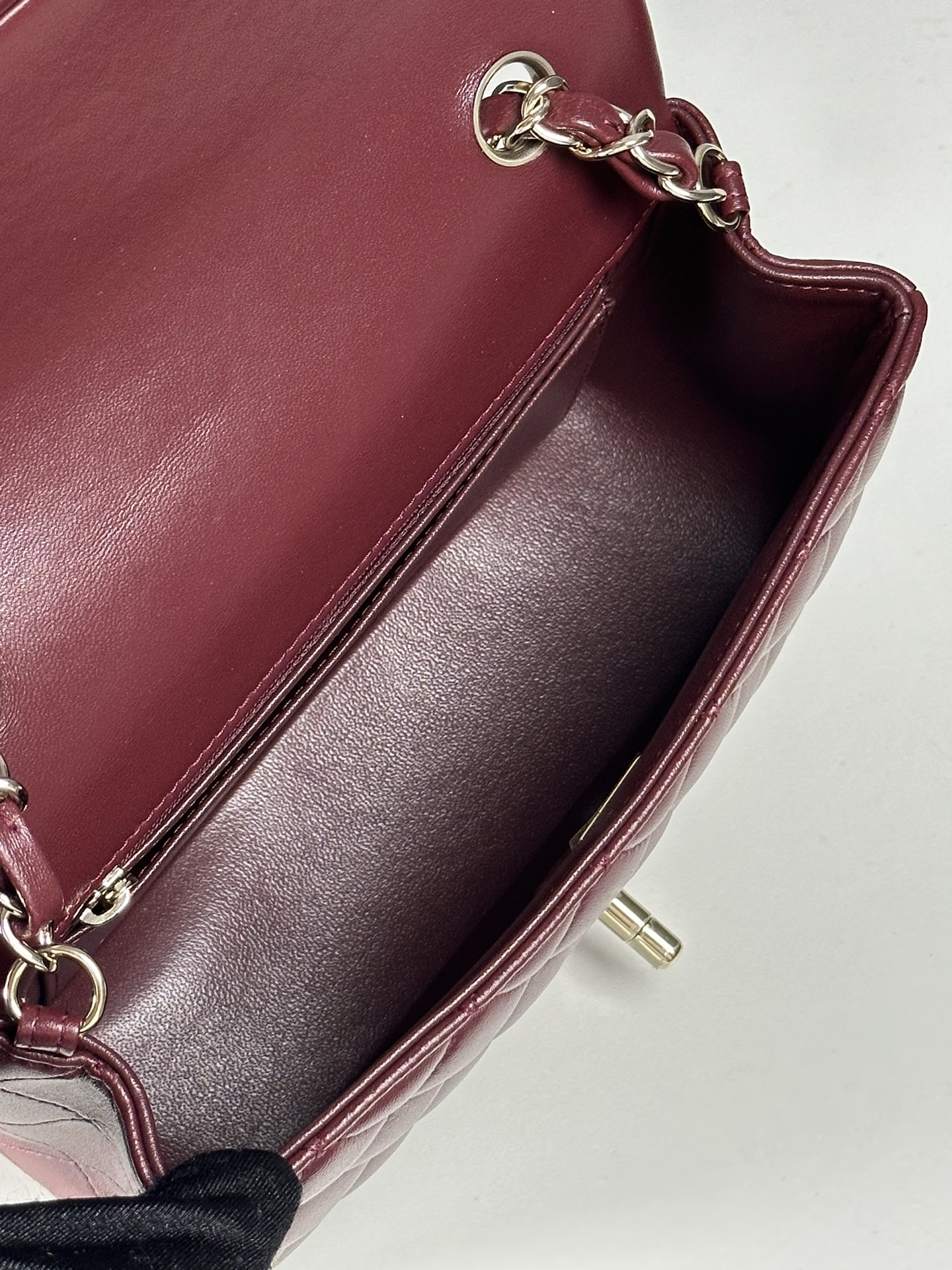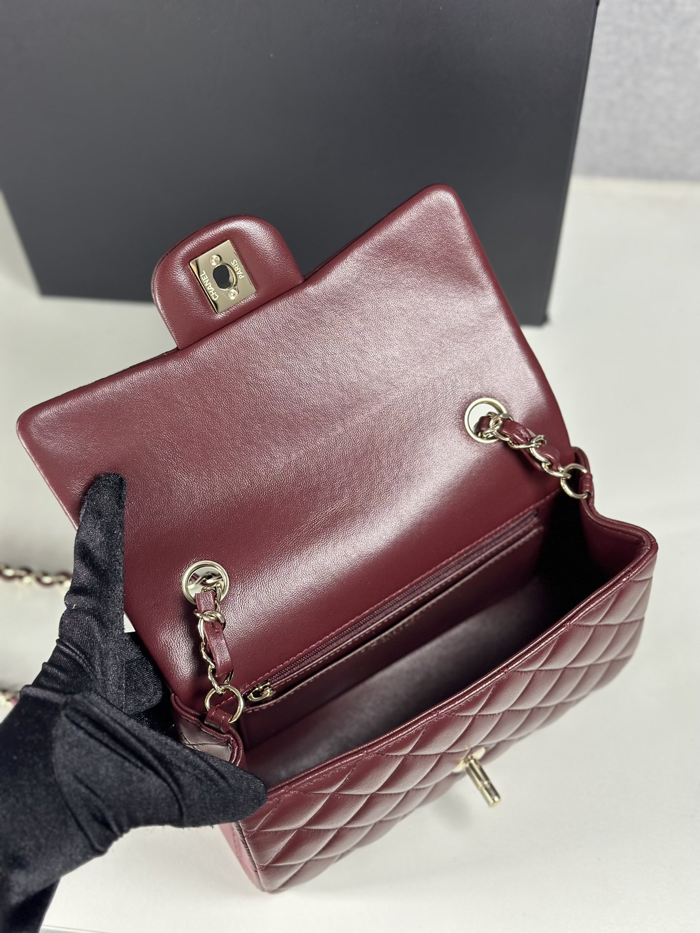 Elevate your style with this chic mini flap bag. Crafted from premium lambskin in a deep burgundy hue, complemented by exquisite gold hardware.