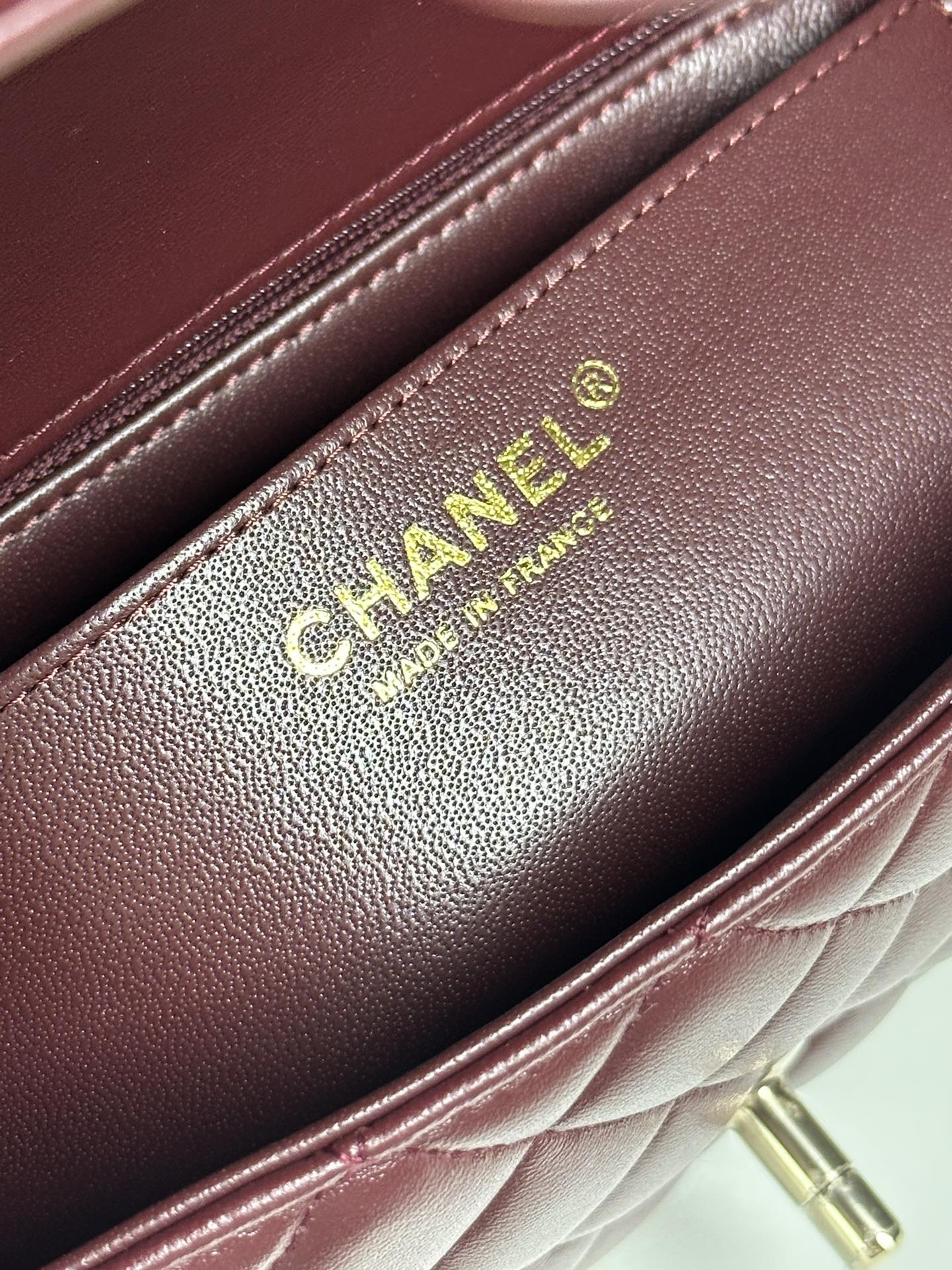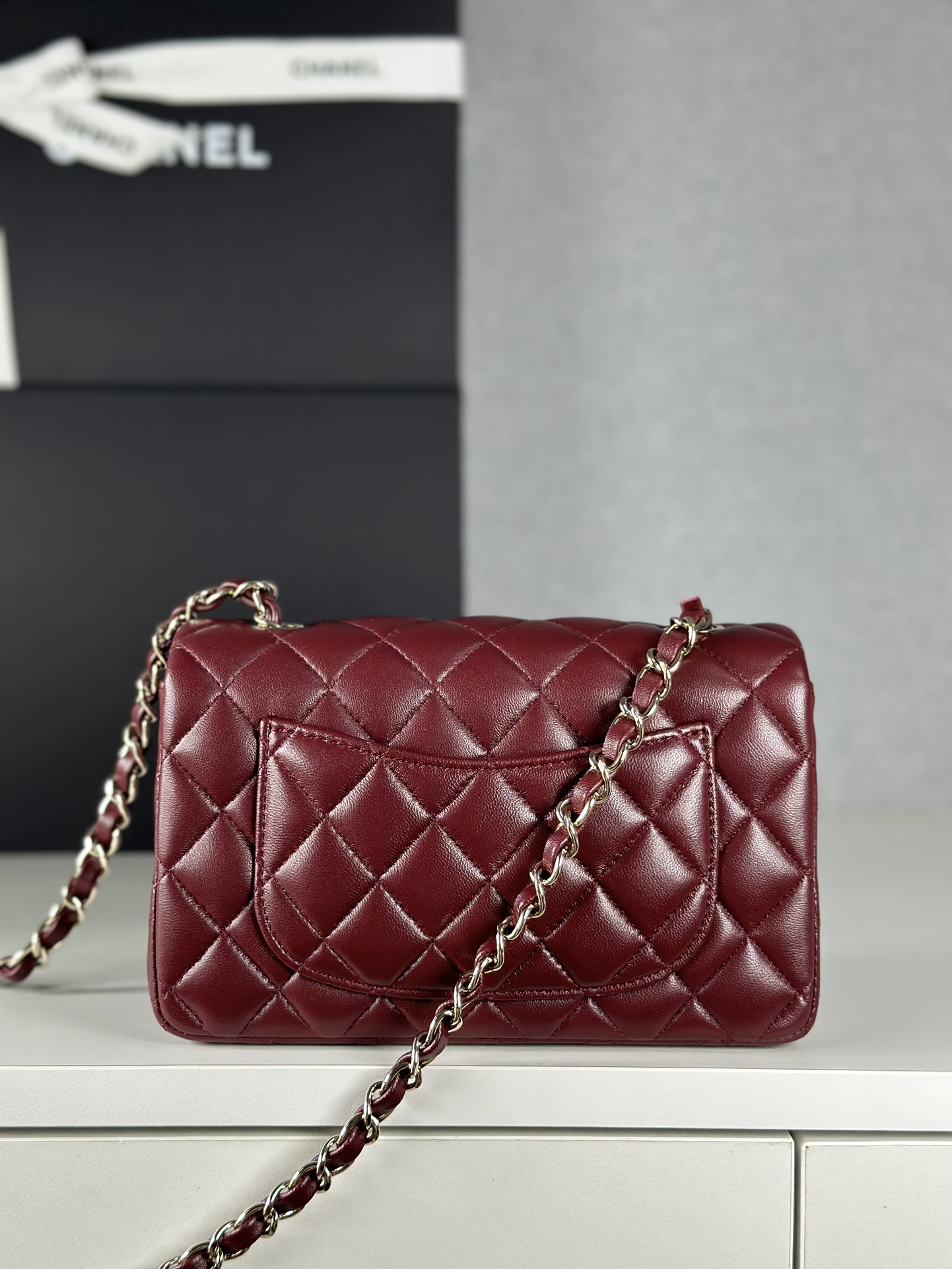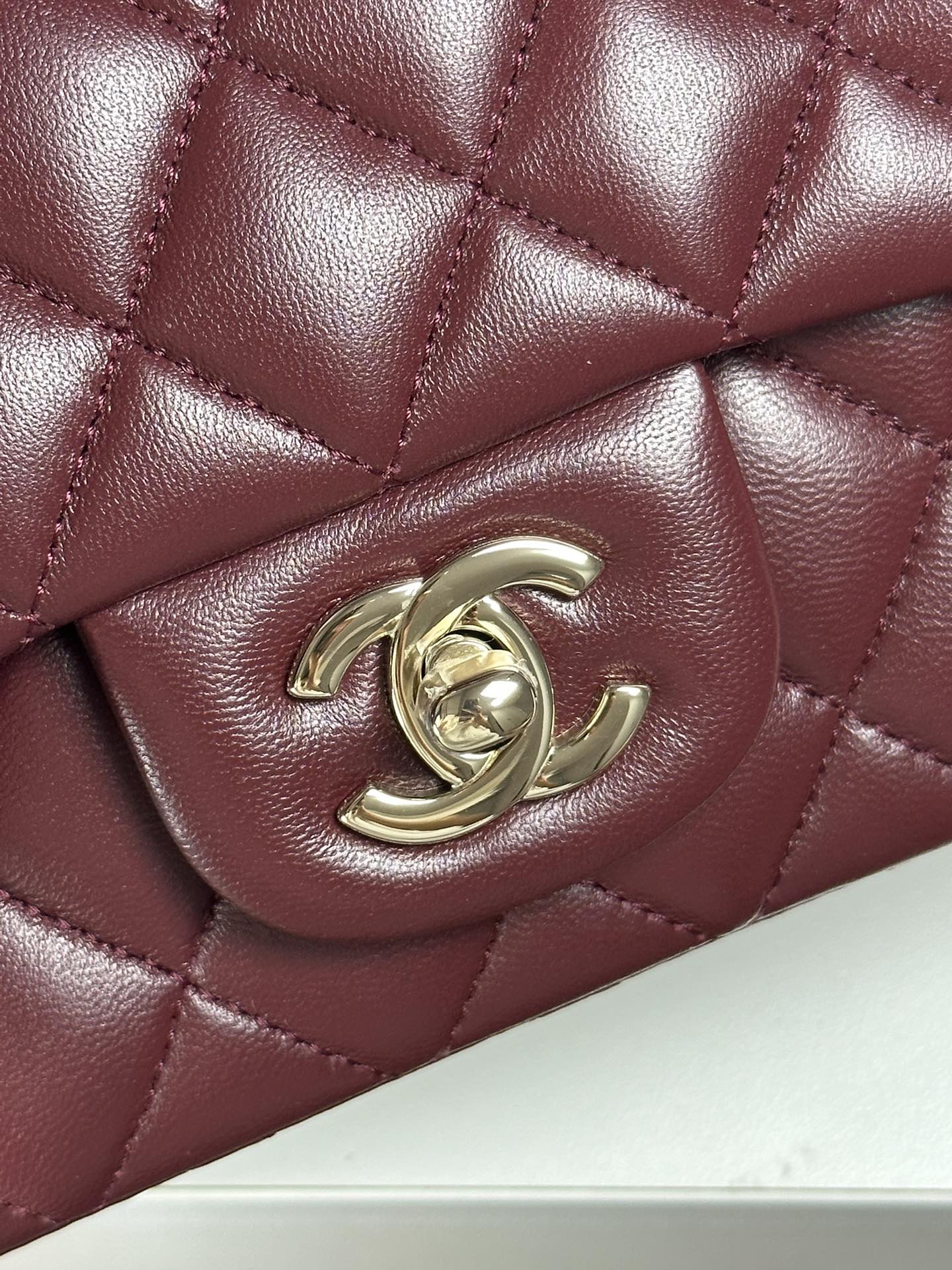 Elevate your style with this chic mini flap bag. Crafted from premium lambskin in a deep burgundy hue, complemented by exquisite gold hardware.