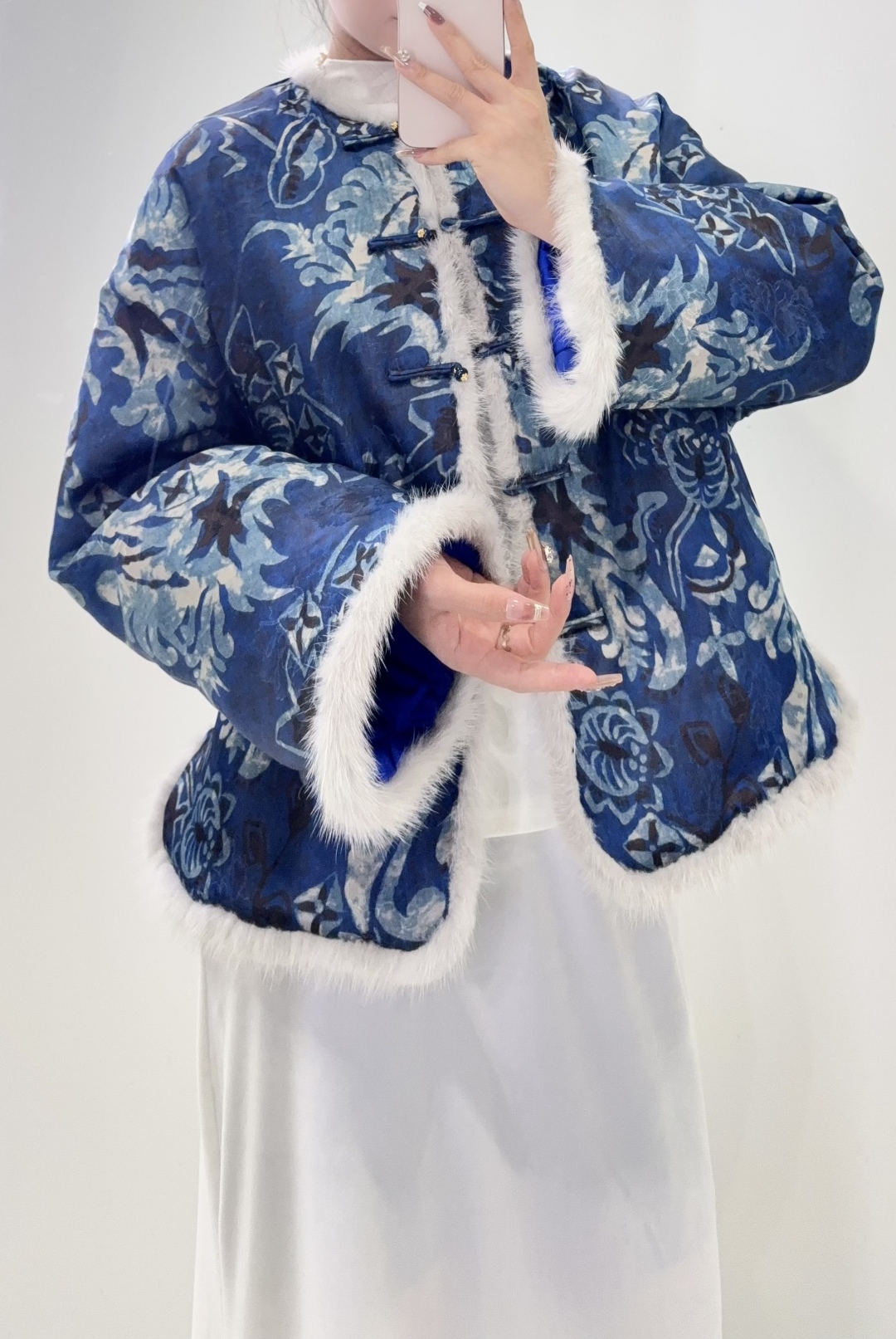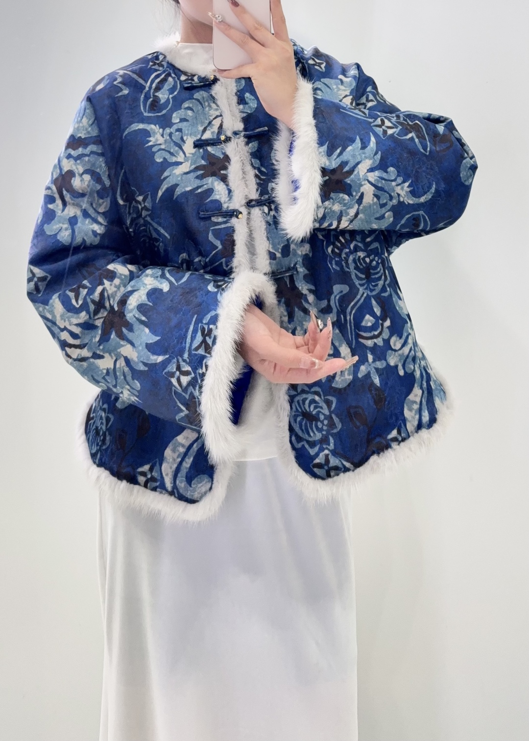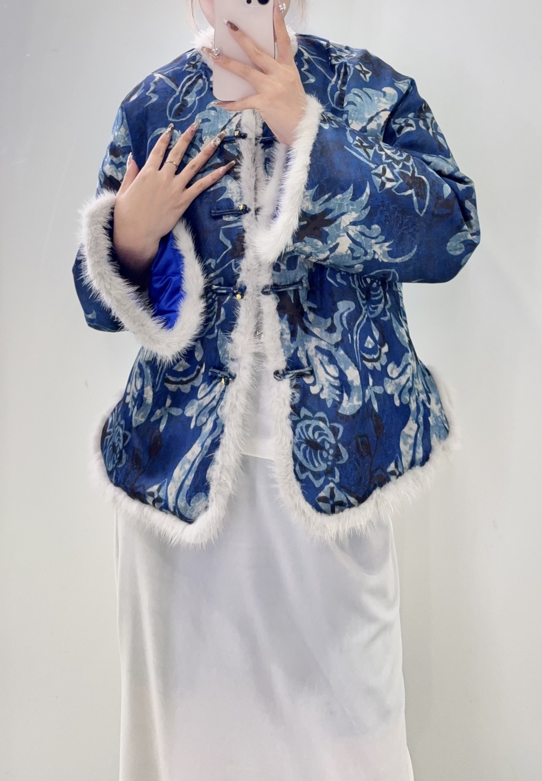 Experience timeless elegance with this mink fur trimmed floral print jacket. Its relaxed fit and mandarin collar create a vintage chic.