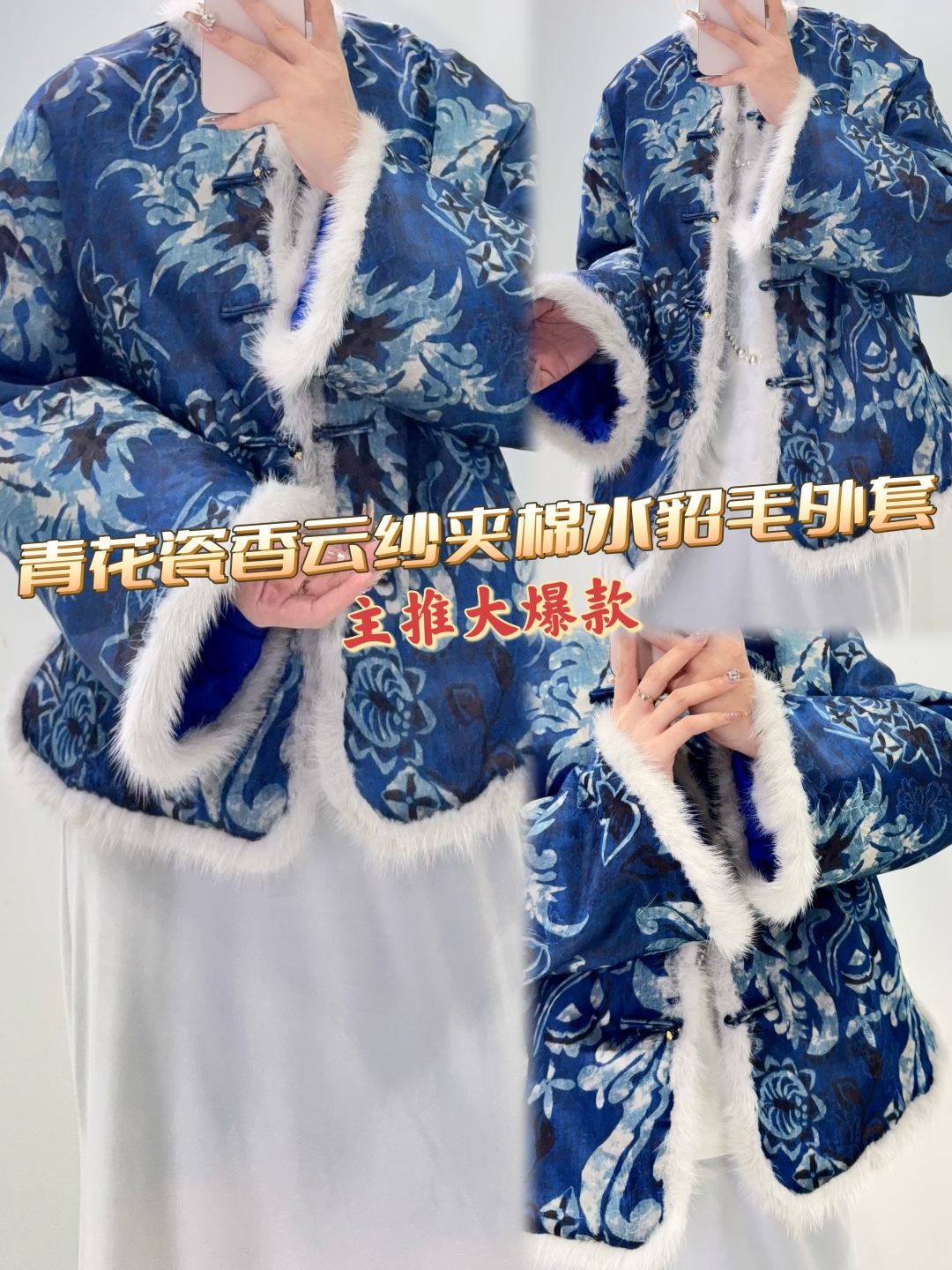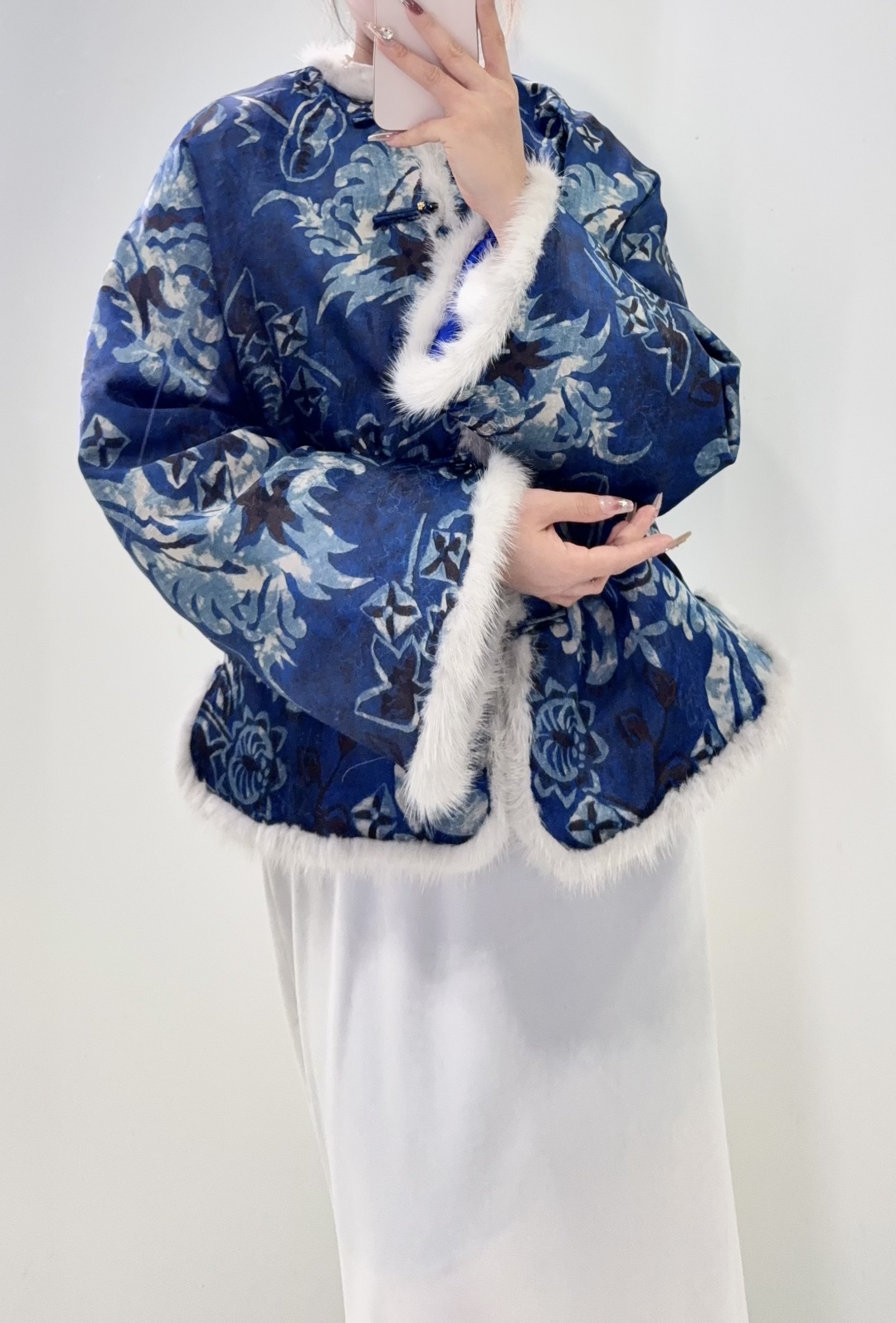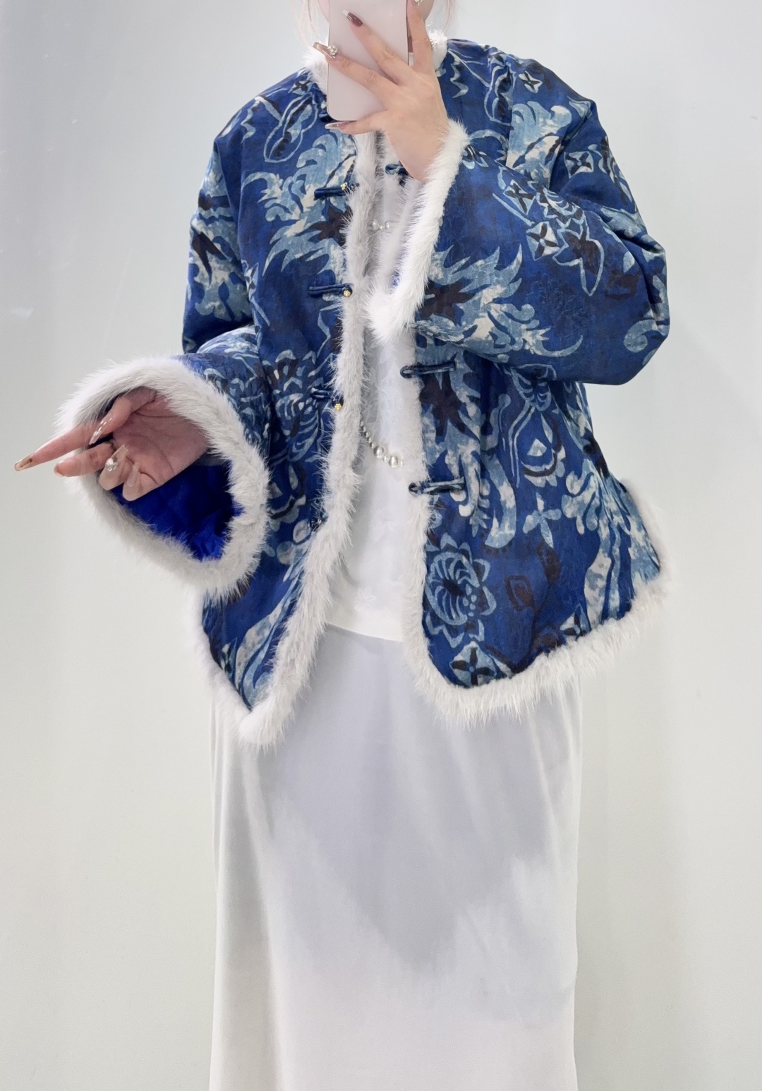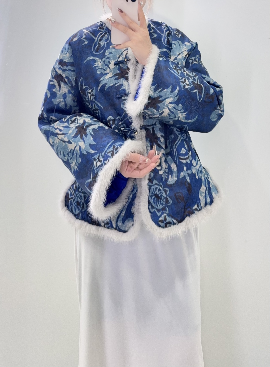 Experience timeless elegance with this mink fur trimmed floral print jacket. Its relaxed fit and mandarin collar create a vintage chic.