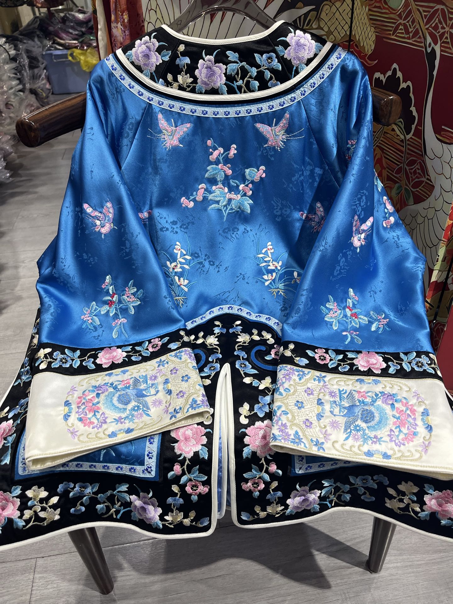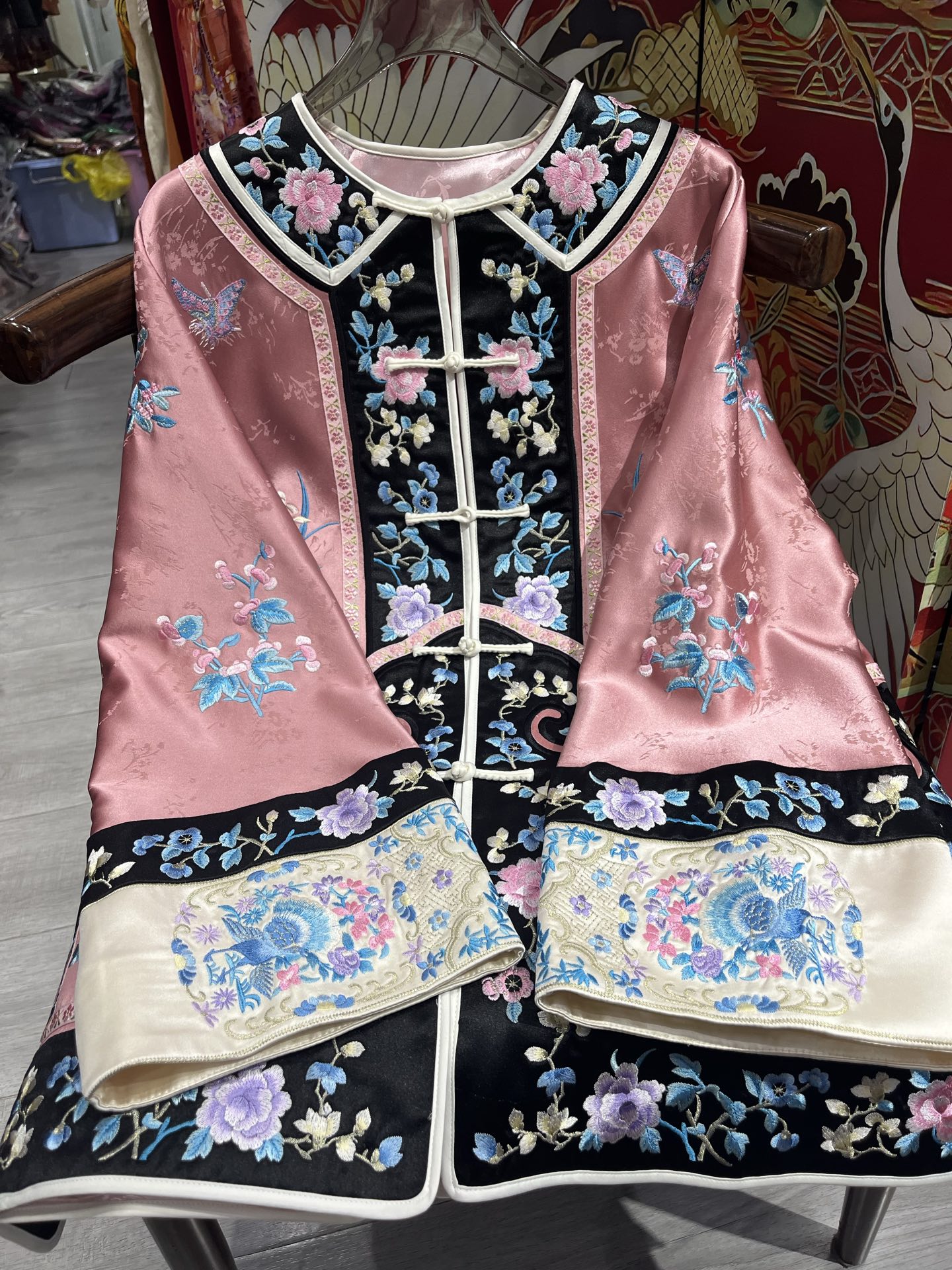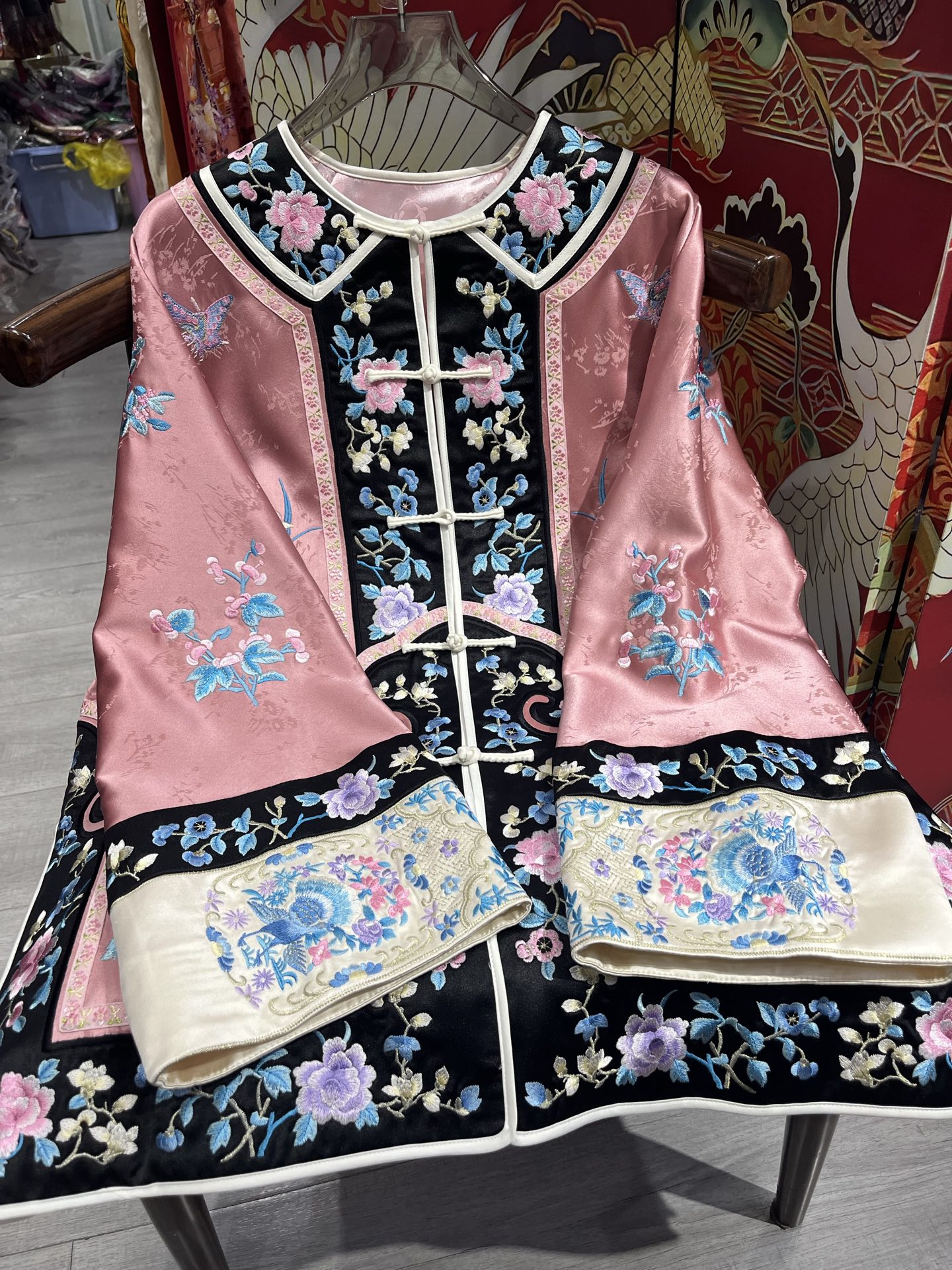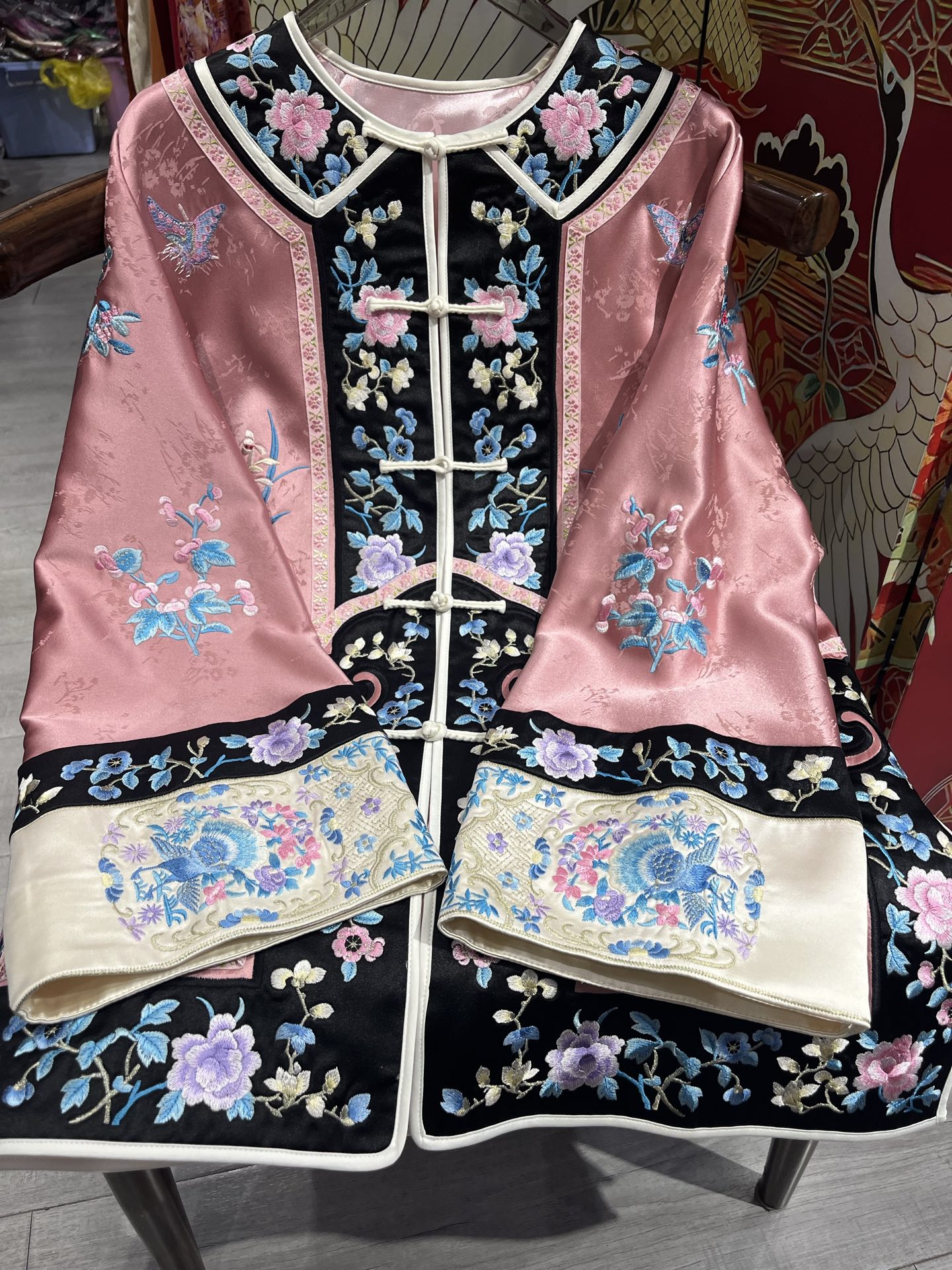 This exquisite jacket blends traditional Chinese aesthetics with modern fashion sensibilities. The design features delicate floral and butterfly embroidery on luxurious acetate jacquard fabric, creating a garment that is both visually stunning and comfortable to wear.