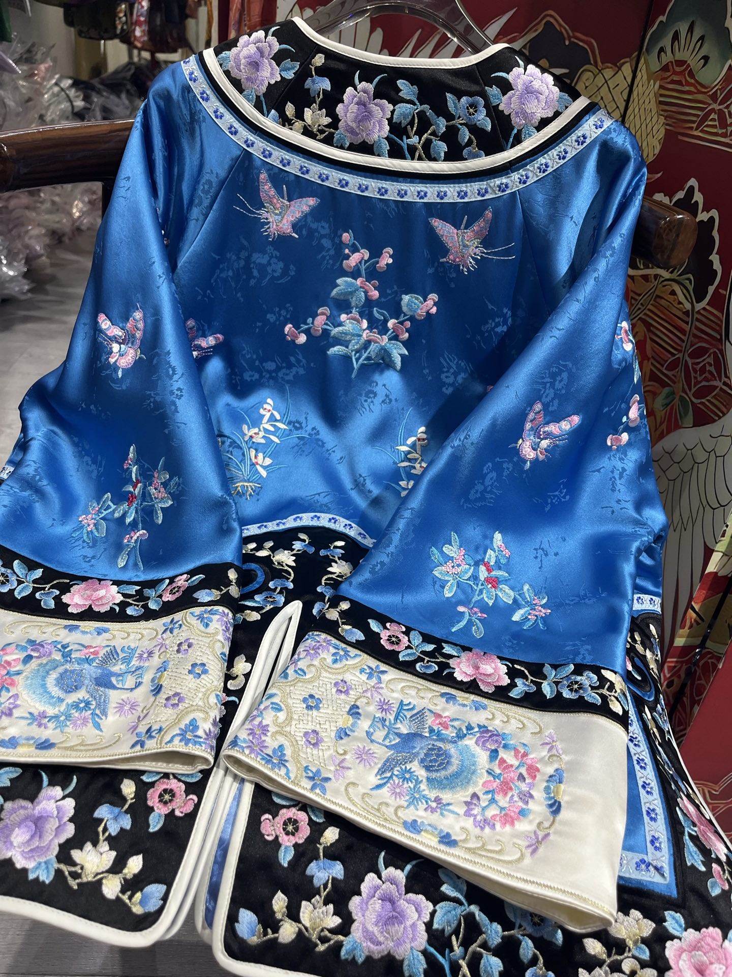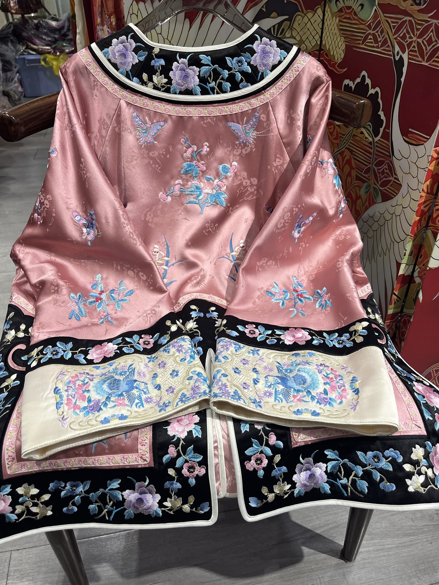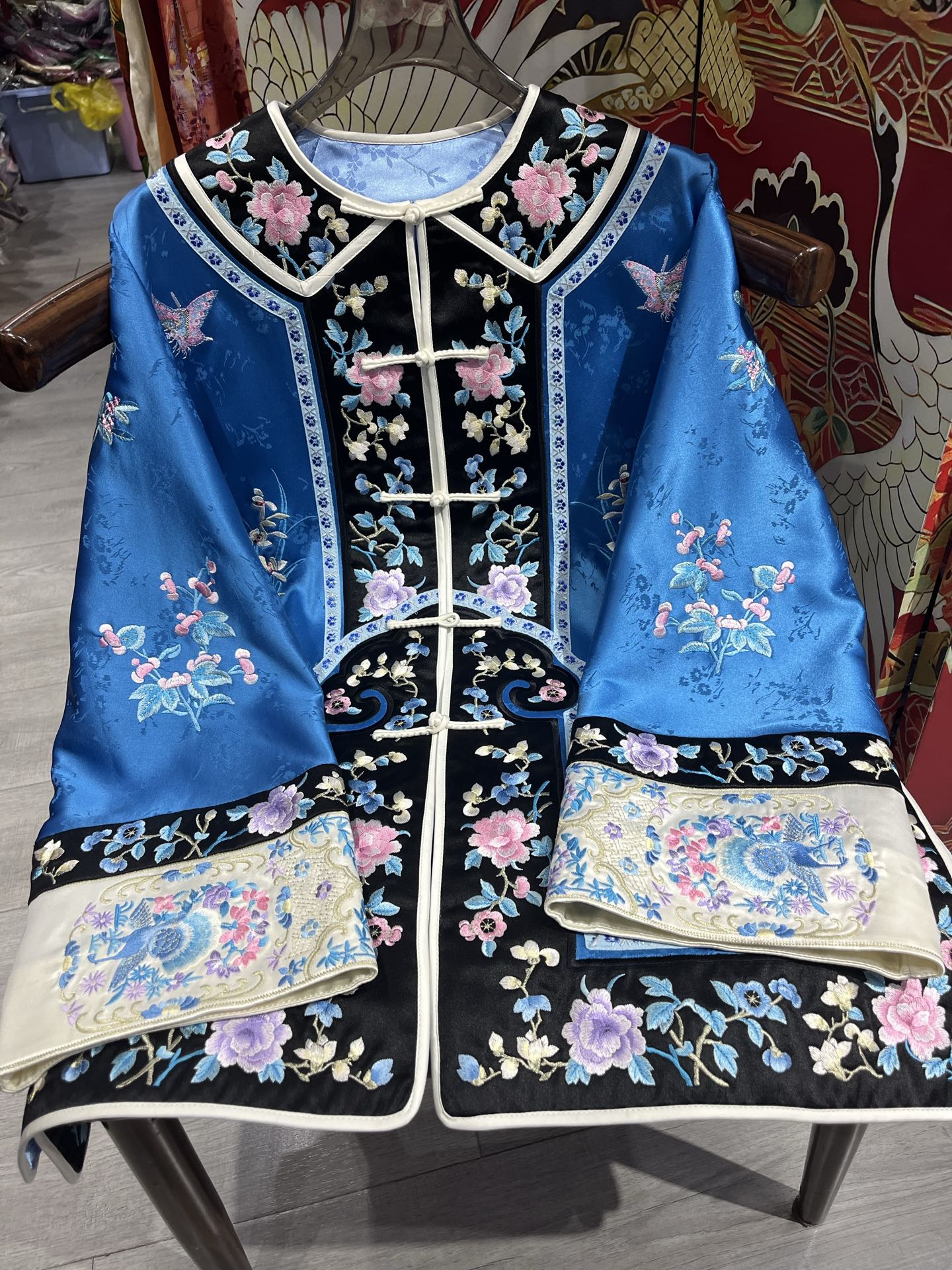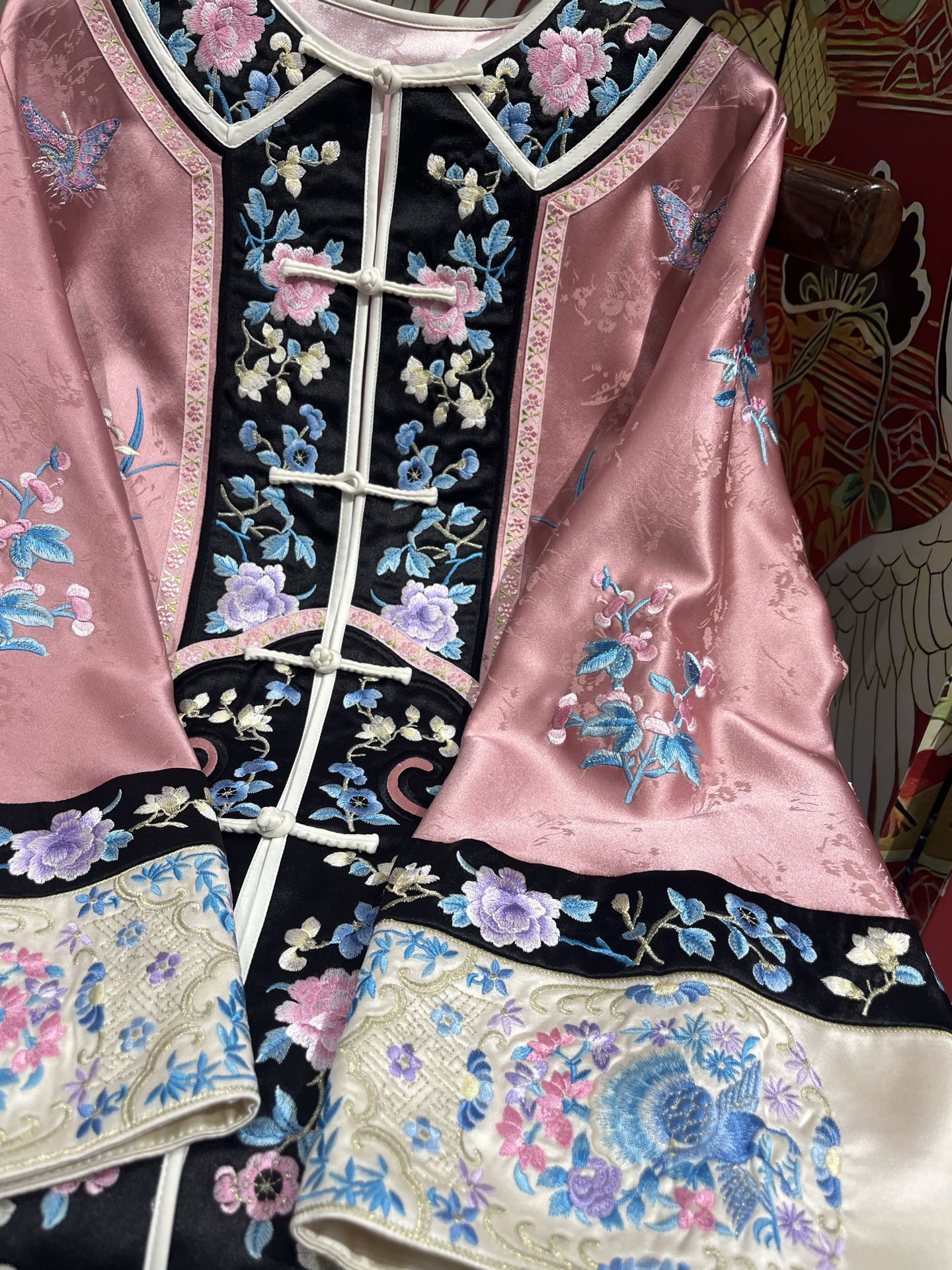 This exquisite jacket blends traditional Chinese aesthetics with modern fashion sensibilities. The design features delicate floral and butterfly embroidery on luxurious acetate jacquard fabric, creating a garment that is both visually stunning and comfortable to wear.