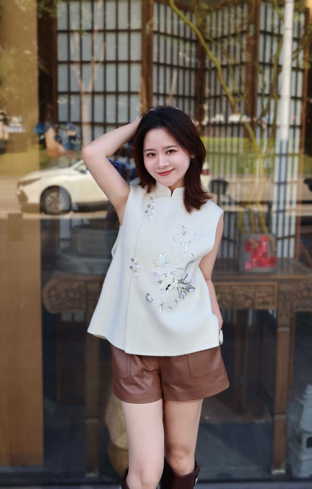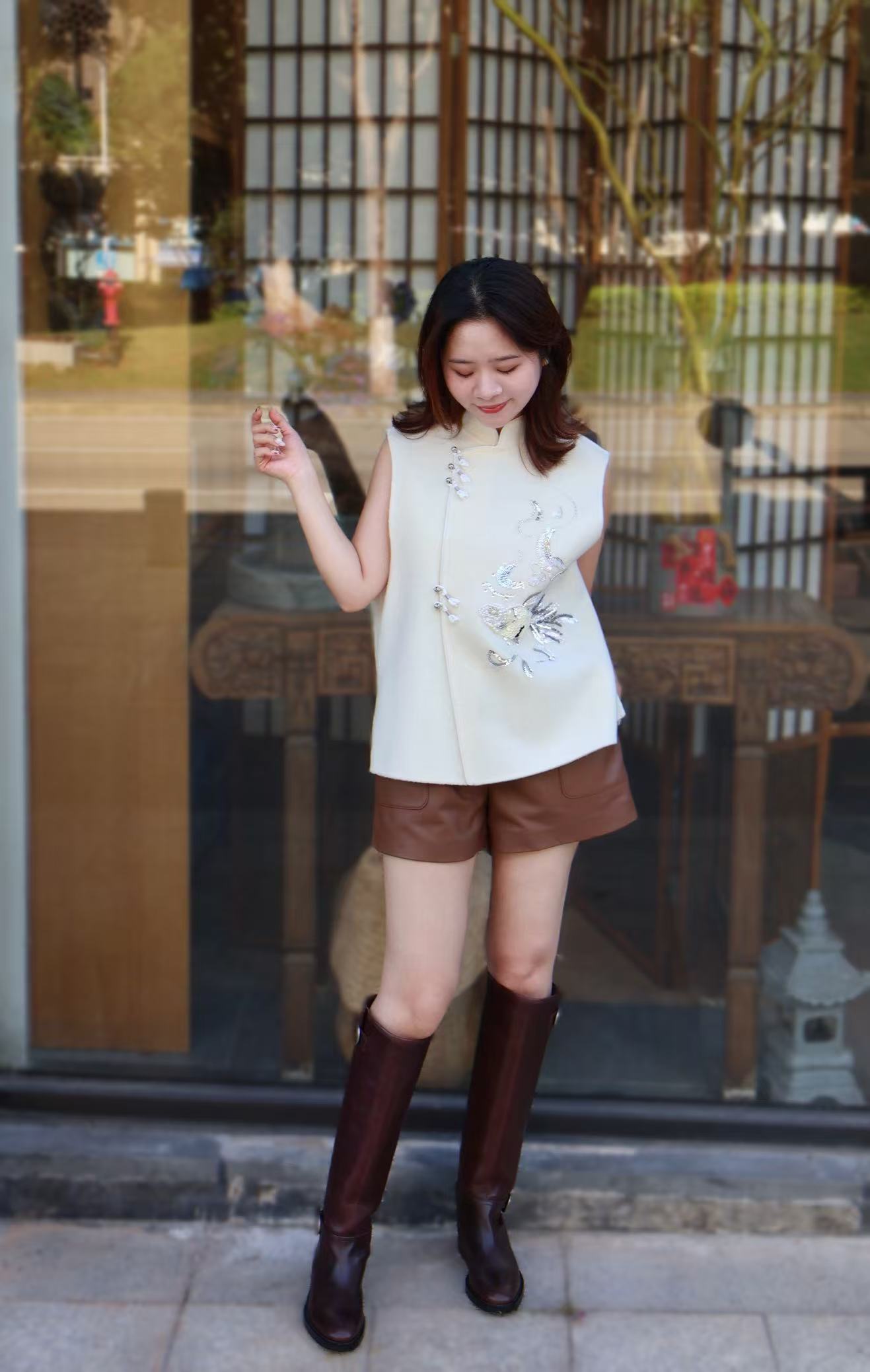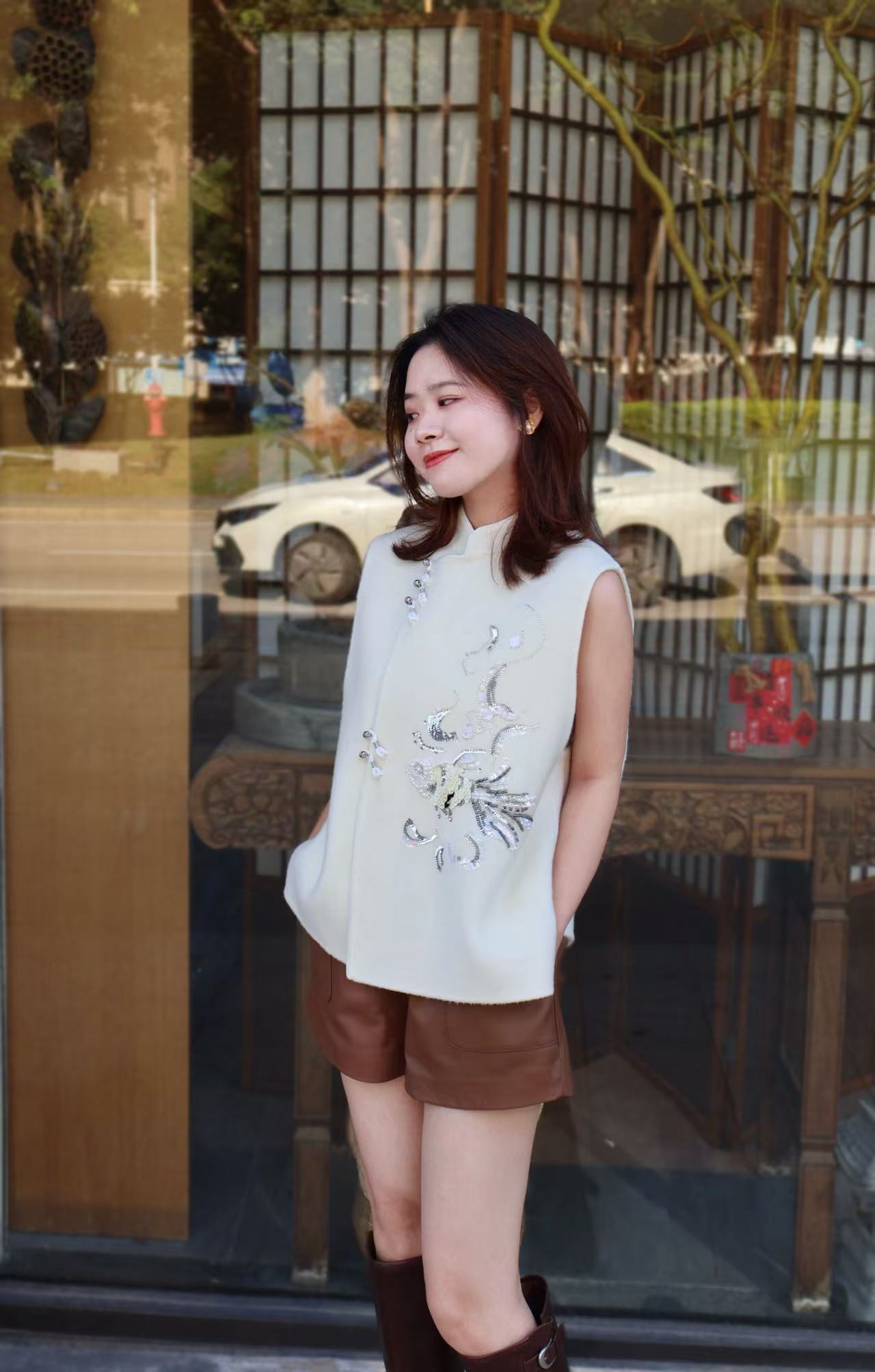 This vest is even more beautiful in person. The quality is excellent, and the design is unique. I love the mandarin collar and the pearl details. It's a perfect addition to my wardrobe.