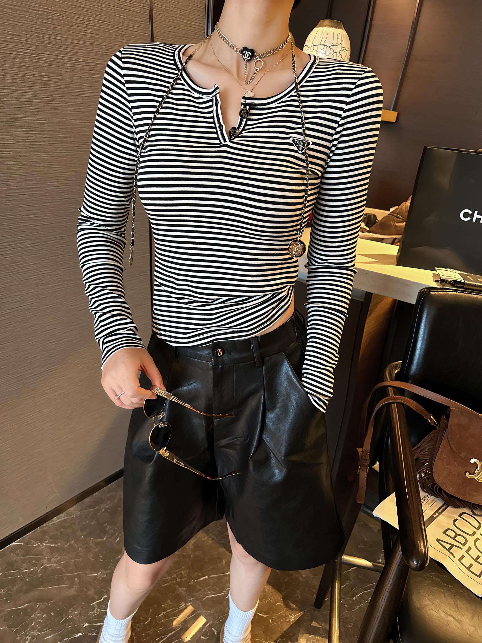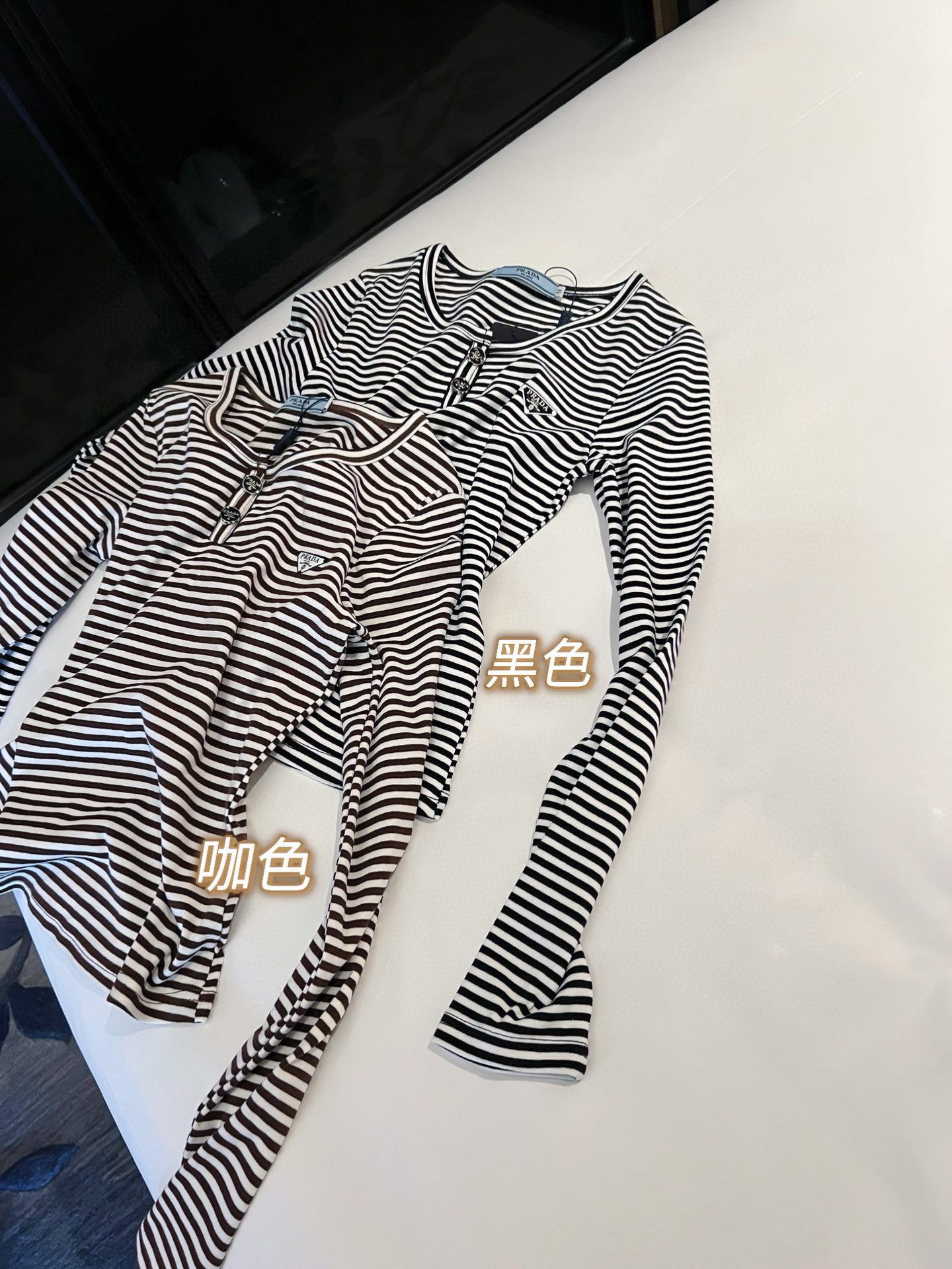 Elevate your style with this Prada striped long-sleeve top, a must-have for stripe lovers. This exquisite top is versatile, chic, and easy to pair with any outfit.