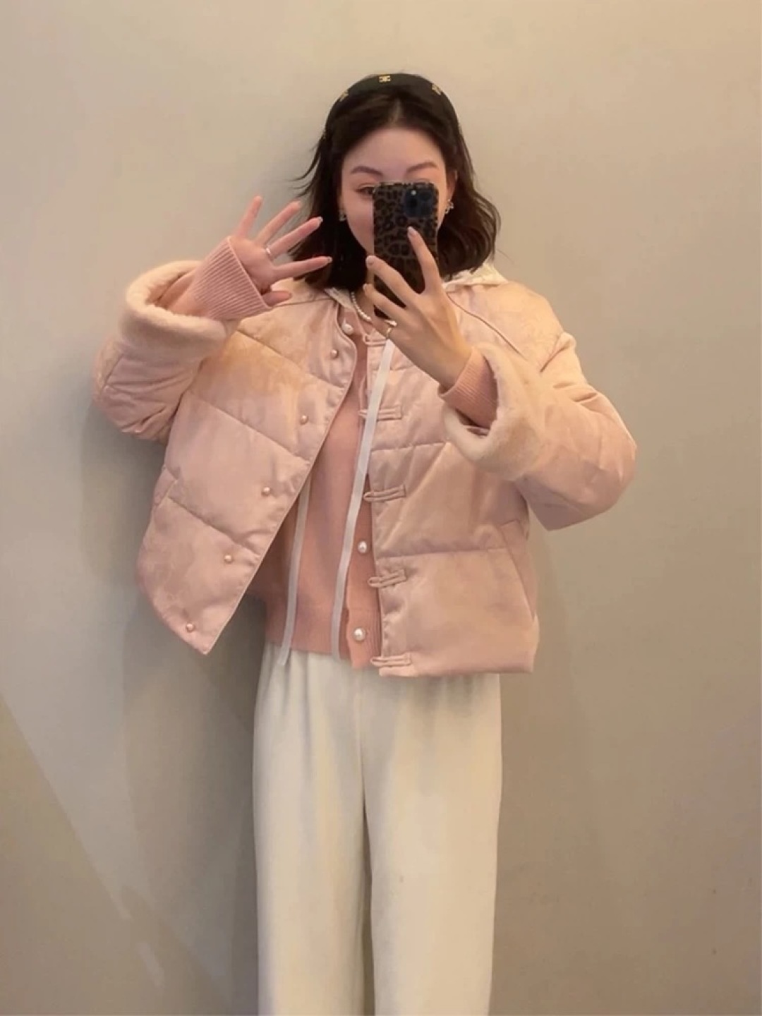 Experience cozy elegance with this quilted jacket. Features a loose fit, mink fur trim, and delicate details. Available in sizes S-XL.