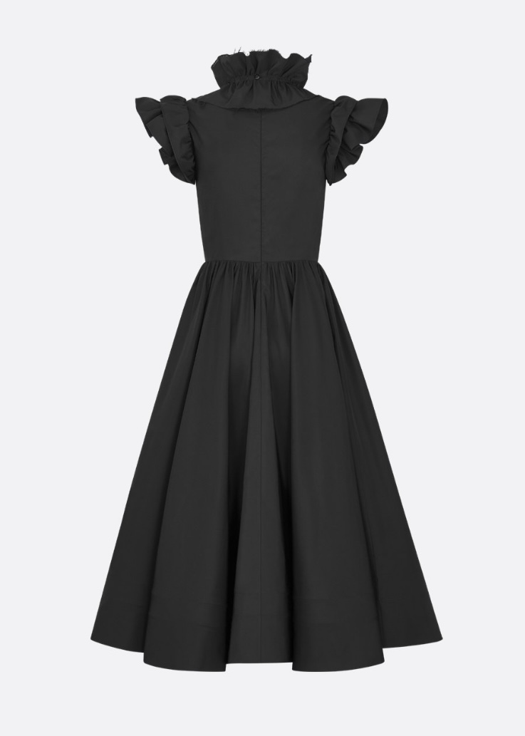 Elevate your wardrobe with this elegant midi dress. Featuring a detachable ruffle collar, ruffle sleeves, and a flowy A-line skirt.