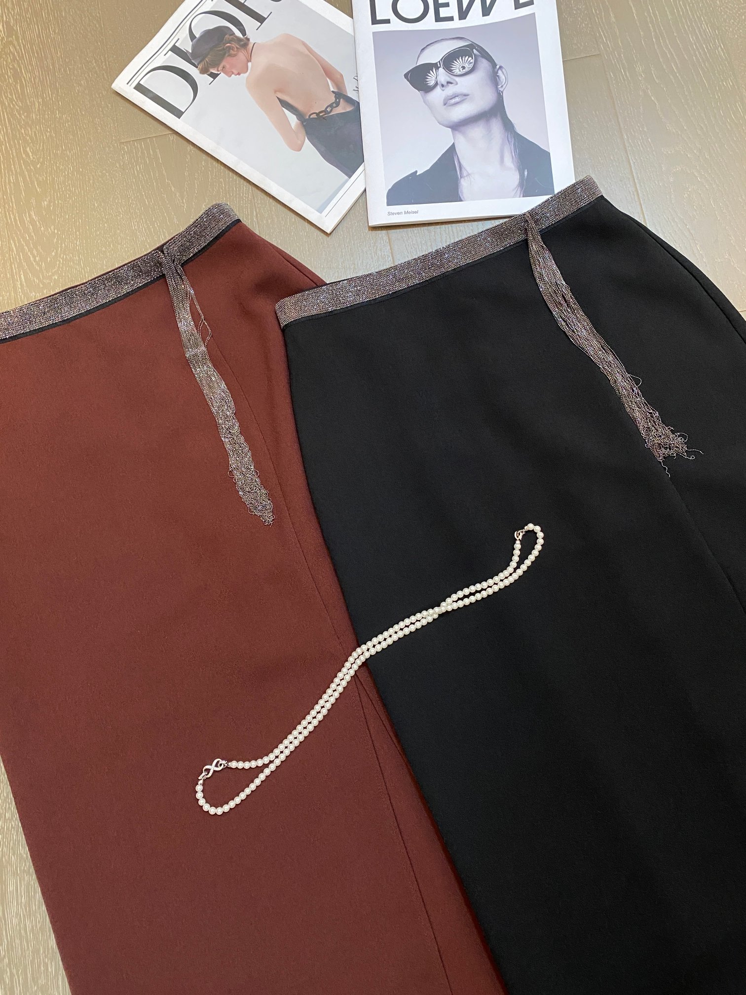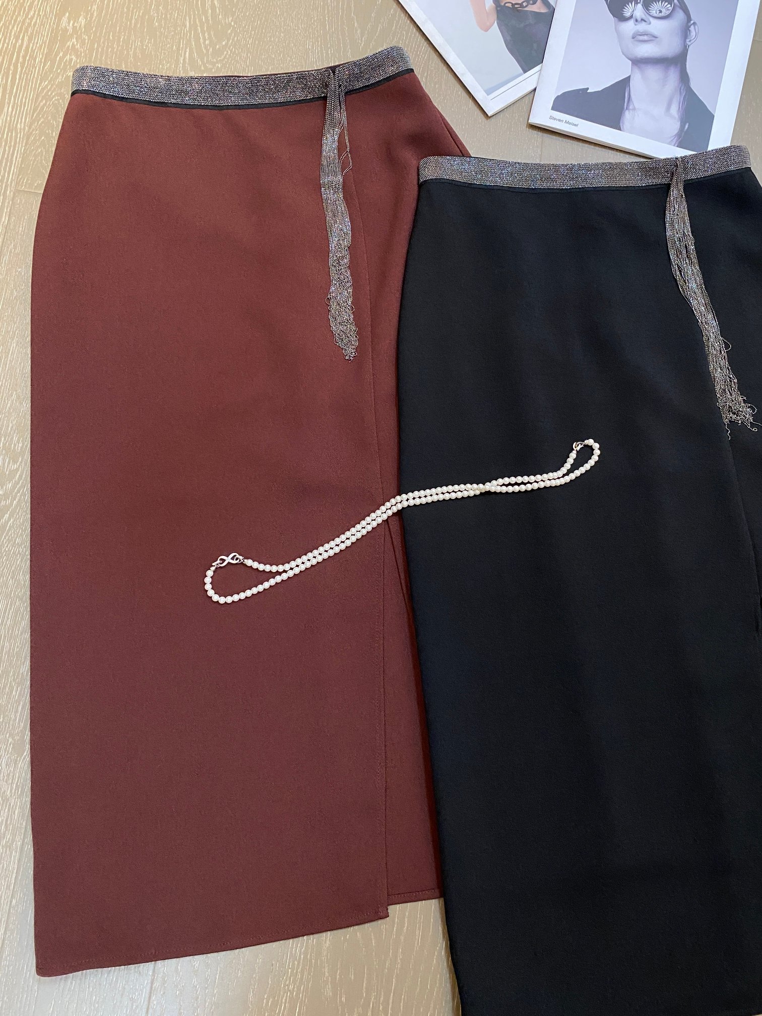 This original design midi skirt features a chic side slit and a stylish beaded tassel belt. Available in coffee brown and black.